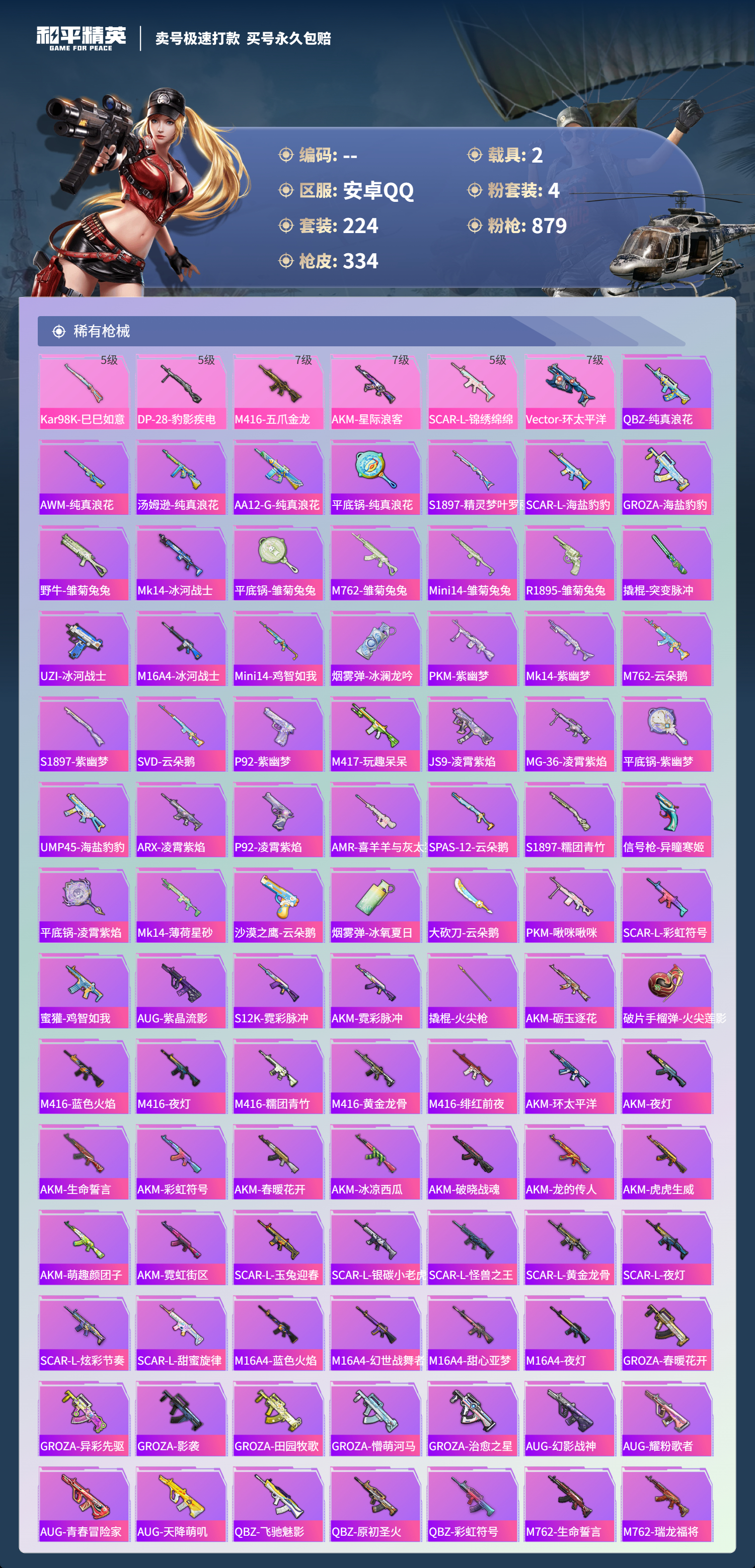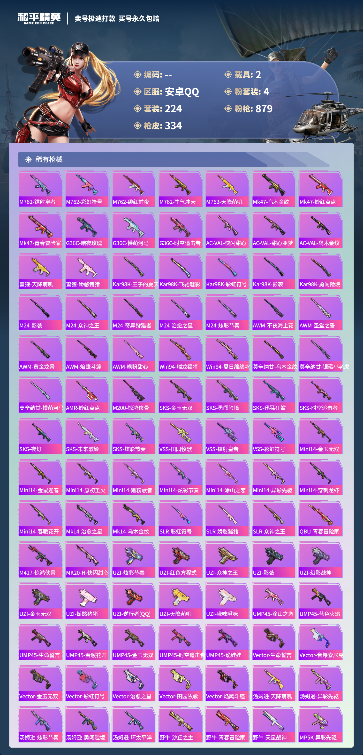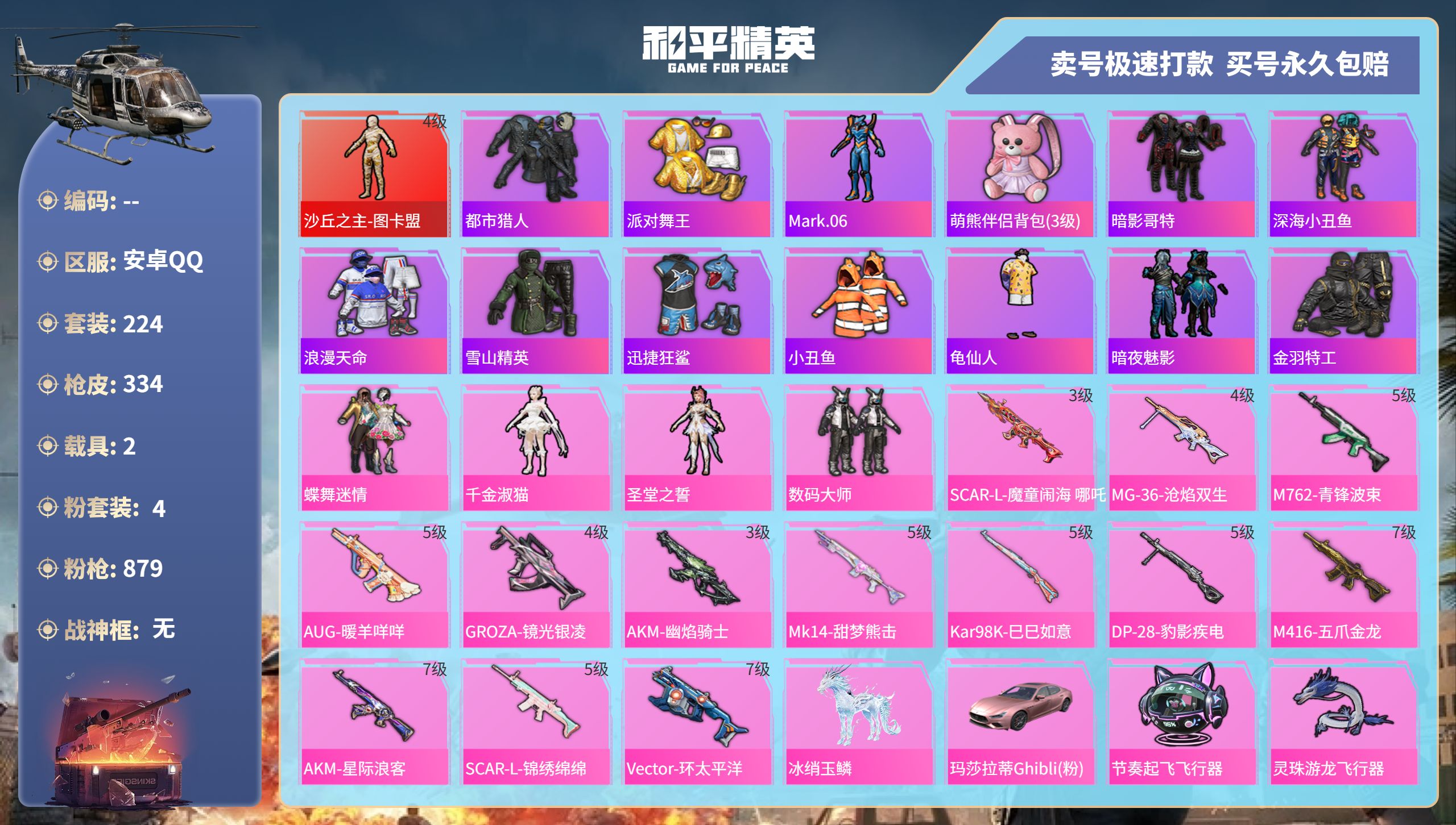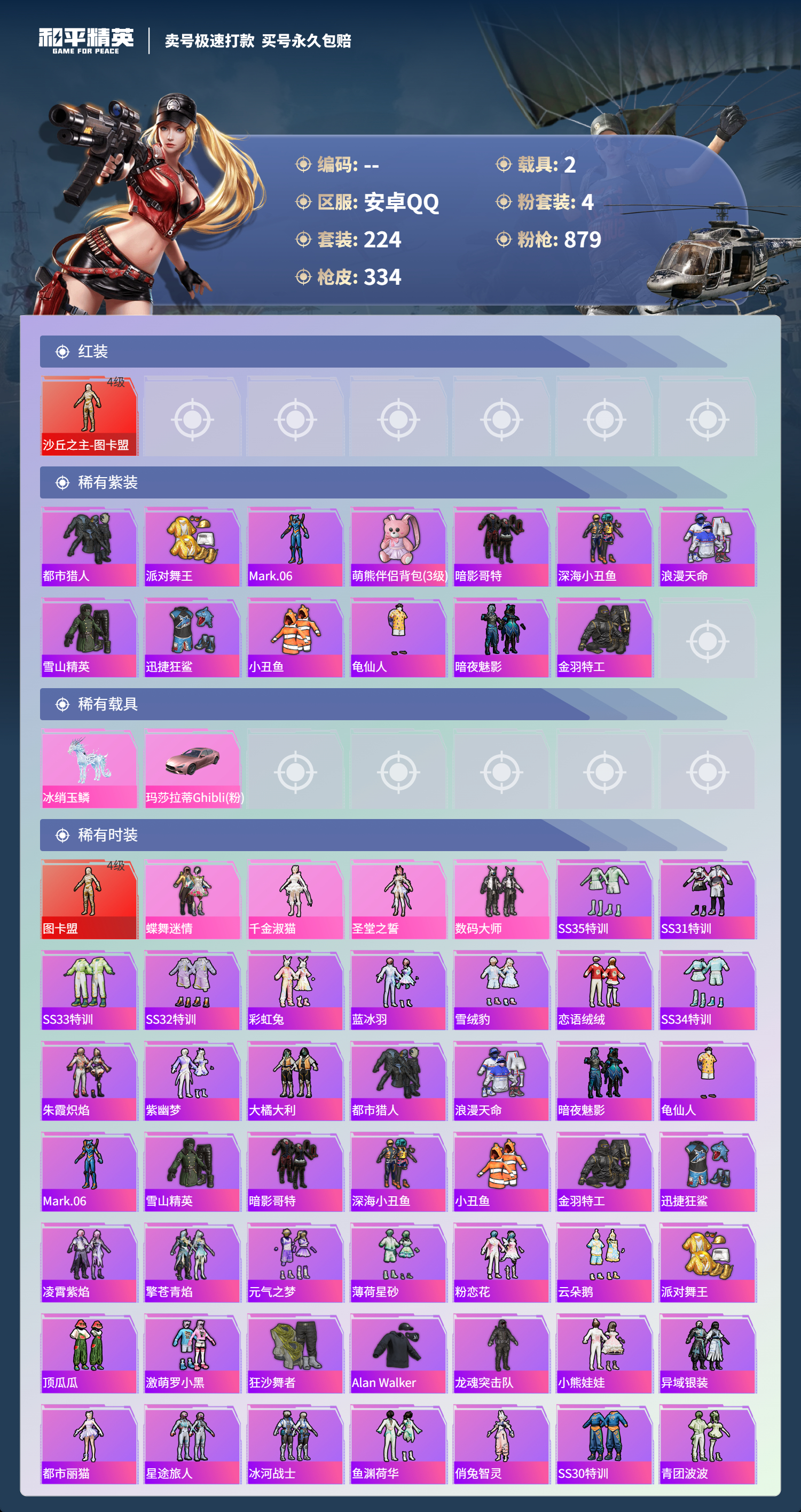 【11069872】【可二次】【安卓QQ】龟仙人 水银刺客 AKM-星际浪客 M762-青锋波束 M416-五爪金龙 漫步者 都市猎人 M24-奇异狩猎者 沙丘之主-图卡盟 深海小丑鱼 瑞龙福将 蝶舞迷情 M416-黄金龙骨 浪漫天命 AWM-黄金龙骨 激萌罗小黑 团圆交子 软萌银虎 迅捷狂鲨 M762-瑞龙福将 Vector-环太平洋 狂沙舞者 春暖花开飞行器 金羽特工 SCAR-L-锦绣绵绵