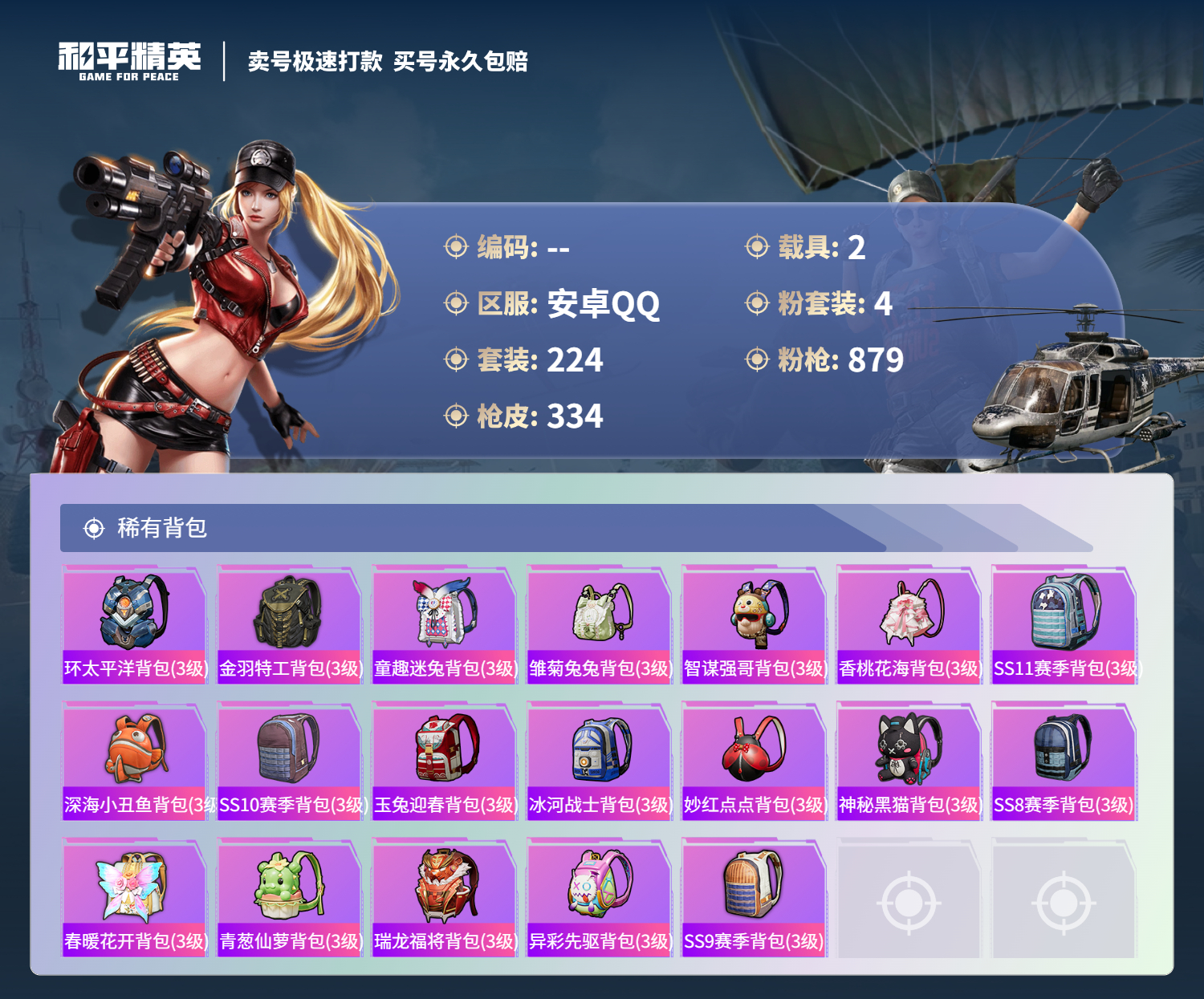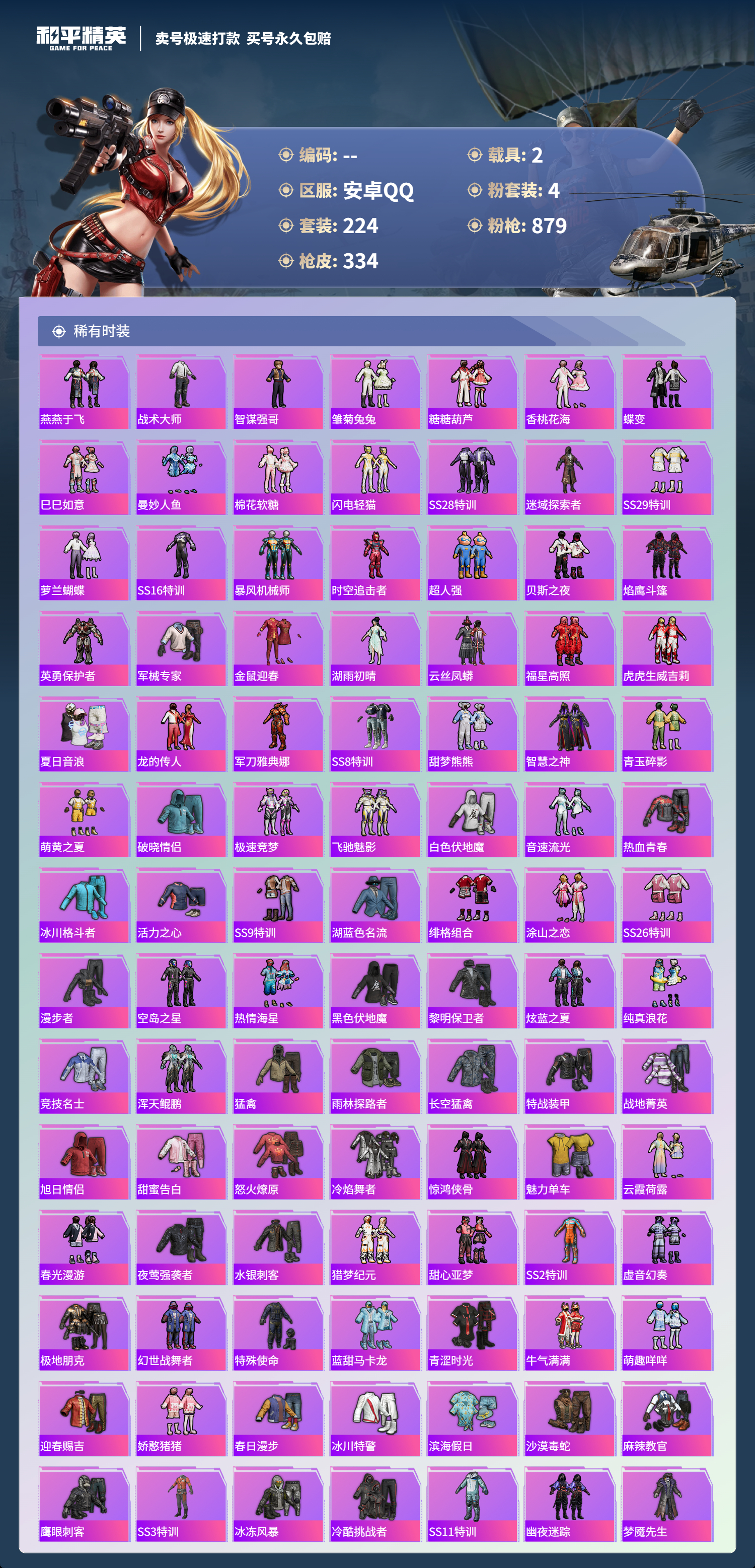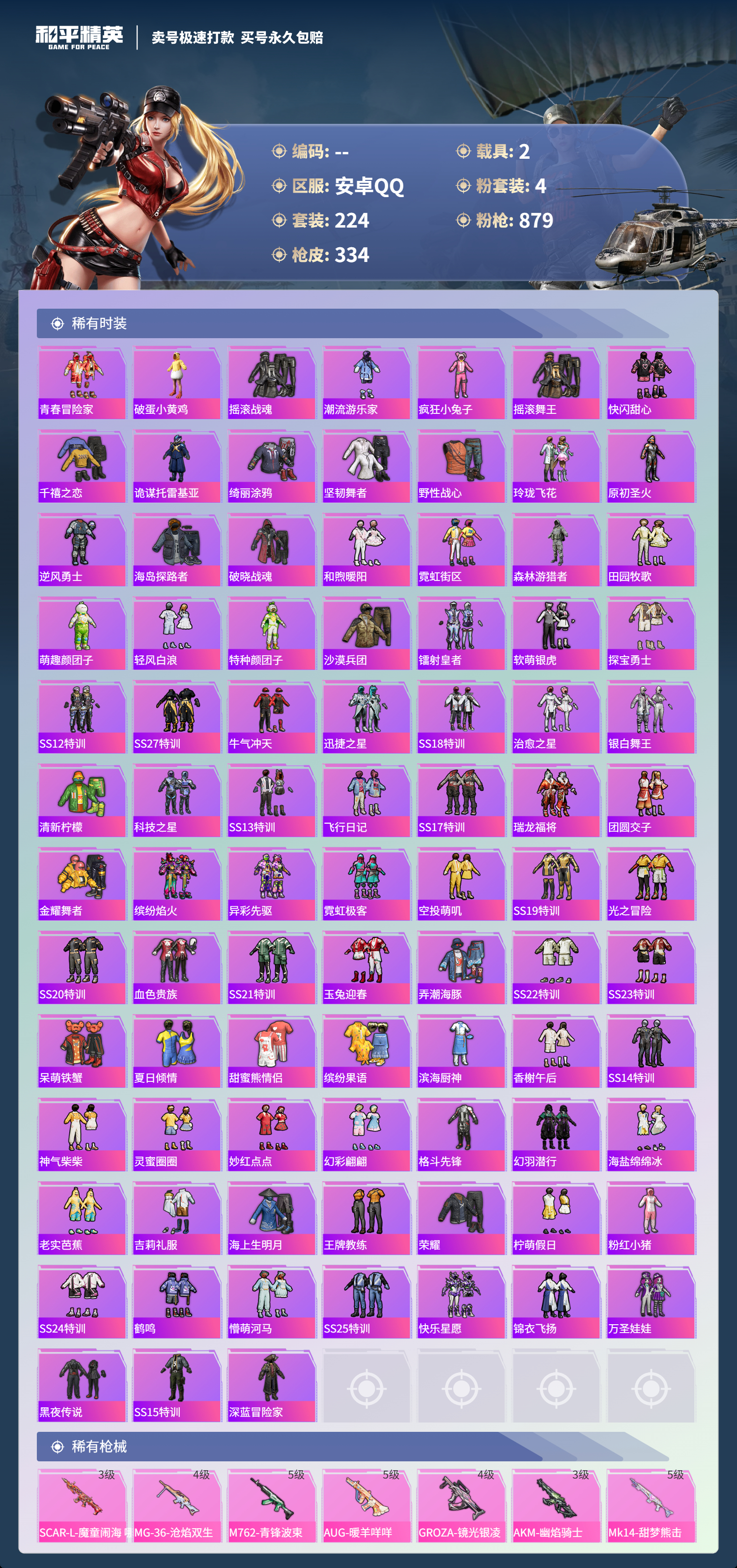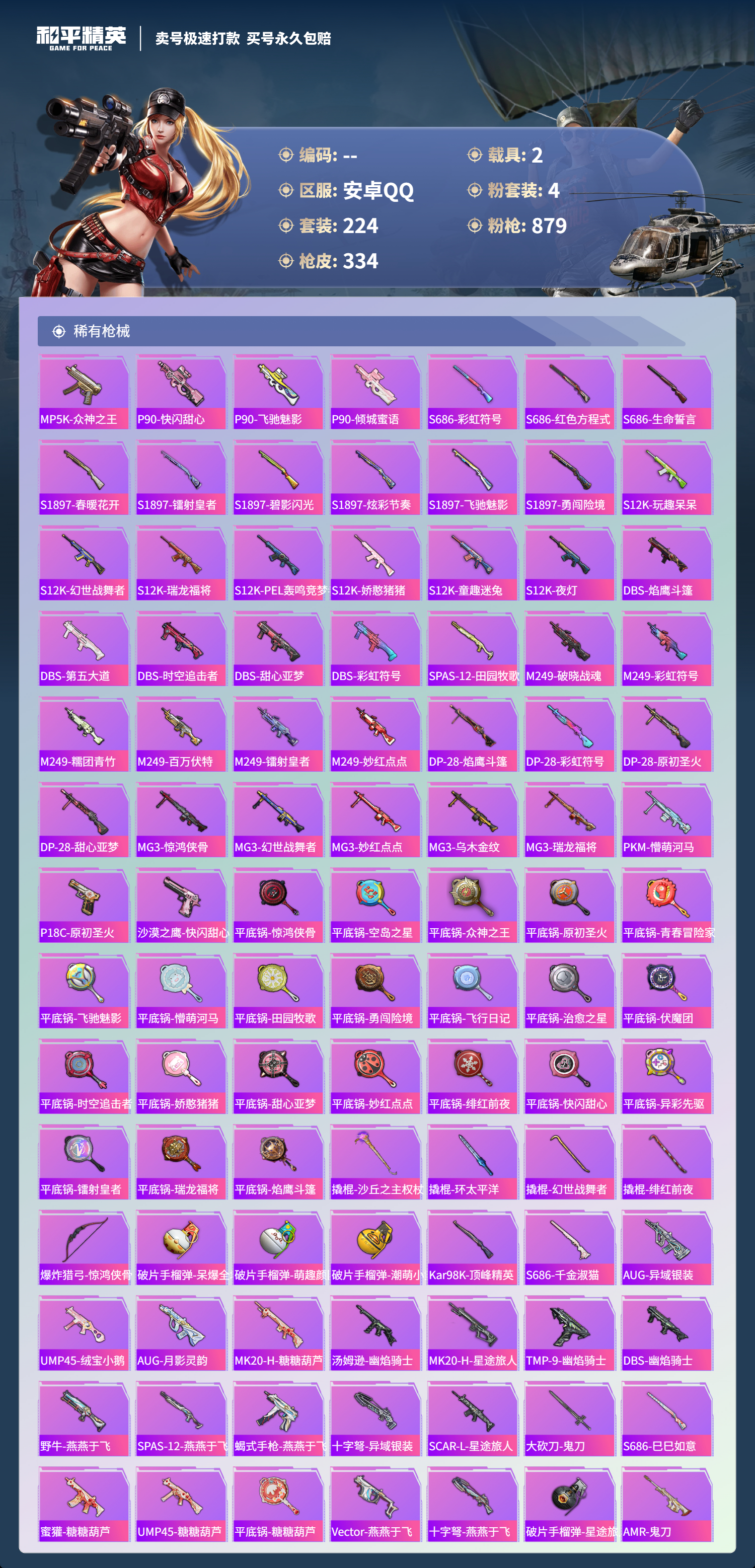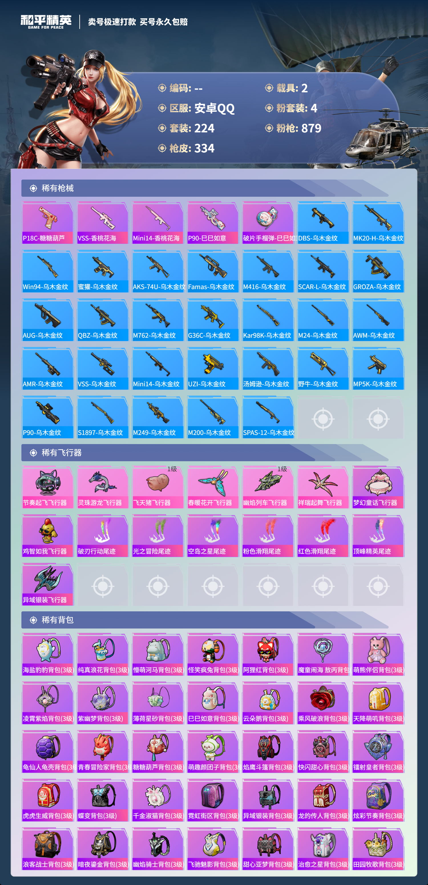 【11069872】【可二次】【安卓QQ】龟仙人 水银刺客 AKM-星际浪客 M762-青锋波束 M416-五爪金龙 漫步者 都市猎人 M24-奇异狩猎者 沙丘之主-图卡盟 深海小丑鱼 瑞龙福将 蝶舞迷情 M416-黄金龙骨 浪漫天命 AWM-黄金龙骨 激萌罗小黑 团圆交子 软萌银虎 迅捷狂鲨 M762-瑞龙福将 Vector-环太平洋 狂沙舞者 春暖花开飞行器 金羽特工 SCAR-L-锦绣绵绵