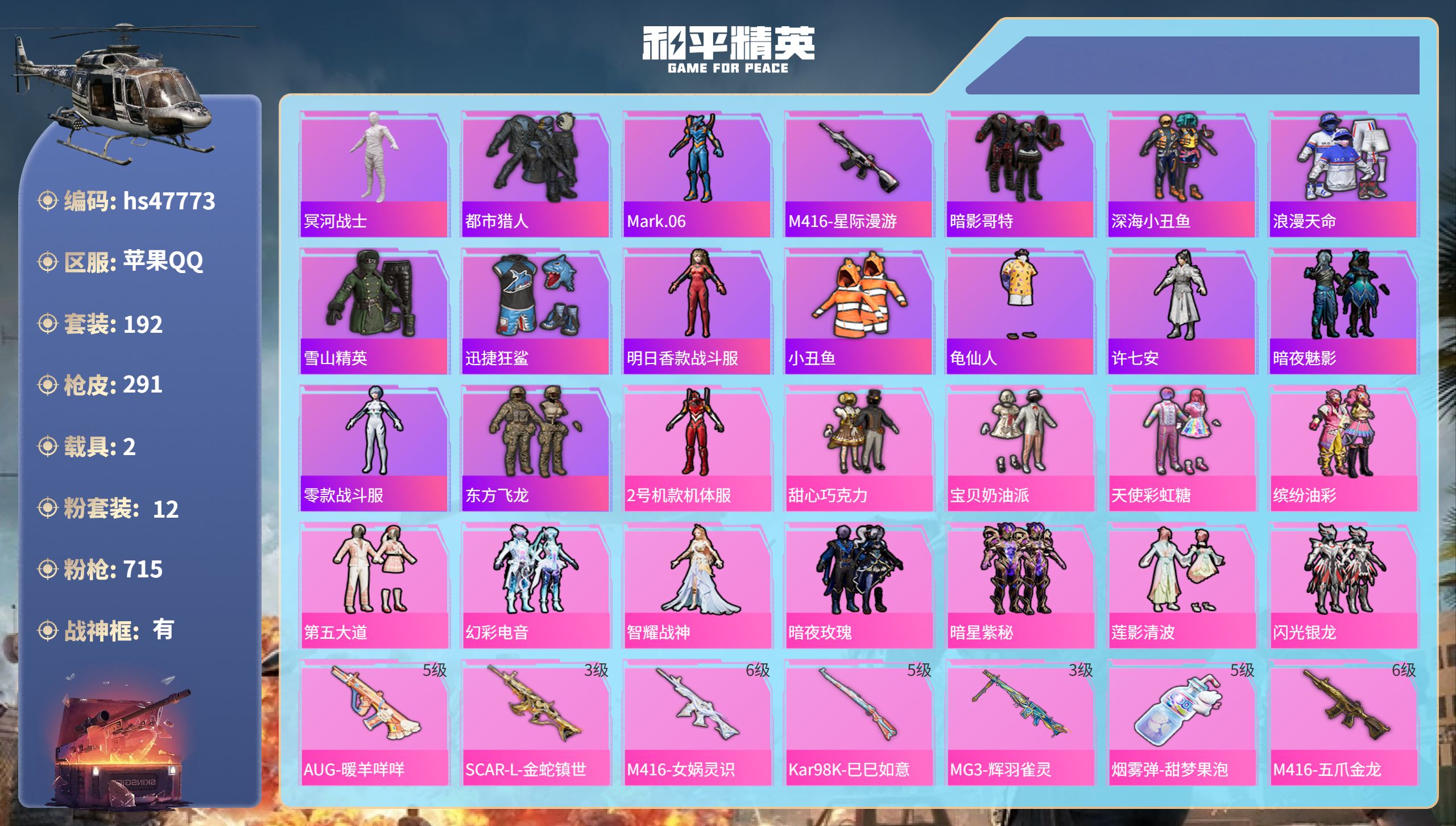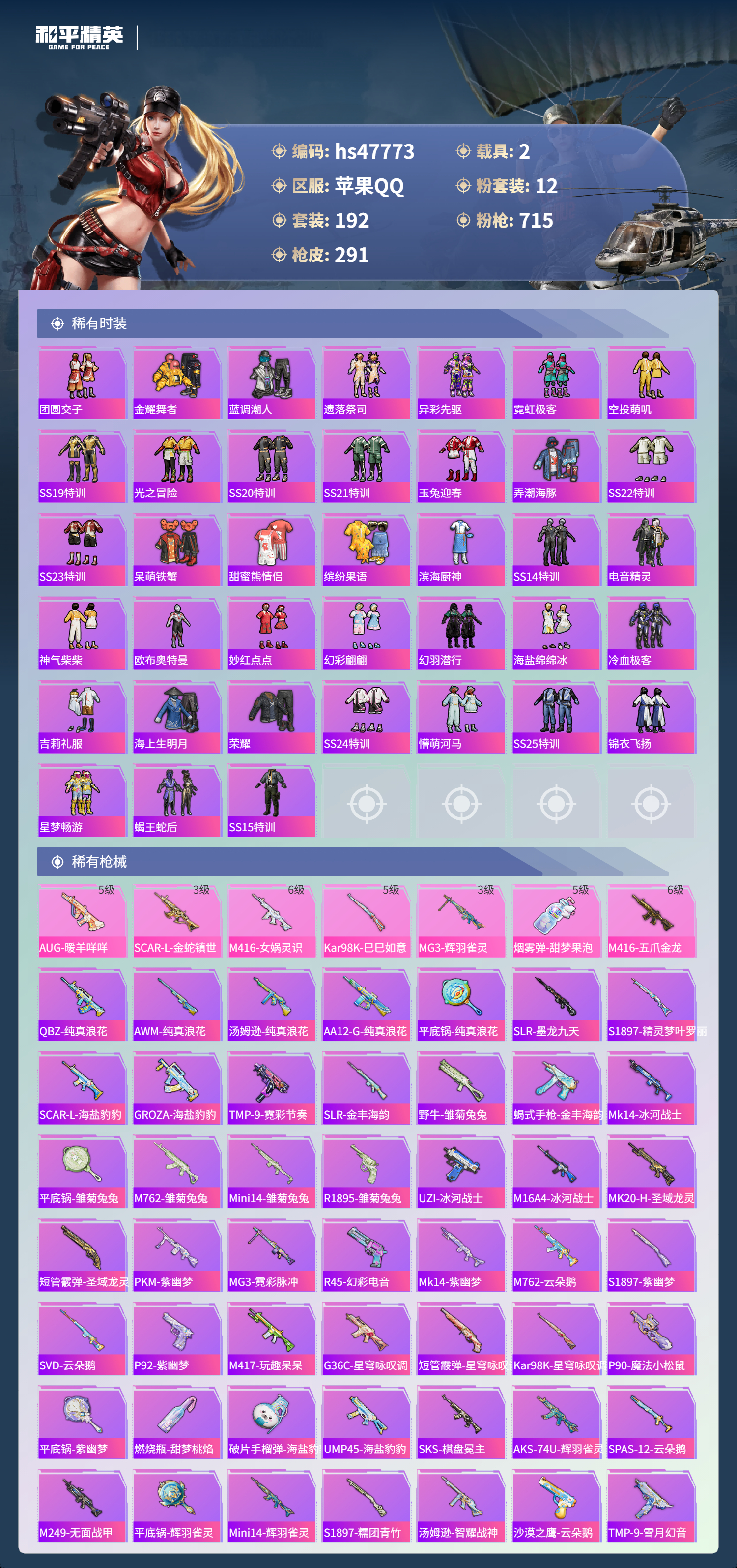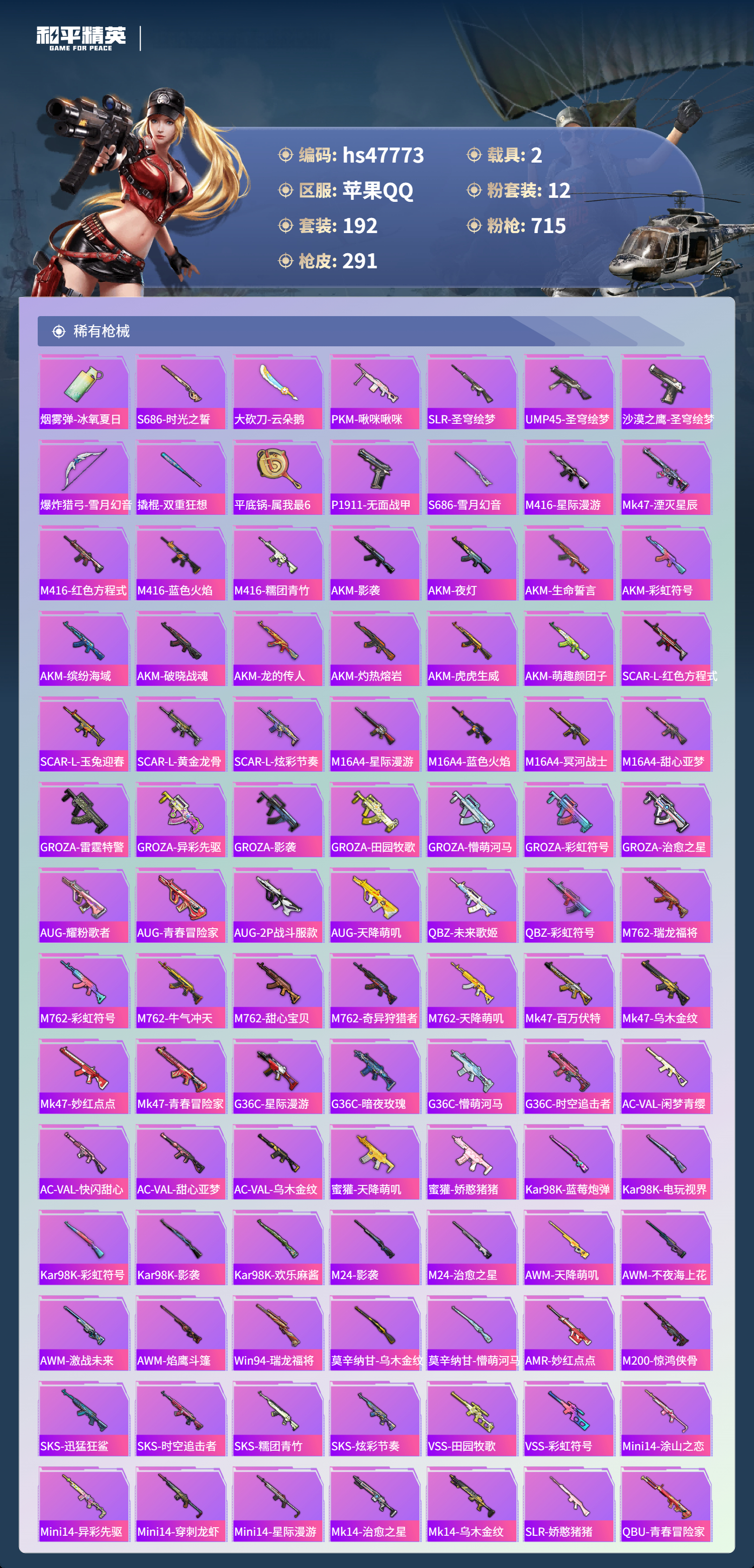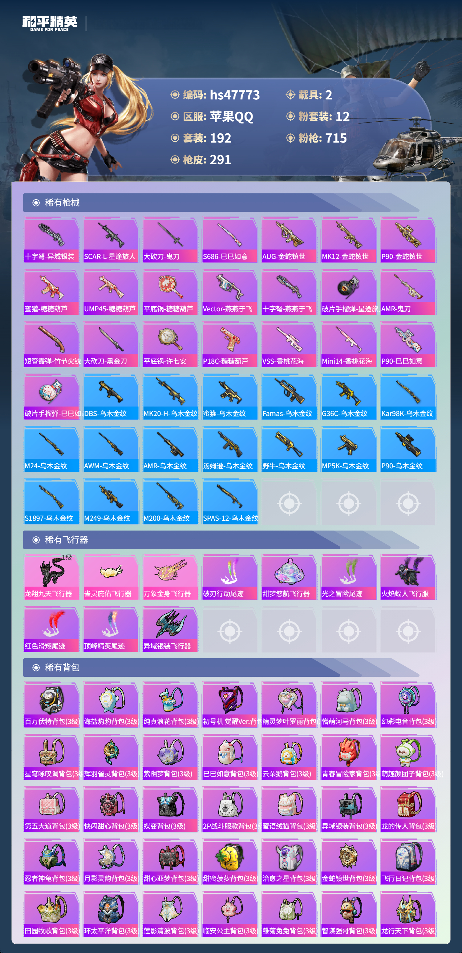 【11070247】【可二次】【苹果QQ】龟仙人 木乃伊 暗星紫秘 M416-五爪金龙 漫步者 M416-星际漫游 都市猎人 东方飞龙 M762-奇异狩猎者 缤纷油彩 深海小丑鱼 瑞龙福将 AWM-激战未来 浪漫天命 梦之呓语 狮王雄心 团圆交子 迅捷狂鲨 M762-瑞龙福将 甜心巧克力 狂沙舞者 龙翔九天飞行器 暗夜玫瑰 AKM-缤纷海域 天使彩虹糖 宝贝奶油派 红螳螂 暗影哥特 雪山精英