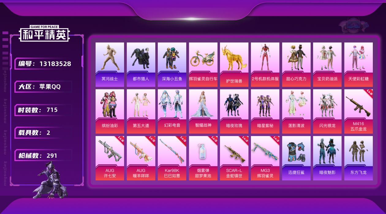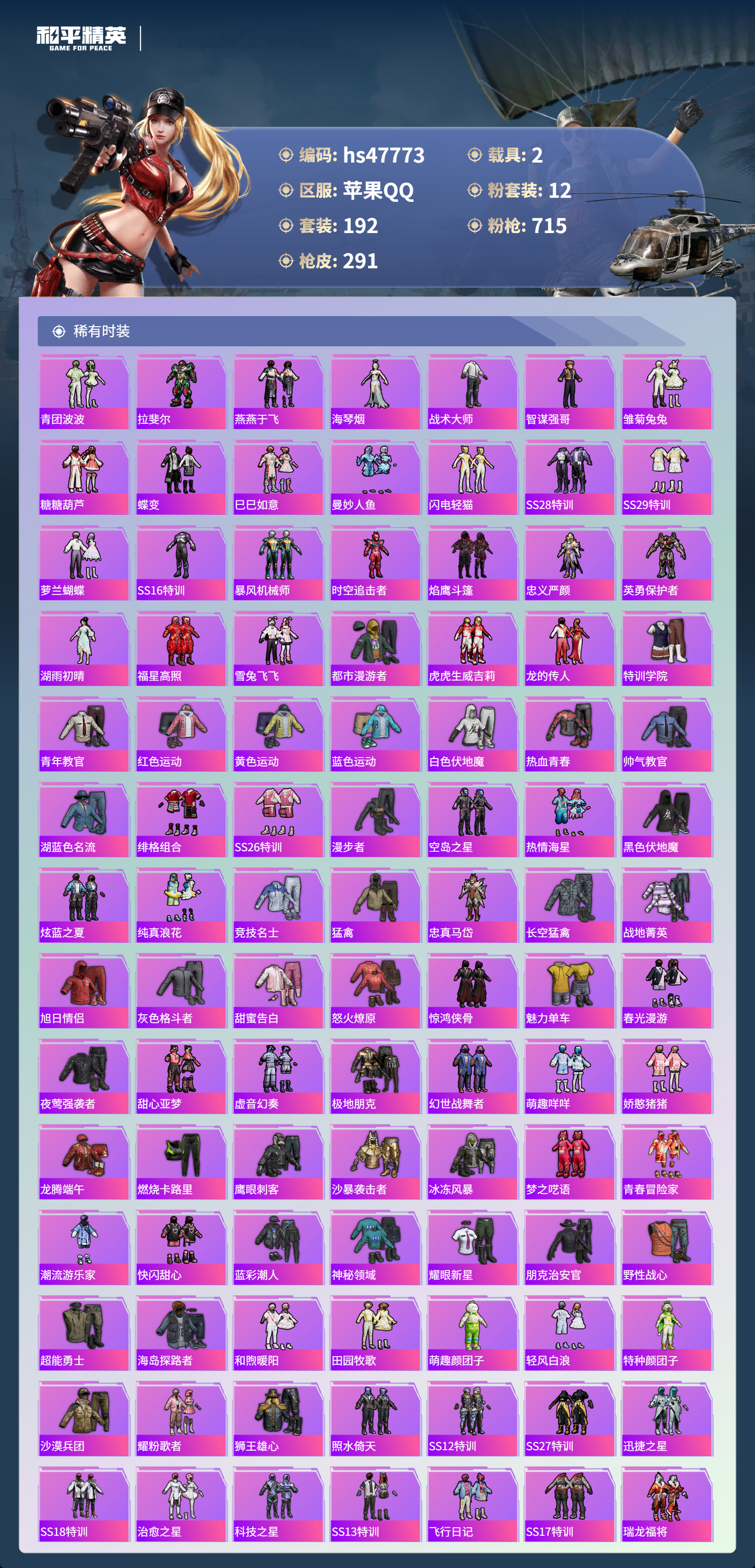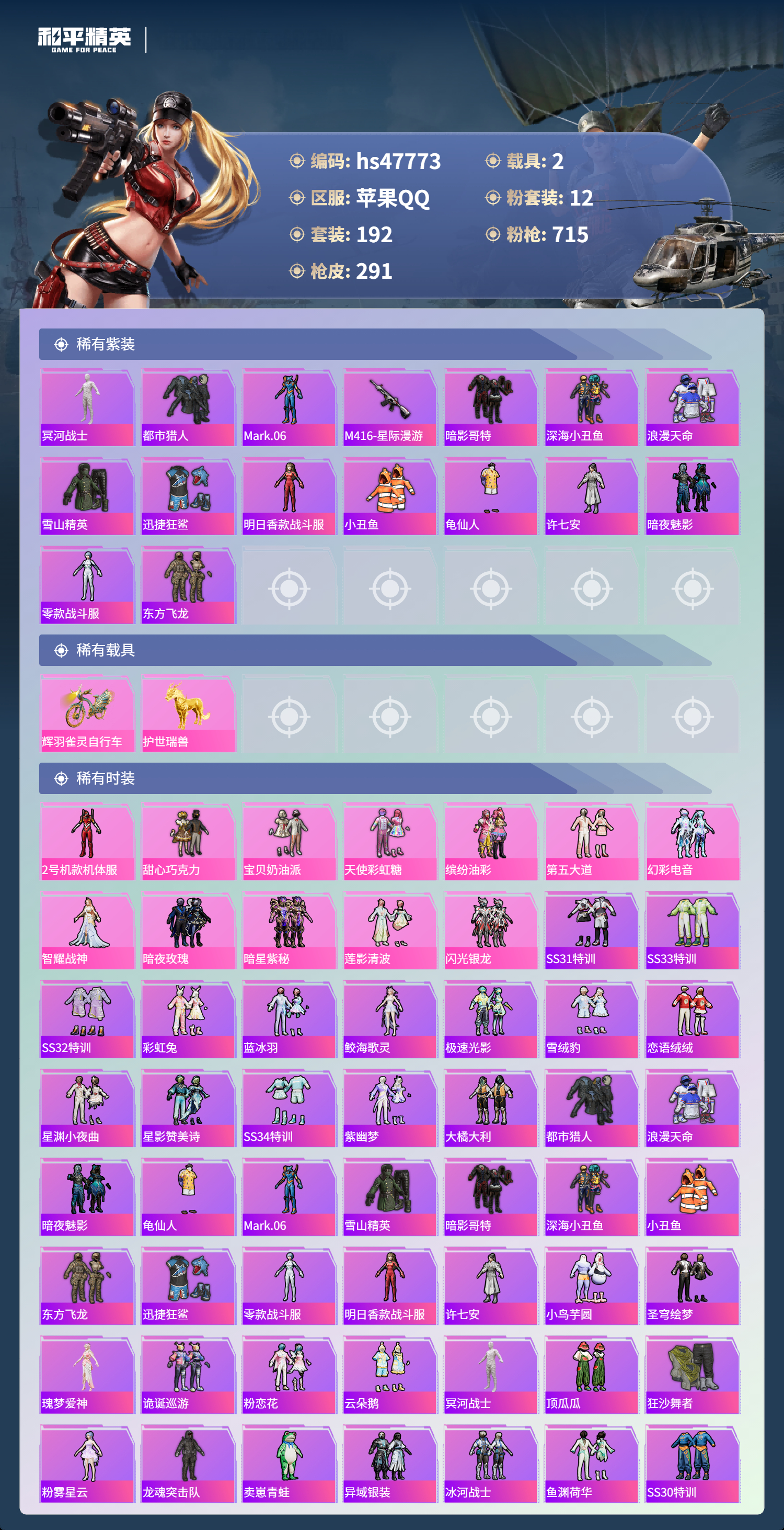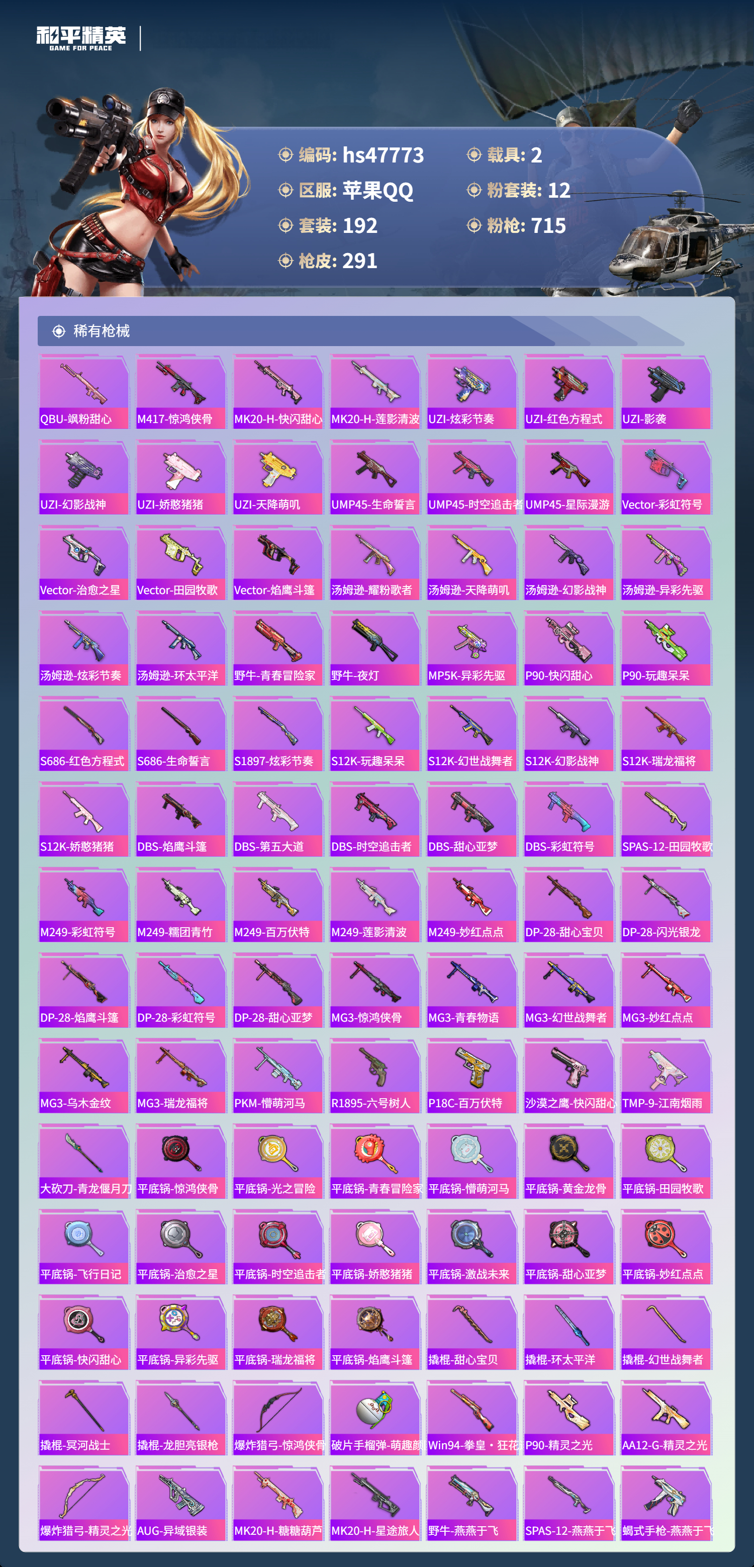 【11070247】【可二次】【苹果QQ】龟仙人 木乃伊 暗星紫秘 M416-五爪金龙 漫步者 M416-星际漫游 都市猎人 东方飞龙 M762-奇异狩猎者 缤纷油彩 深海小丑鱼 瑞龙福将 AWM-激战未来 浪漫天命 梦之呓语 狮王雄心 团圆交子 迅捷狂鲨 M762-瑞龙福将 甜心巧克力 狂沙舞者 龙翔九天飞行器 暗夜玫瑰 AKM-缤纷海域 天使彩虹糖 宝贝奶油派 红螳螂 暗影哥特 雪山精英