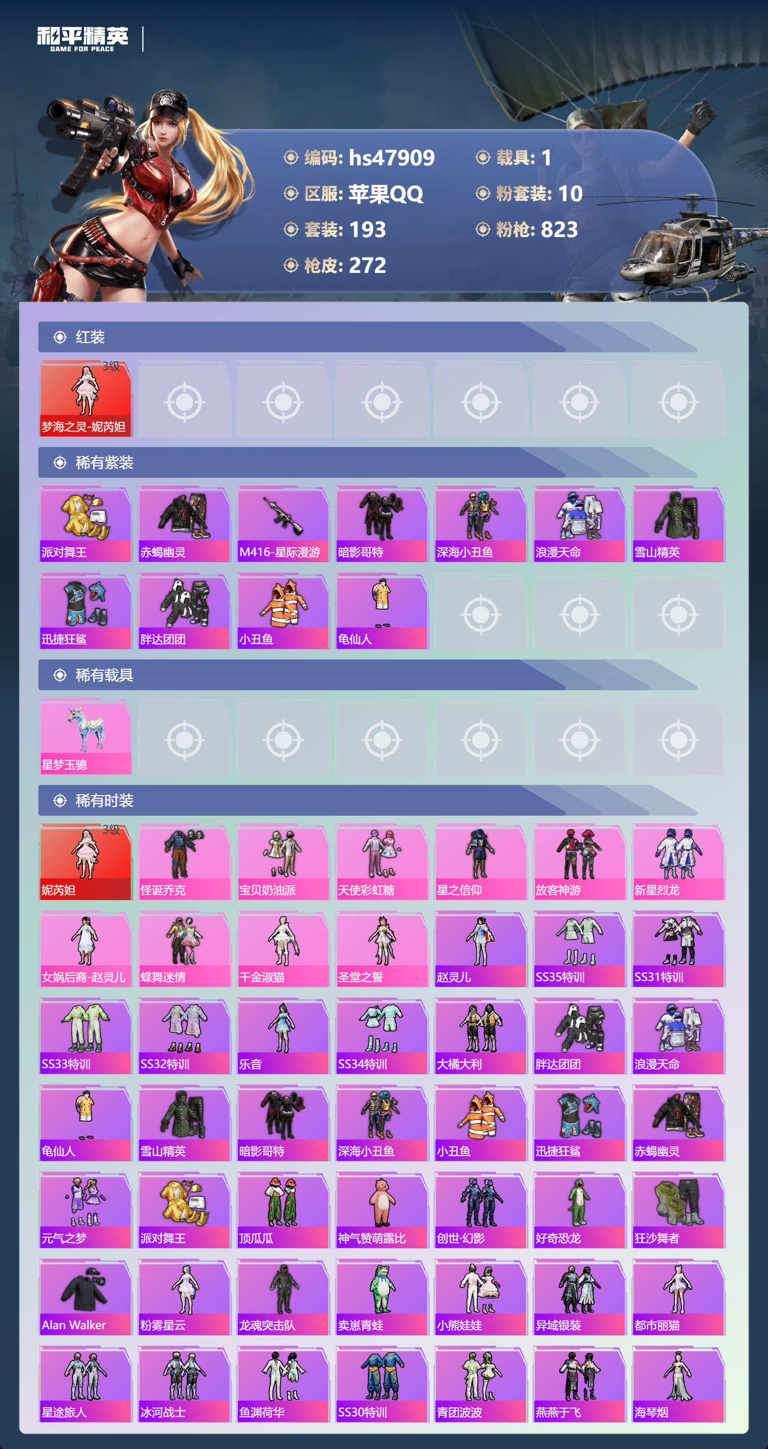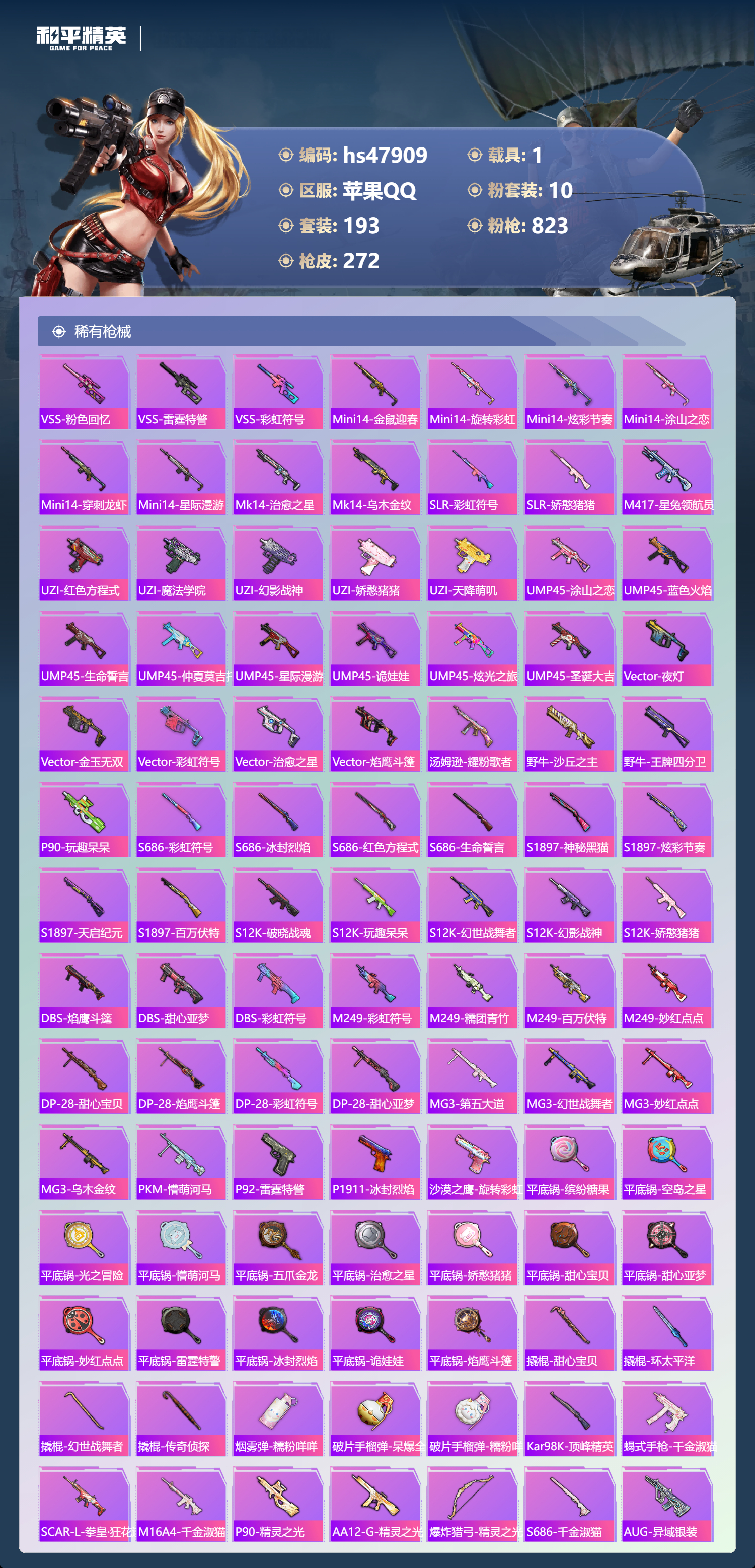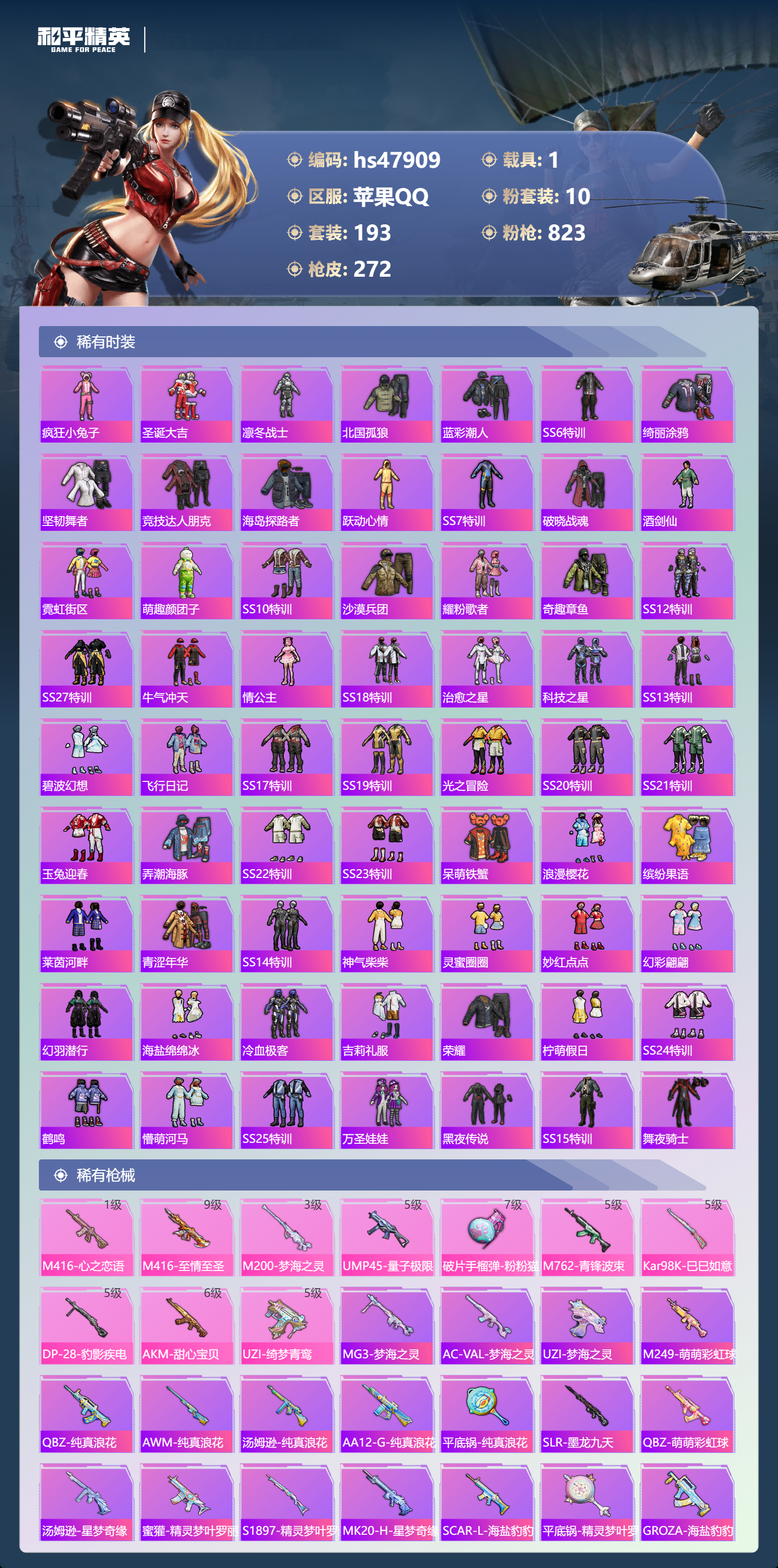 【11070447】【可二次】【苹果QQ】龟仙人 UZI-绮梦青鸾 M762-青锋波束 M416-星际漫游 新星烈龙 极速红龙 赤蝎幽灵 放客神游 M416-至情至圣 UMP45-量子极限 M416-心之恋语 深海小丑鱼 M24-香水柠檬 蝶舞迷情 浪漫天命 AKM-甜心宝贝 胖达团团 星之信仰 破片手榴弹-粉粉猫爪 红熊茄茄 星梦玉骢 怪诞乔克 迅捷狂鲨 梦海之灵-妮芮妲 狂沙舞者 幻海精灵飞