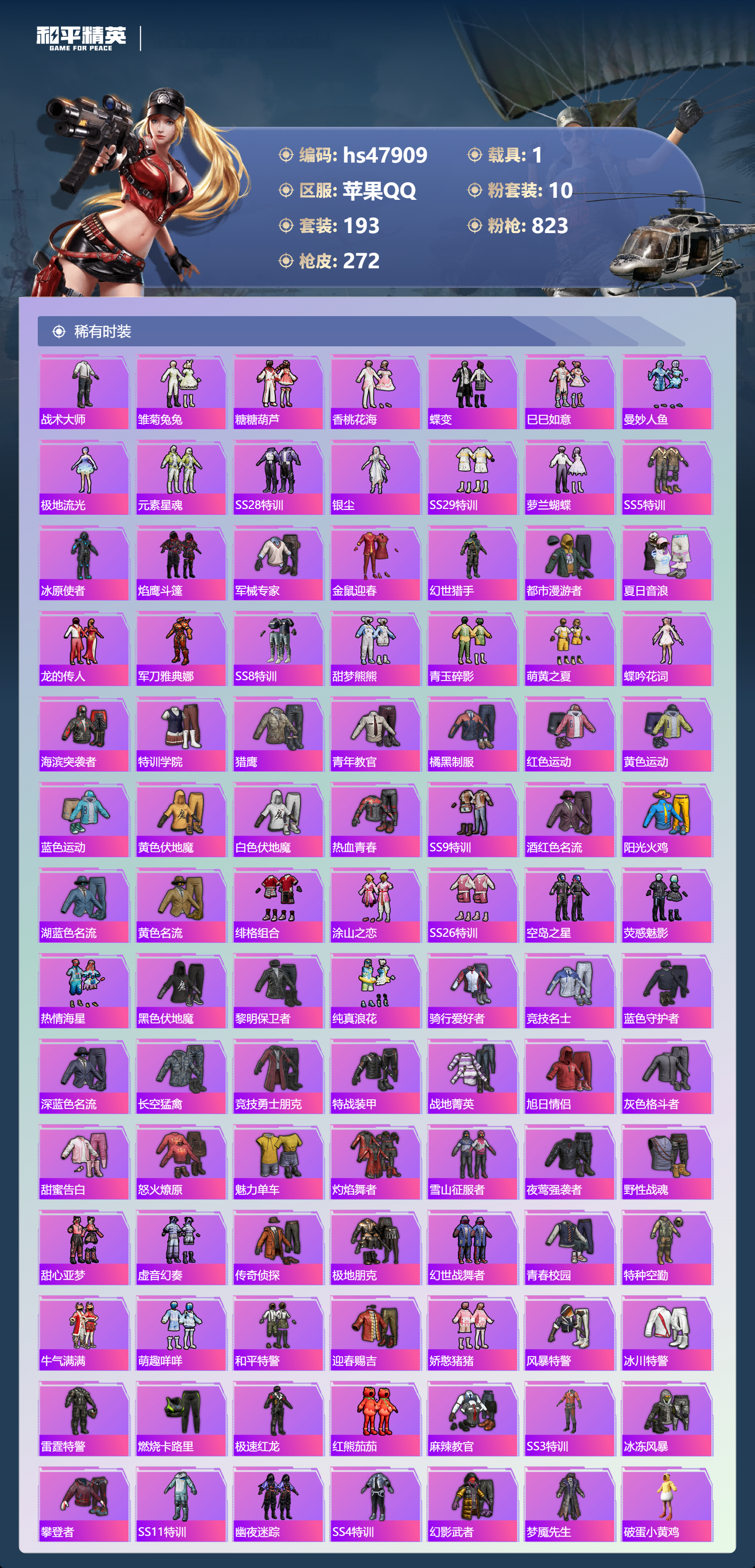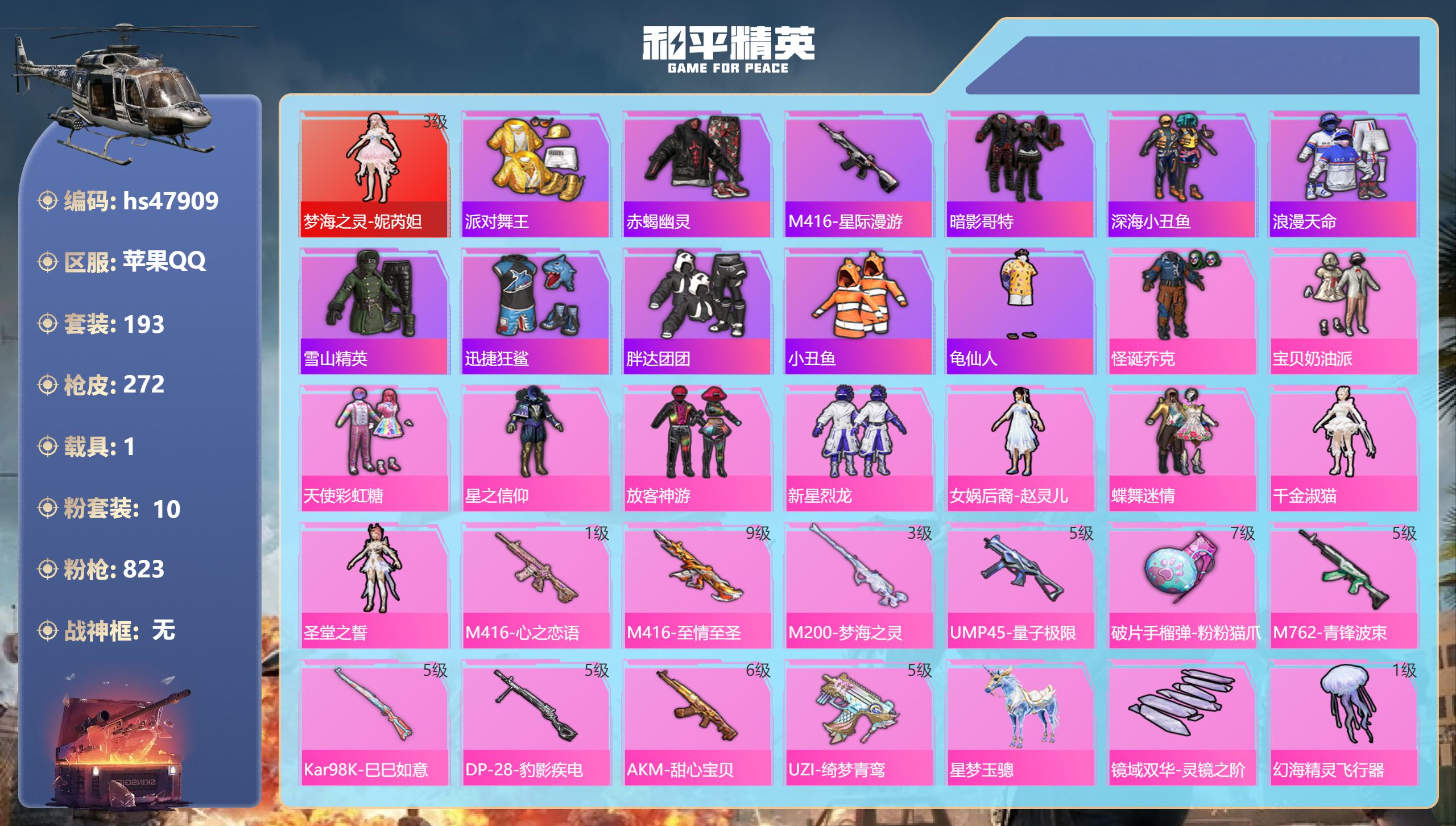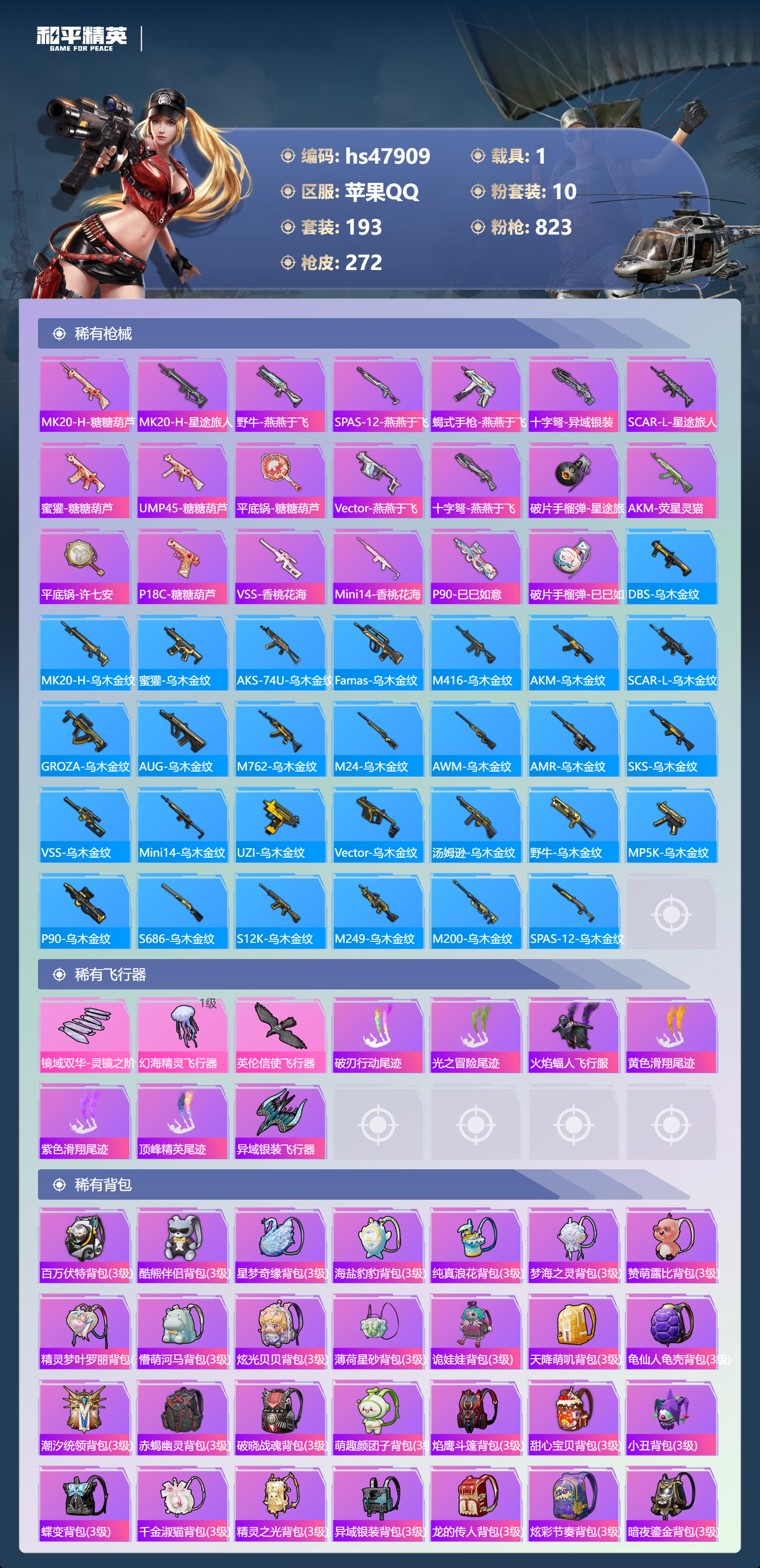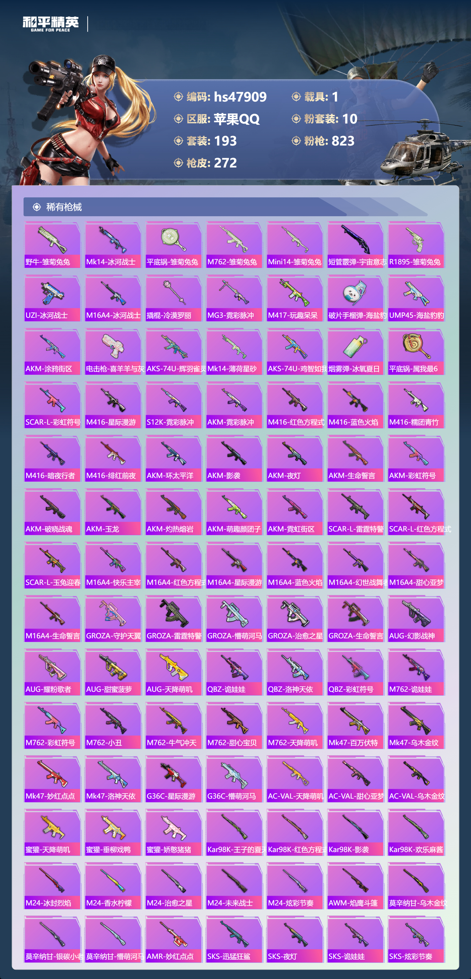 【11070447】【可二次】【苹果QQ】龟仙人 UZI-绮梦青鸾 M762-青锋波束 M416-星际漫游 新星烈龙 极速红龙 赤蝎幽灵 放客神游 M416-至情至圣 UMP45-量子极限 M416-心之恋语 深海小丑鱼 M24-香水柠檬 蝶舞迷情 浪漫天命 AKM-甜心宝贝 胖达团团 星之信仰 破片手榴弹-粉粉猫爪 红熊茄茄 星梦玉骢 怪诞乔克 迅捷狂鲨 梦海之灵-妮芮妲 狂沙舞者 幻海精灵飞
