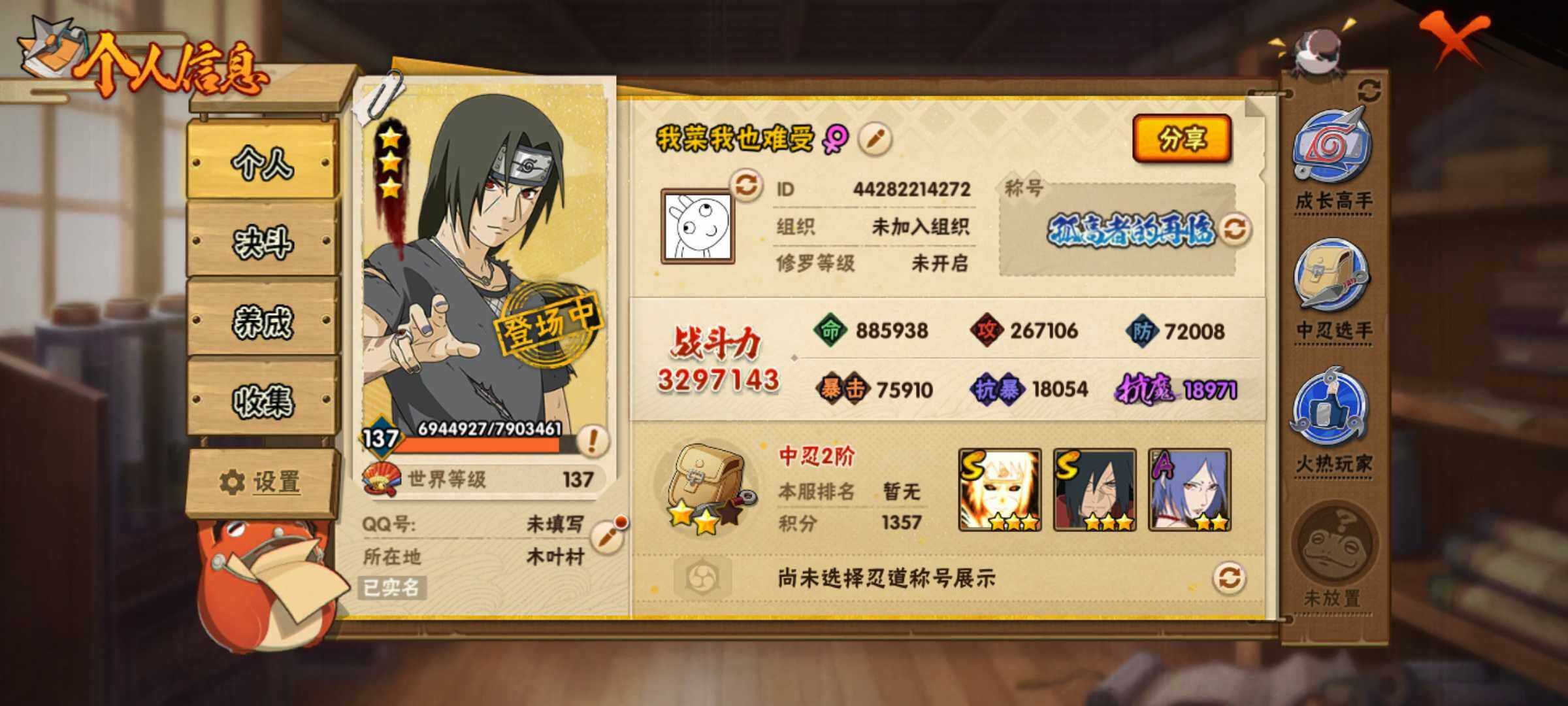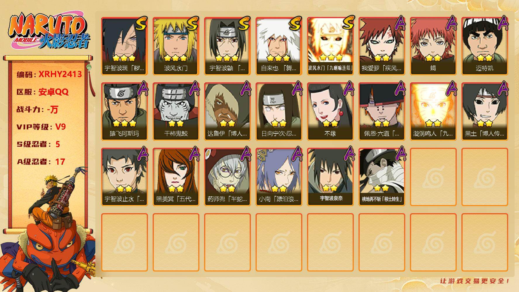 [13231266]Xr43748-安Q-5S级忍者数-17A级忍者数 【S级忍者】:宇智波斑「秽土转生·解」(3星),宇智波鼬「须佐能乎」(3星),自来也「舞之豪杰」(3星),波风水门(3星),波风水门「九喇嘛连结」(3星) 【A级忍者】:达鲁伊「博人传」(2星),干柿鬼鲛(2星),漩涡鸣人「九尾查克拉」(2星),迈特凯(2星),桃地再不斩「秽土转...
