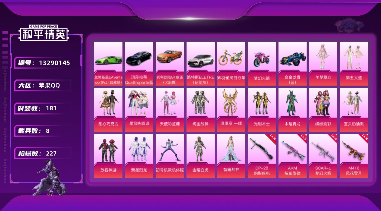 【11096111】【可二次】【苹果QQ】合金龙骨蓝色 双人摩托梦幻火箭 兰博SVJ绿色 新星烈龙 木耀青龙 SCAR-L梦幻火箭 甜心巧克力 AKM-炫紫旋律 放客神游 空客蔚蓝之翼 M416-风花雪月 天使彩虹糖 缤纷油彩 金耀白虎 宝贝奶油派 紫螳螂