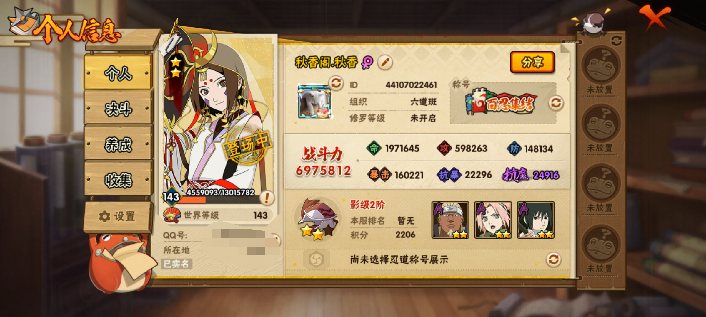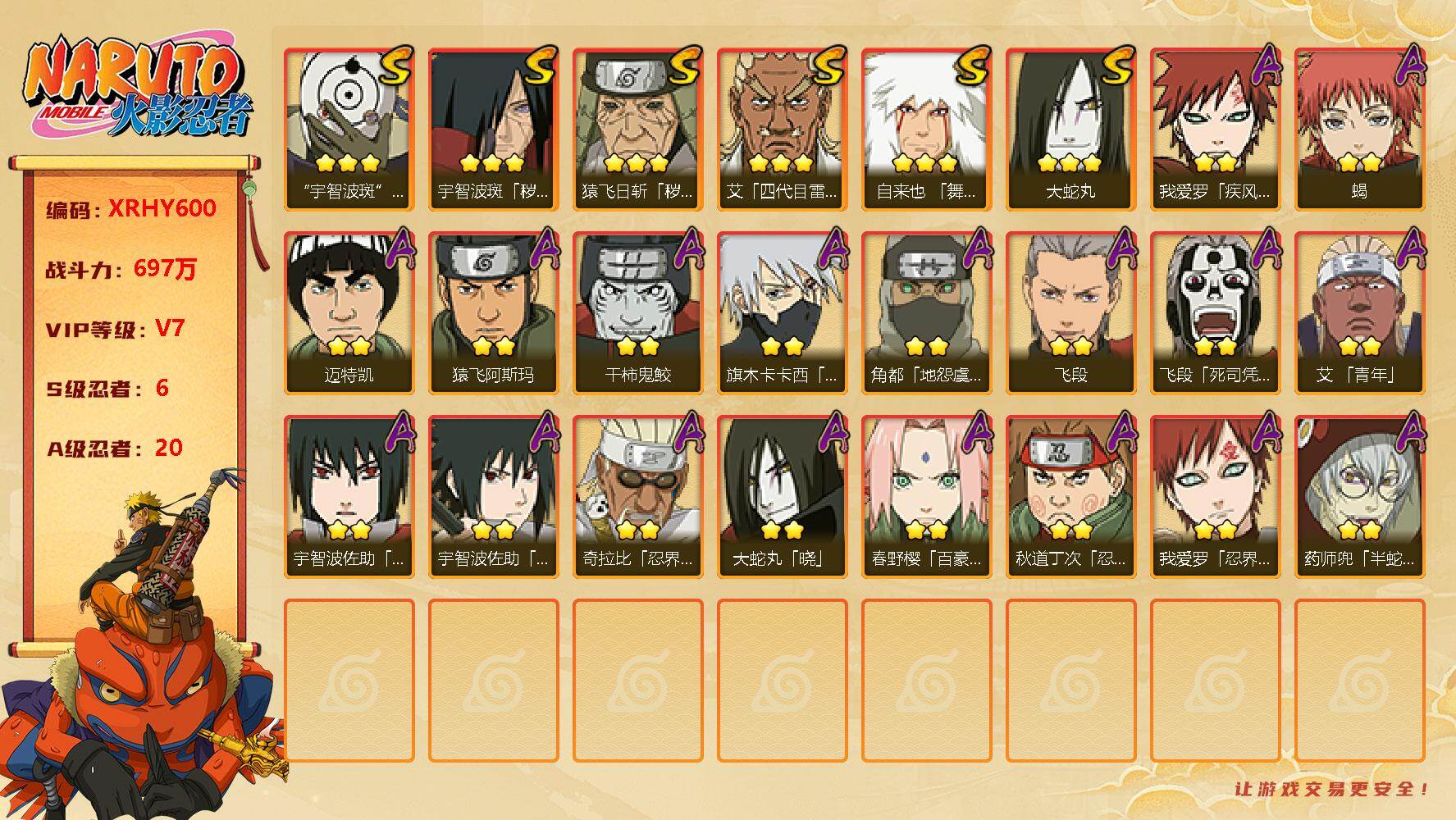 [13323499]Xr38075-战力697W-安Q-6S级忍者数-20A级忍者数 【S级忍者】:猿飞日斩「秽土转生」(3星),宇智波斑「秽土转生」(3星),艾「四代目雷影」(3星),自来也「舞之豪杰」(3星),大蛇丸(3星),宇智波斑 「白面具」(3星宇智波斑「白面具」) 【A级忍者】:艾「青年」(2星),大蛇丸「晓」(2星),奇拉比「忍界大战」(...