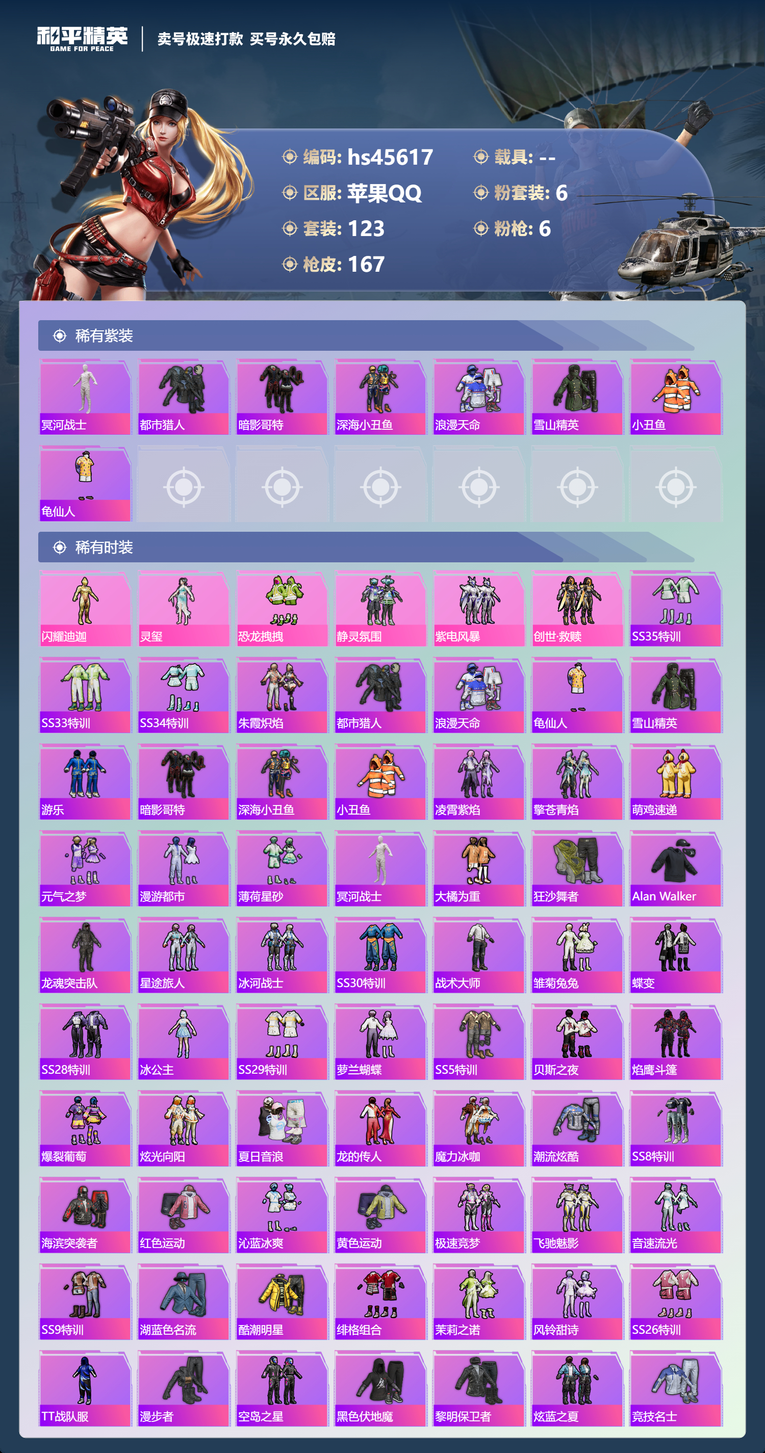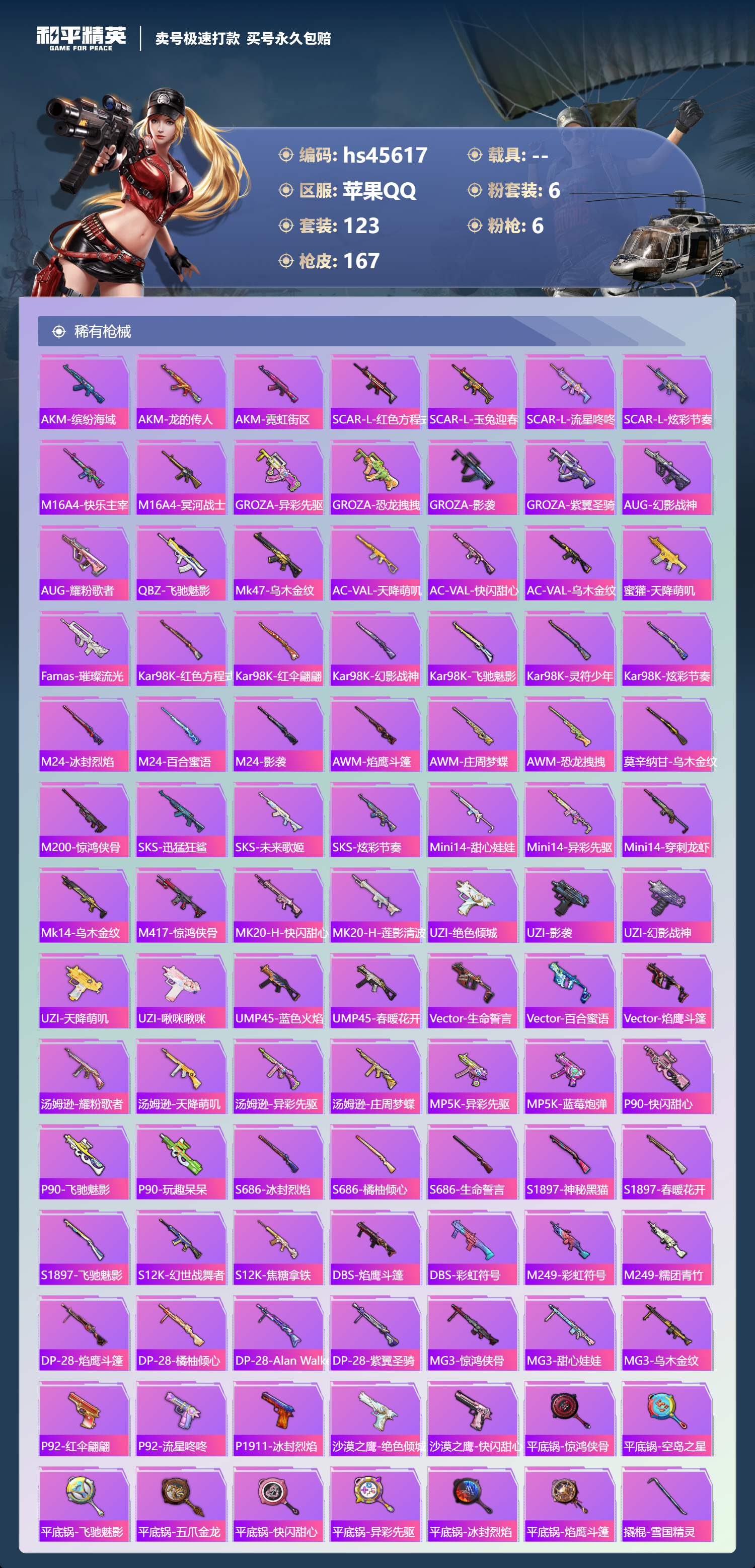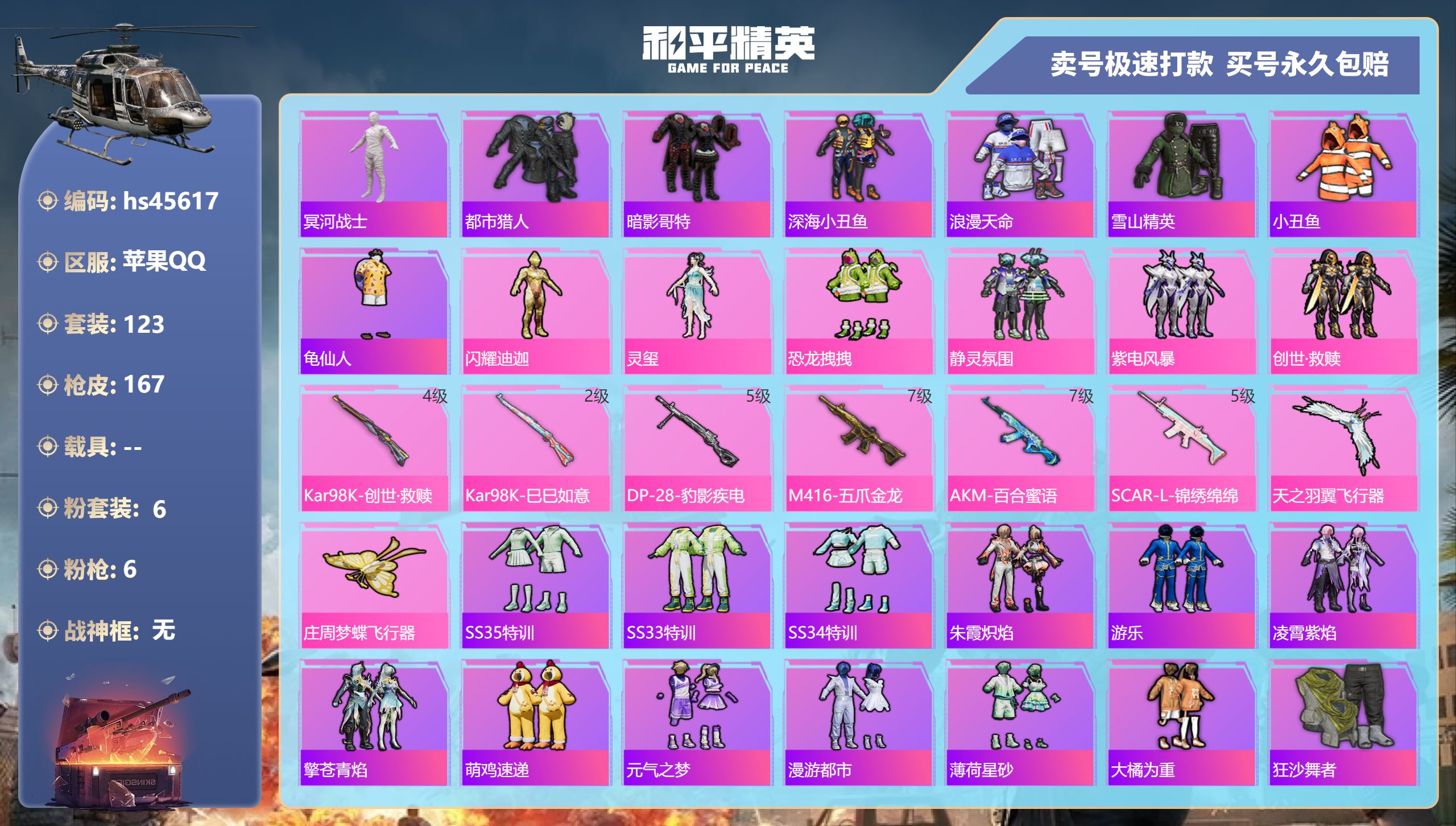 【11129563】【不可二次】【苹果QQ】紫电风暴 龟仙人 恐龙拽拽 木乃伊 水银刺客 大橘为重 M416-五爪金龙 漫步者 迪迦奥特曼 都市猎人 狂沙舞者 AKM-百合蜜语 庄周梦蝶飞行器 SCAR-L-锦绣绵绵 闪耀迪迦型 静灵氛围 AKM-缤纷海域 深海小丑鱼 天之羽翼飞行器 浪漫天命 暗影哥特 雪山精英