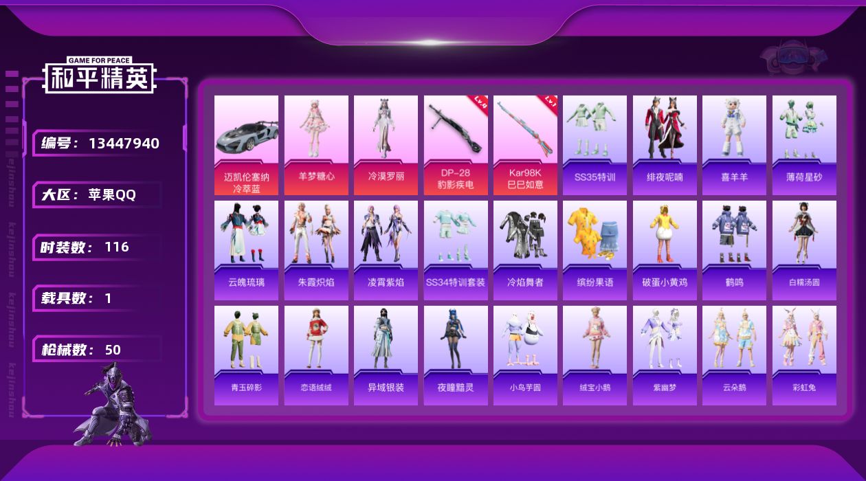 【11136545】[13447940]2粉装 2特效枪 1载具 3印记 可二次 可修改实名 【热门装扮】:冷漠罗丽,羊梦糖心 【载具】:迈凯伦塞纳(冷萃蓝) 【稀有枪皮】:Kar98K-巳巳如意,DP-28-豹影疾电 【四级特效枪】:四级DP-28-豹影疾电 【一级特效枪】:一级Kar98K-巳巳如意 【紫色装扮】:SS34特训套装,凌霄紫焰,朱霞炽焰,雪绒豹,彩虹兔,云朵鹅,SS31特训套