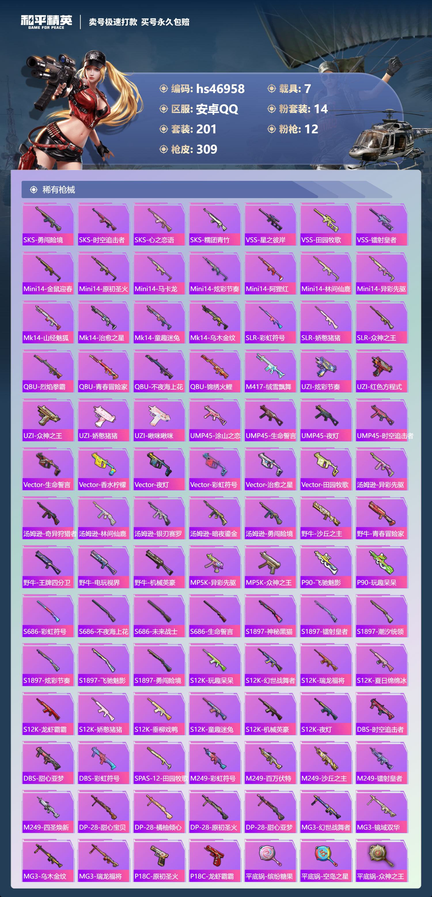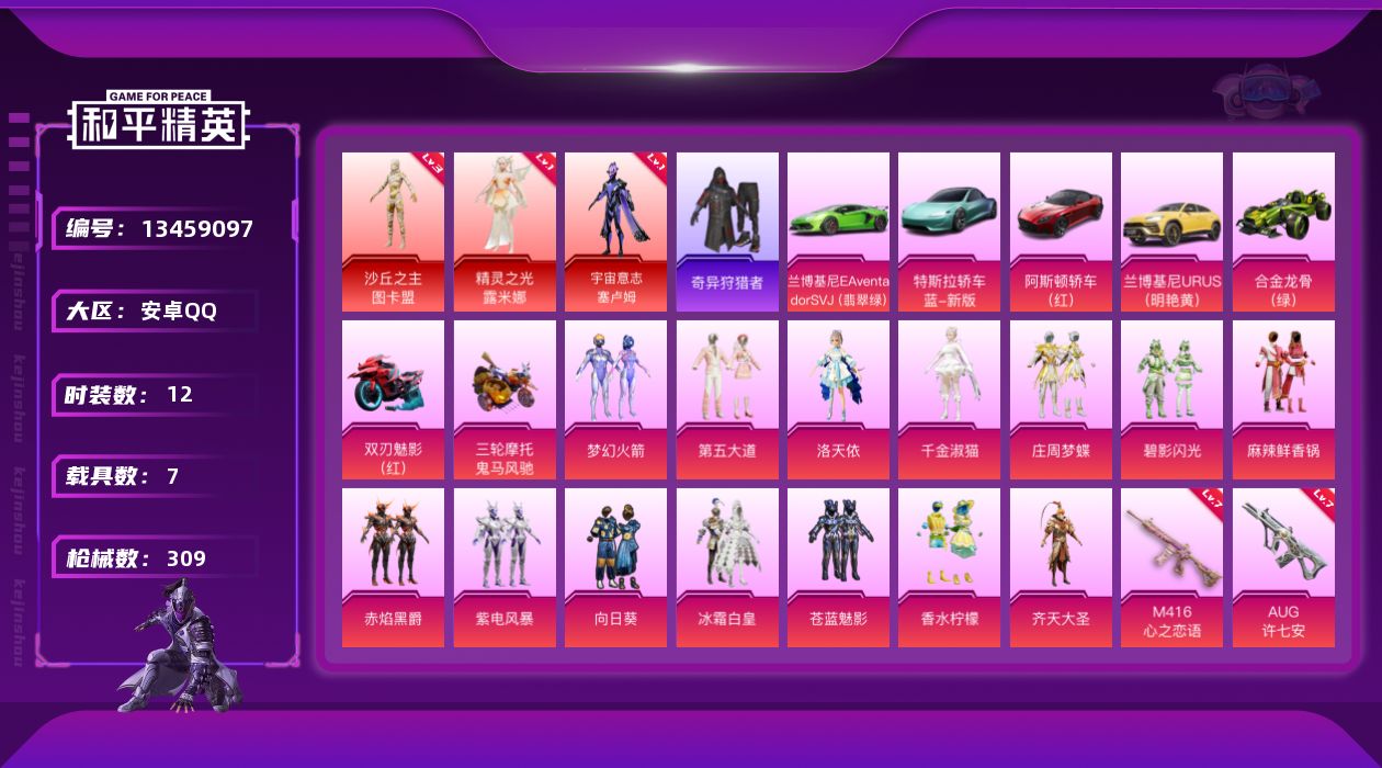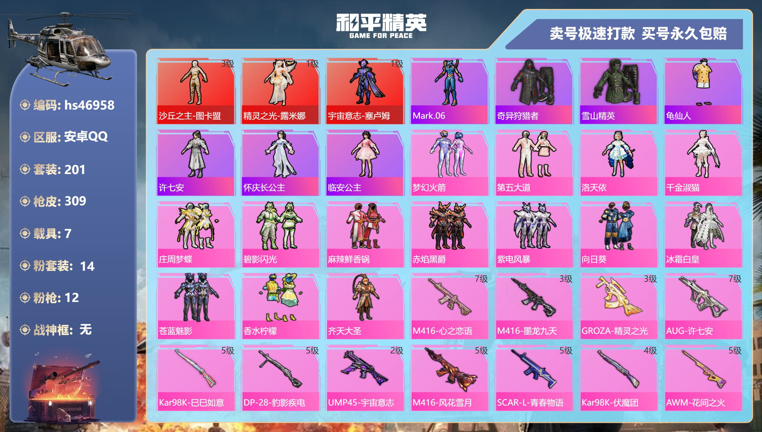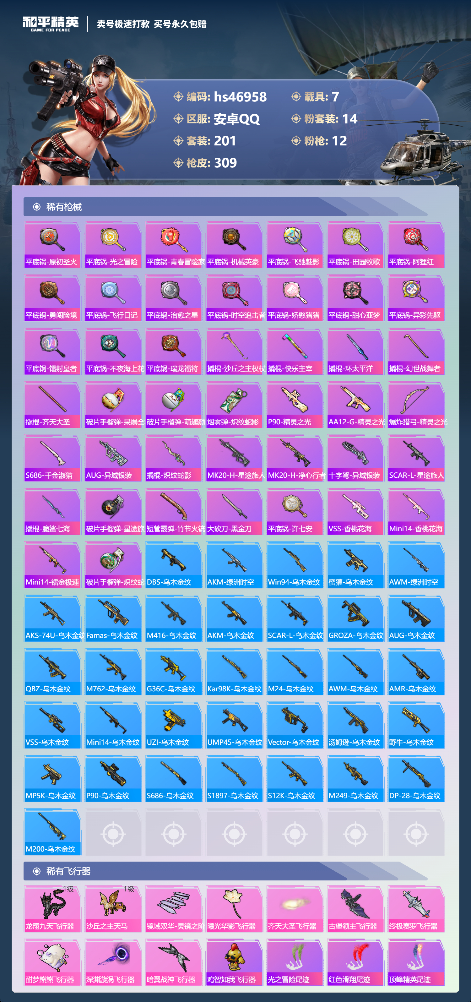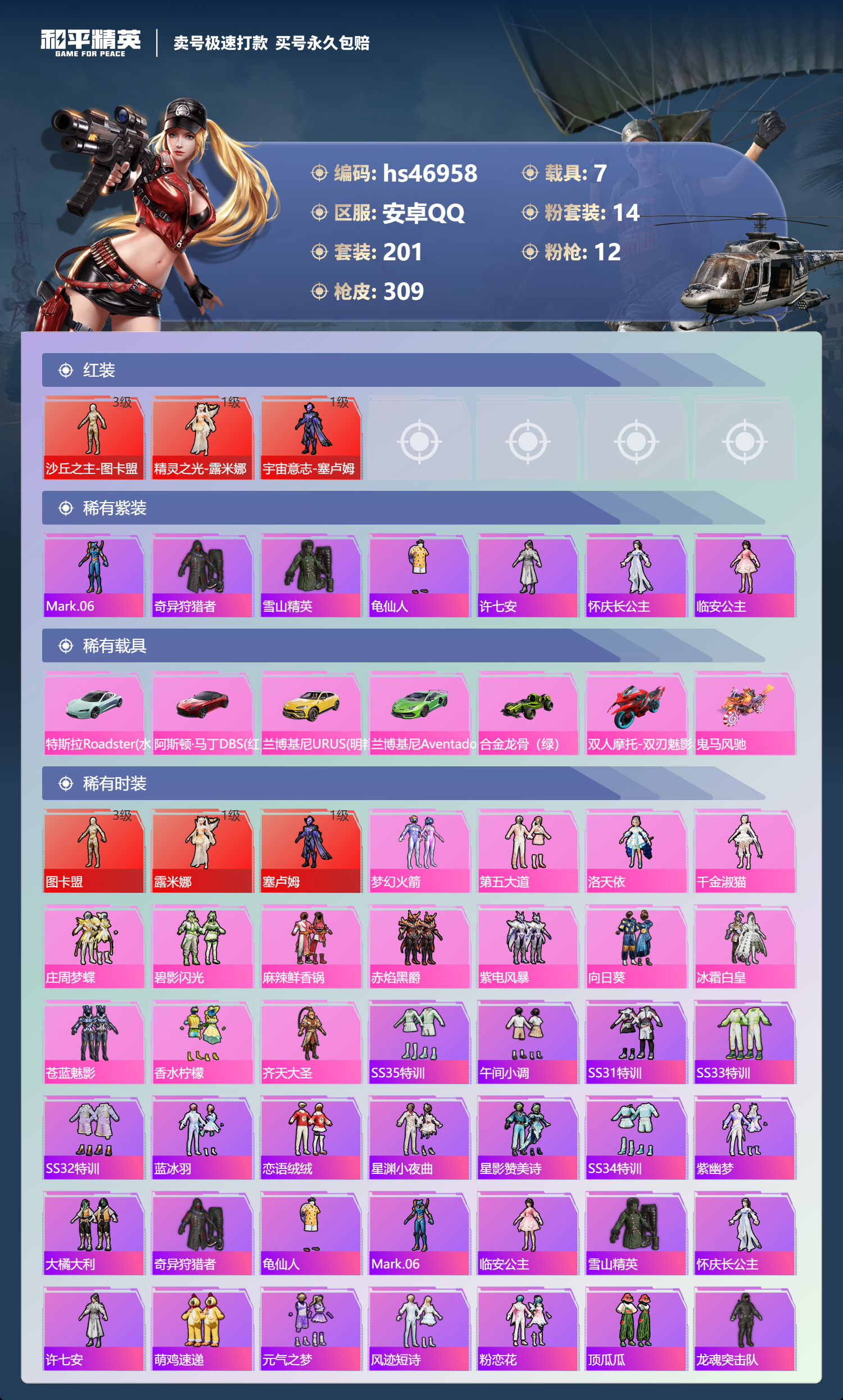【11139233】【不可二次】【安卓QQ】龟仙人 双刃魅影红色 苍蓝魅影 豚鼠丹丹 忍者信条 Mini14-林间仙鹿 沙丘之主-图卡盟 M416-心之恋语 麻辣鲜香锅 碧影闪光 特斯拉R水滴蓝 Kar98K-伏魔团 纯白誓言 紫电风暴 兰博SVJ绿色 M762-瑞龙福将 齐天大圣飞行器 海洋之心 新侠客行 UMP45-宇宙意志 龙翔九天飞行器 兰博SUV黄色 齐天大圣 香水柠檬 白月香洋装 庄