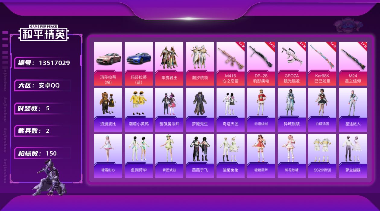 【11155121】【不可二次】【安卓QQ】潮汐统领 潮萌小黄鸭 黑色刀锋 海洋之心 新侠客行 极速红龙 华贵君王 M762-潮萌小黄鸭 玛莎拉蒂蓝色 赛博空间 软嫩糖心蛋 M416-仓鼠灰灰 M416-心之恋语 AUG-魔法学院 浪漫波比 玛莎拉蒂粉色 激萌小黄鸭 M24-星之信仰 雪山精英