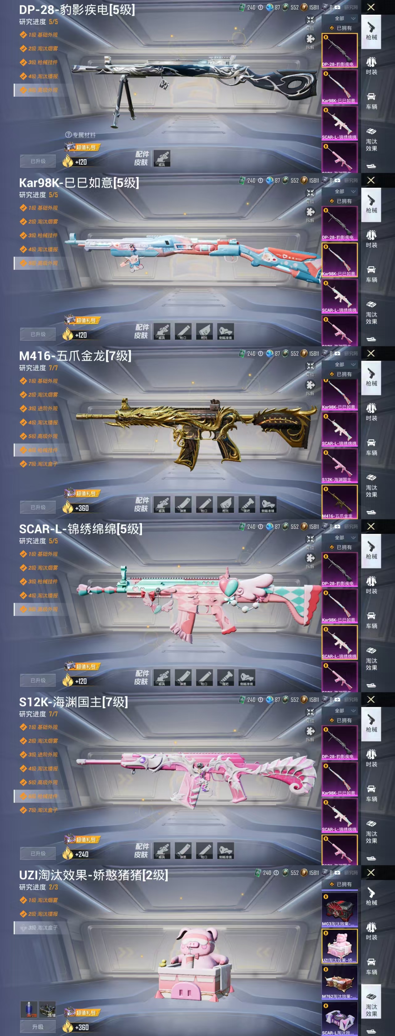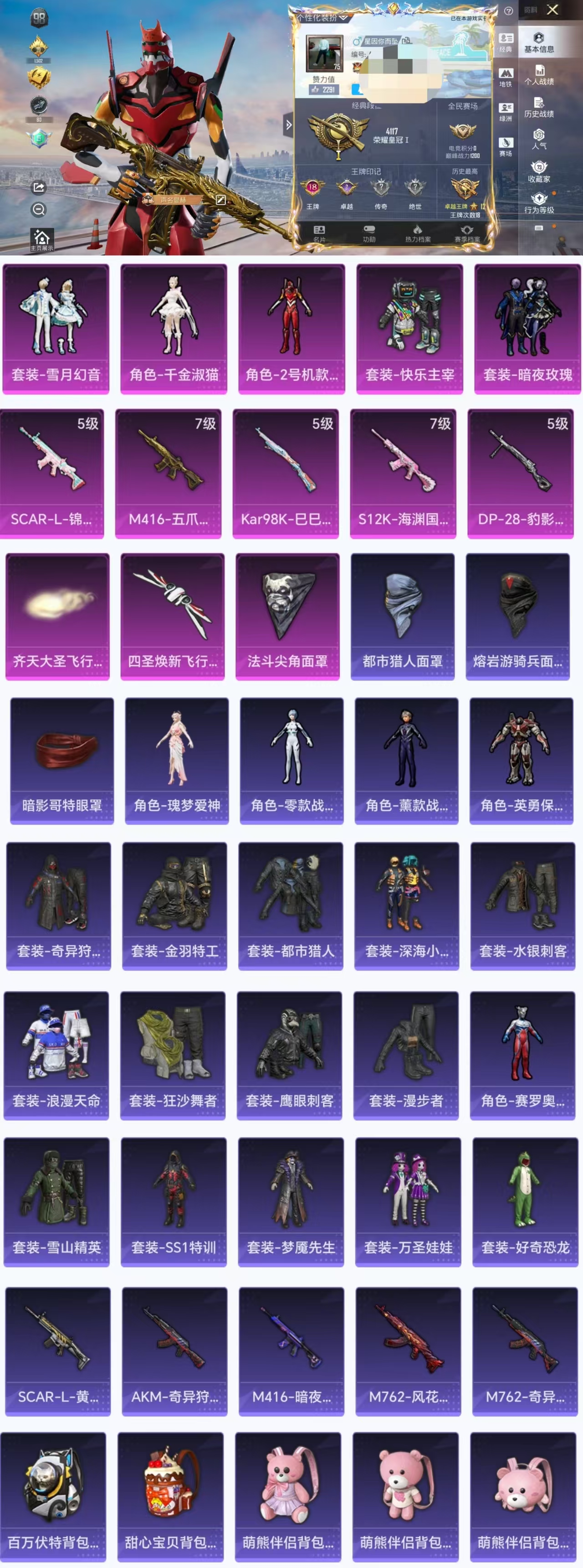 [13538968]H11602安卓Q区-5粉装-5特效枪-95552热力值-18王牌印记-246套装-318枪皮【优质套装】: 2号机款机体服 雪月幻音 千金淑猫 暗夜玫瑰 快乐主宰【特效枪等级】:Kar98K-巳巳如意(五级- Kar98K-巳巳如意)M416-五爪金龙(七级- M416-五爪金龙)SCAR-L-锦绣绵绵(五级- SCAR-L-锦绣绵绵)S12K-海渊国主(...