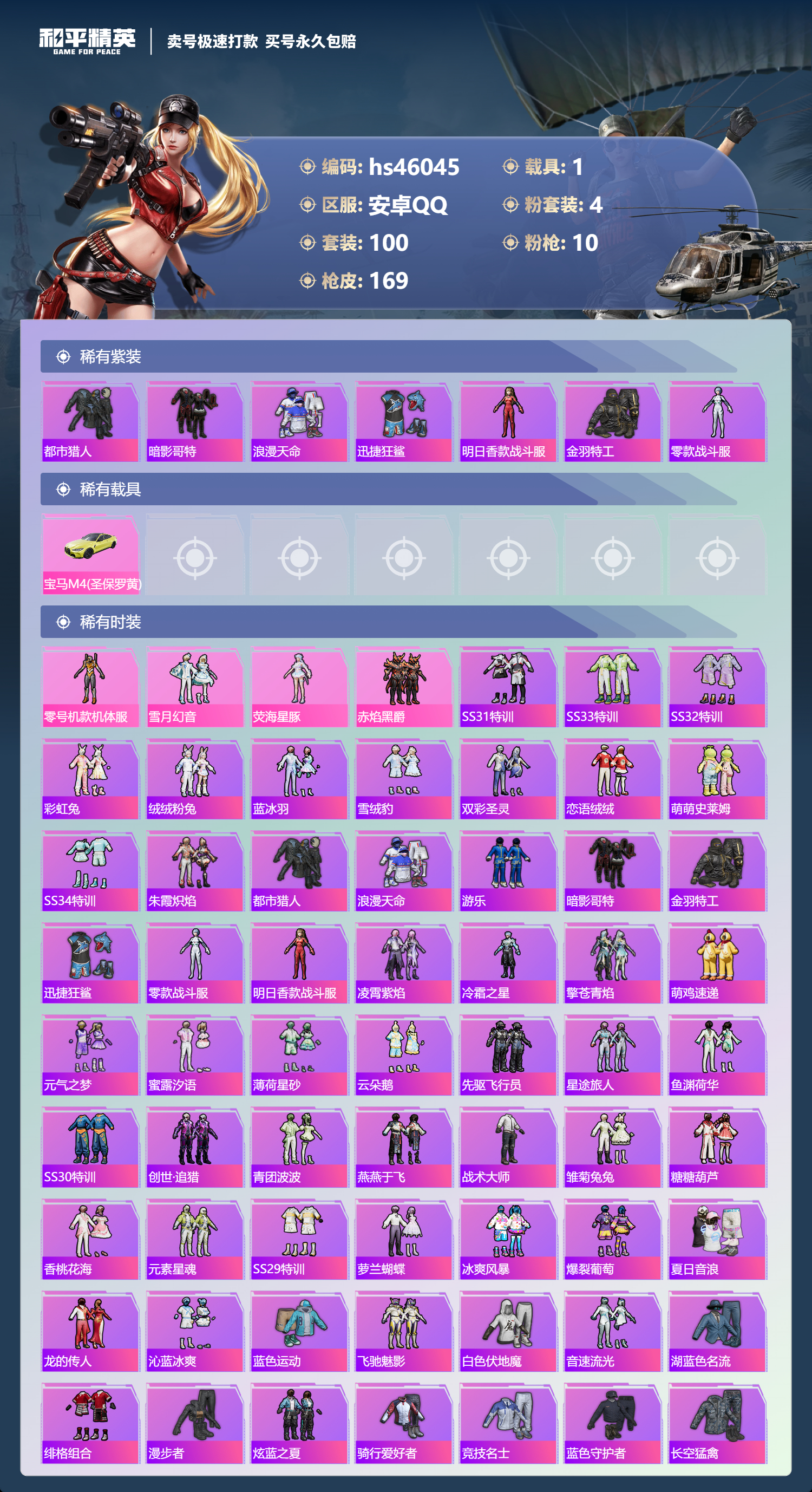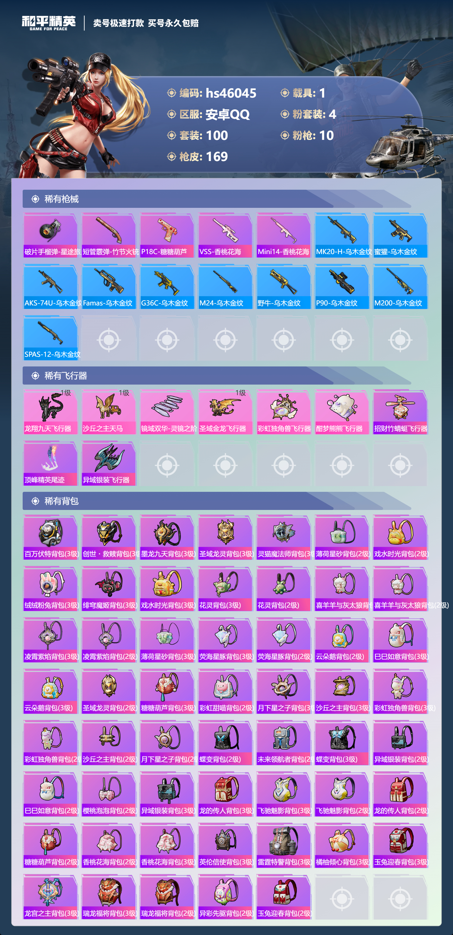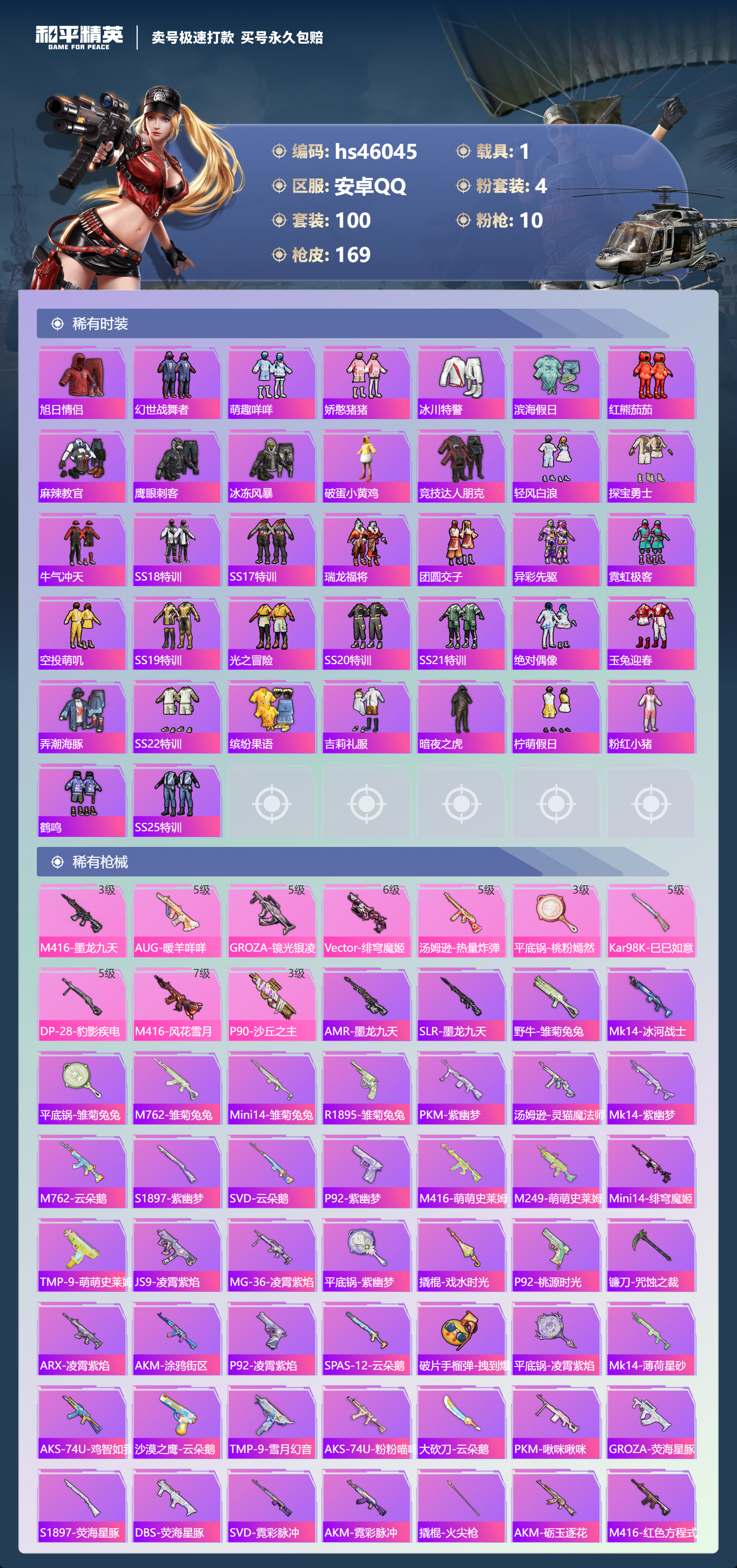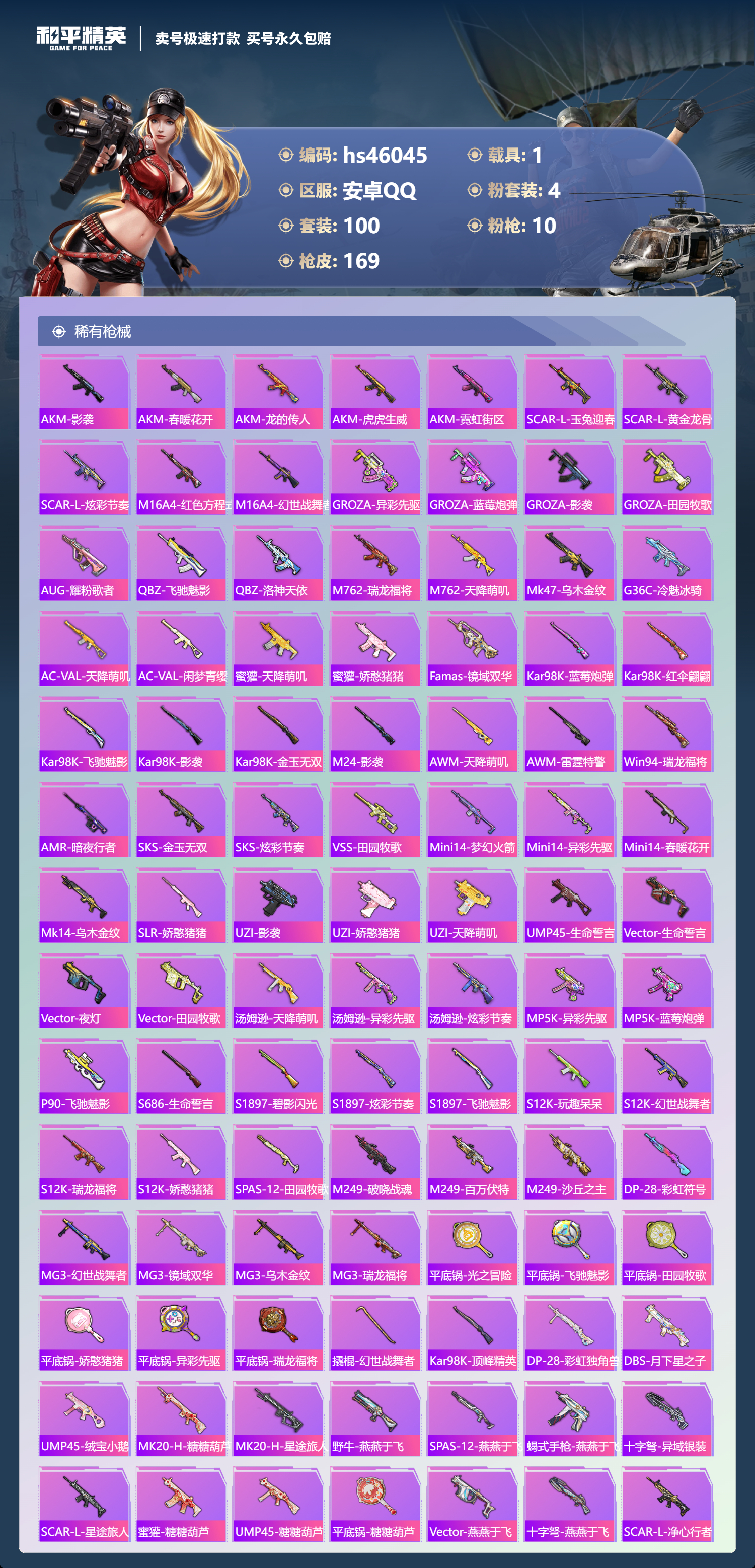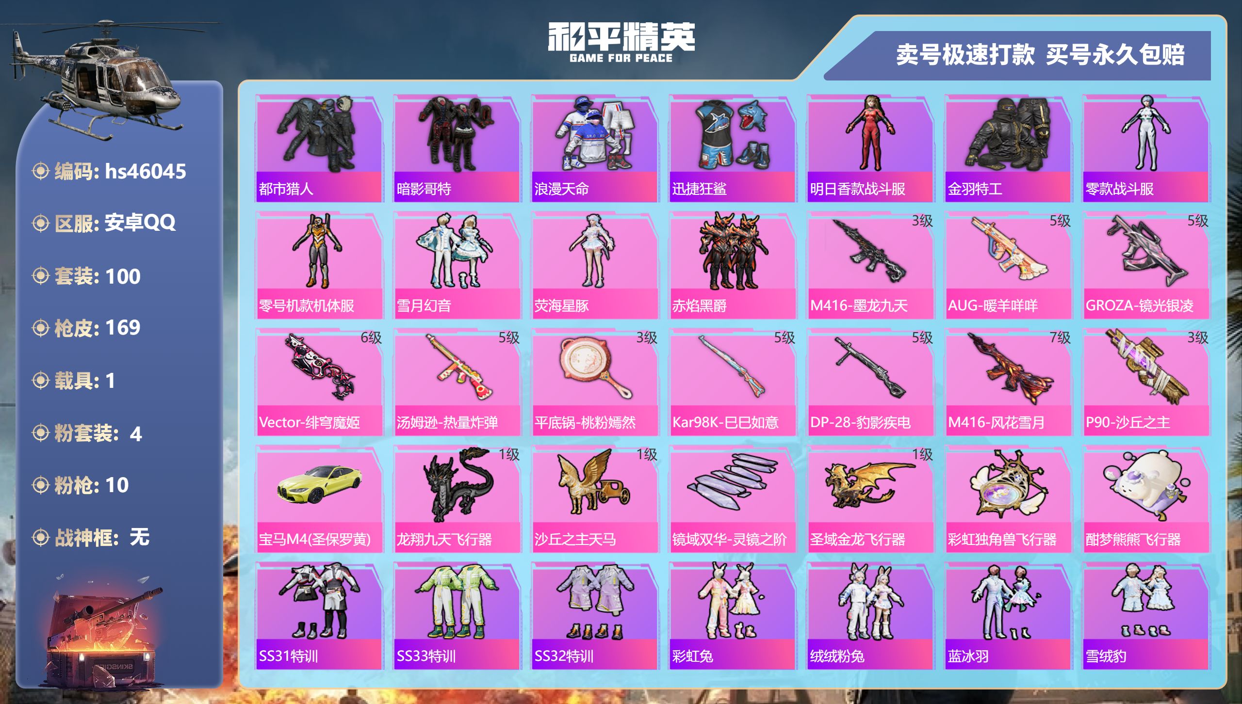 【11166950】【不可二次】【安卓QQ】红熊茄茄 漫步者 P90-沙丘之主 都市猎人 迅捷狂鲨 M762-瑞龙福将 龙翔九天飞行器 金羽特工 M416-墨龙九天 赤焰黑爵 暗夜之虎 M416-风花雪月 黄螳螂 粉红小猪 瑞龙福将 浪漫天命 暗影哥特 团圆交子