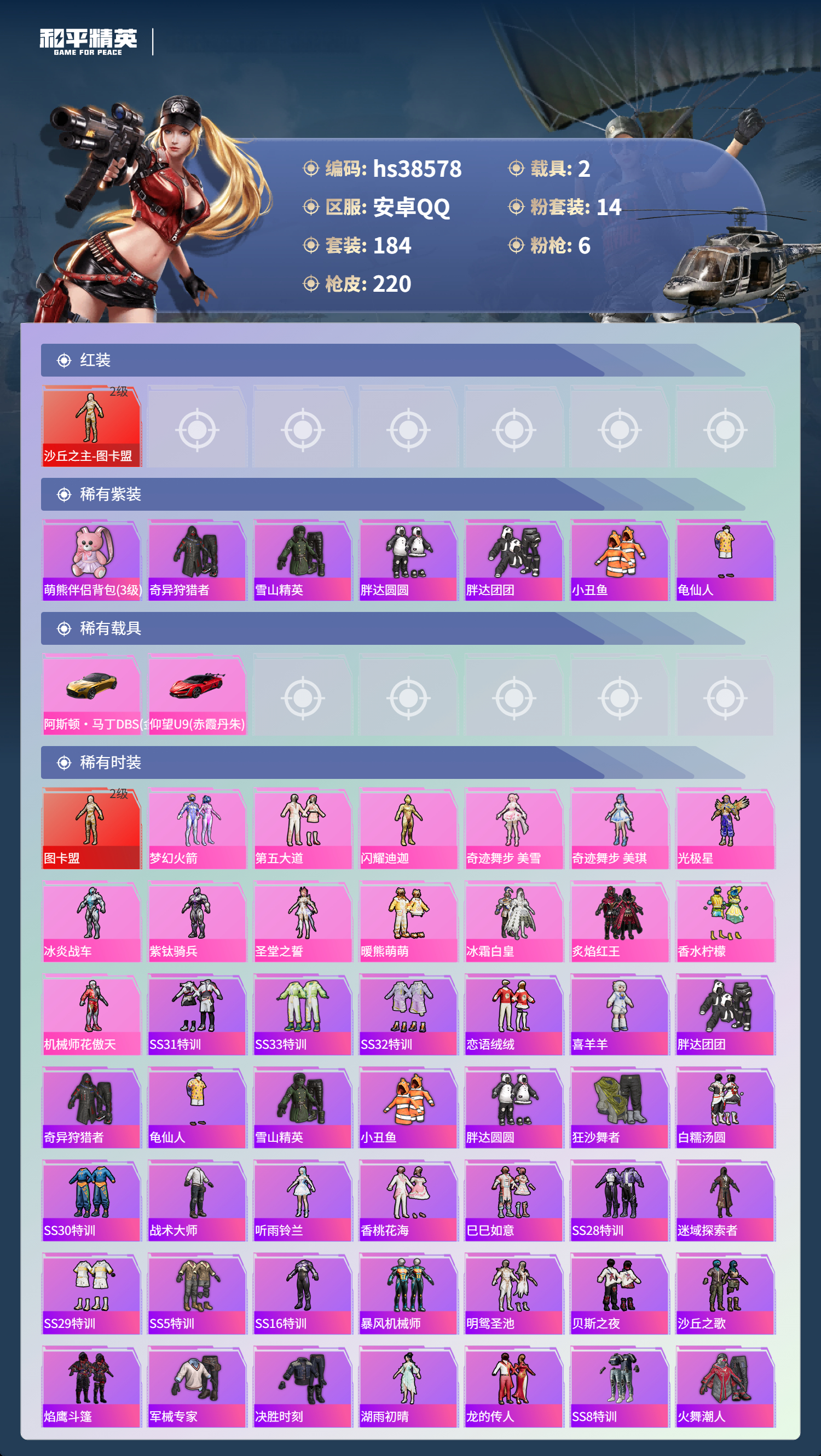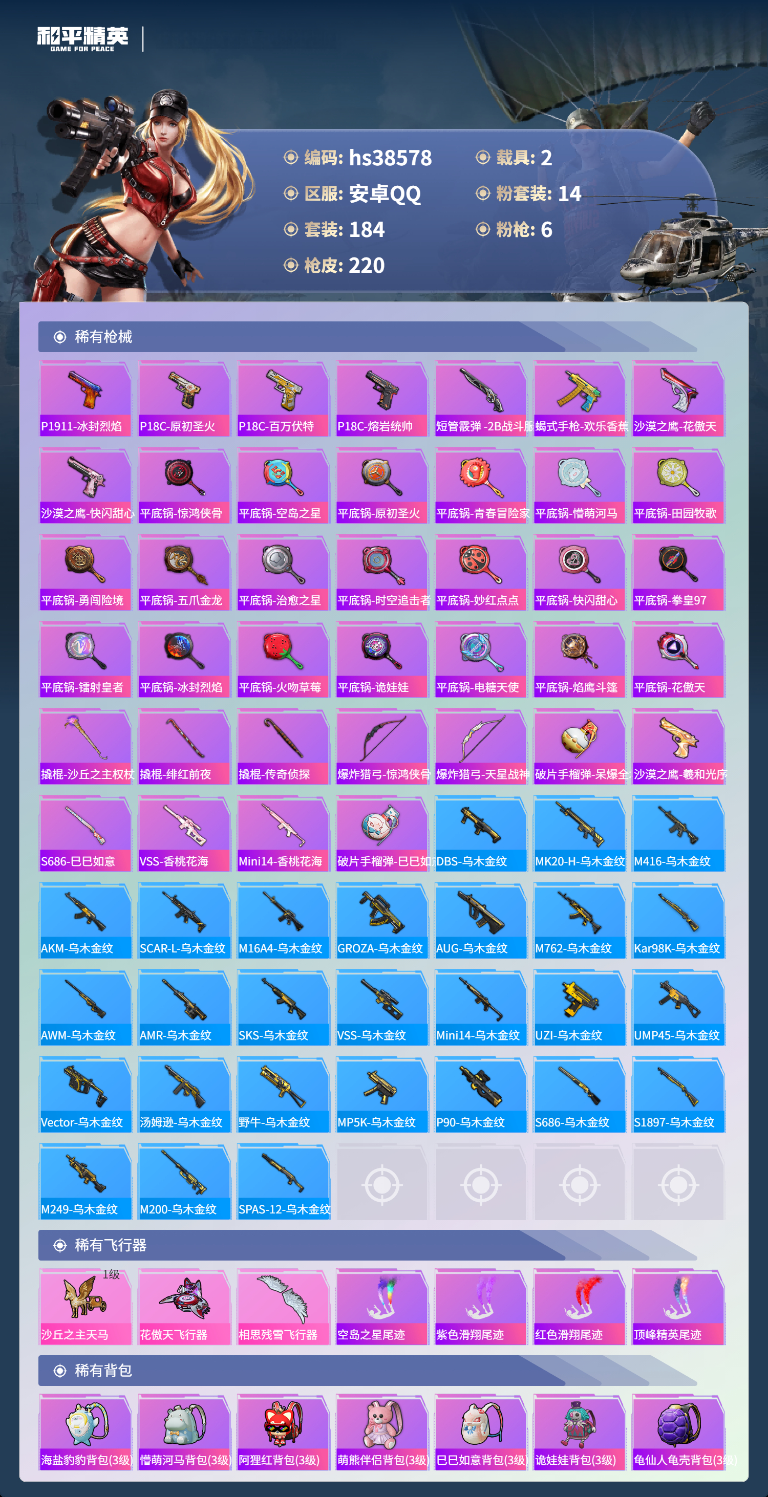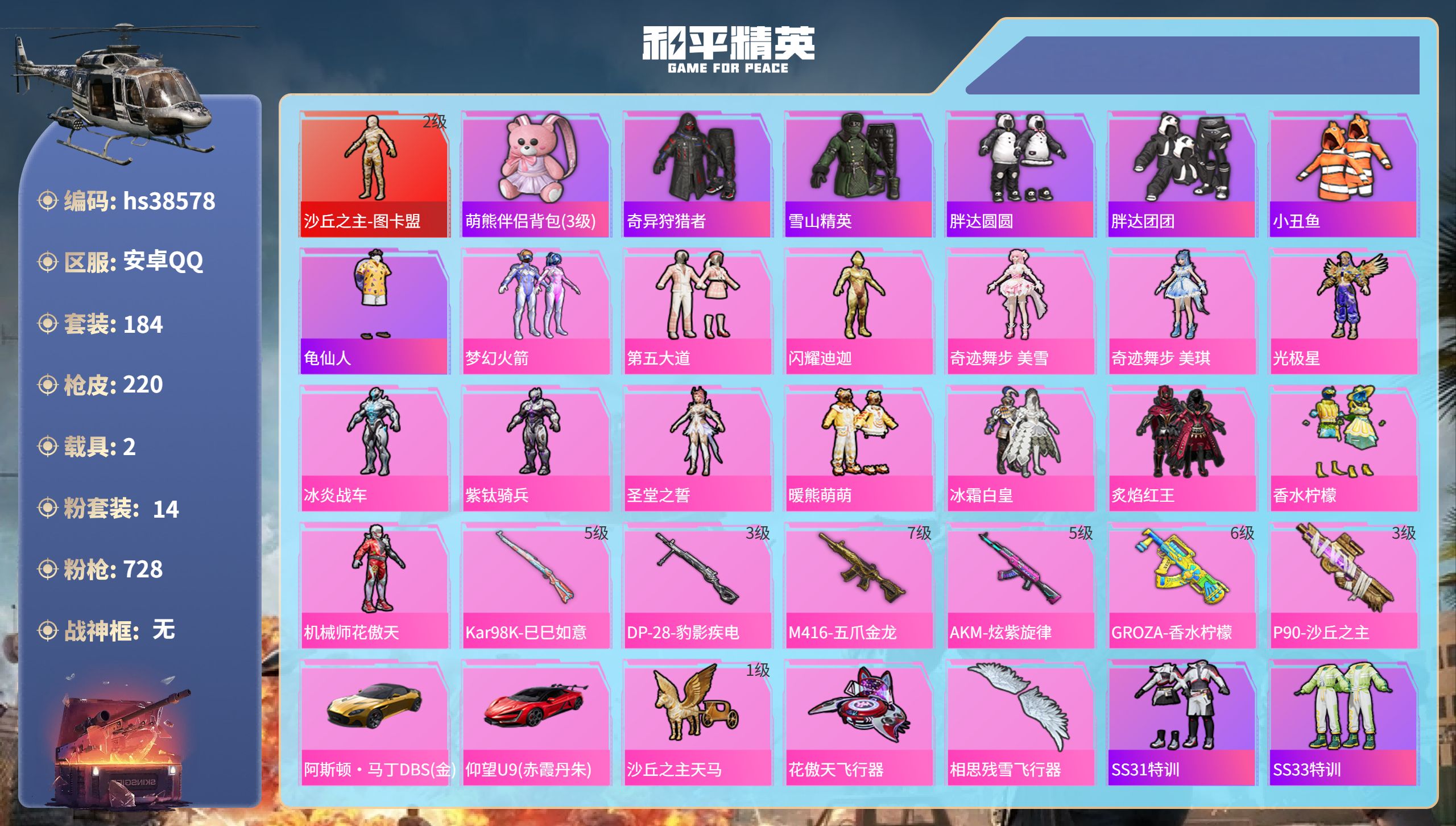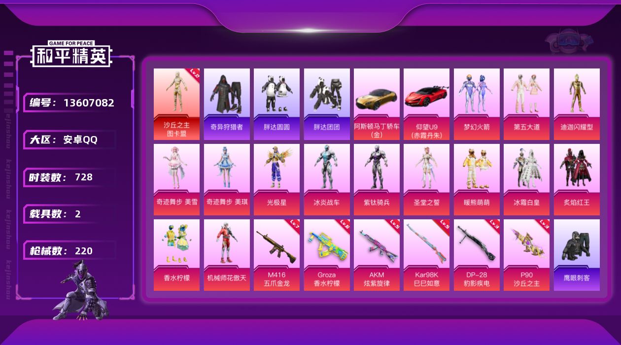 【11172763】【不可二次】【安卓QQ】龟仙人 M416-五爪金龙 P90-沙丘之主 迪迦奥特曼 炙焰红王 极速红龙 仰望U9(赤霞丹朱) M762-奇异狩猎者 沙丘之主-图卡盟 闪耀迪迦型 花傲天飞行器 M24-香水柠檬 胖达团团 胖达圆圆 SS1特训 相思残雪飞行器 奇异狩猎者 狂沙舞者 AKM-炫紫旋律 香水柠檬 梦幻火箭 GROZA-香水柠檬 阿斯顿马丁S金色 冰霜白皇 雪山精英