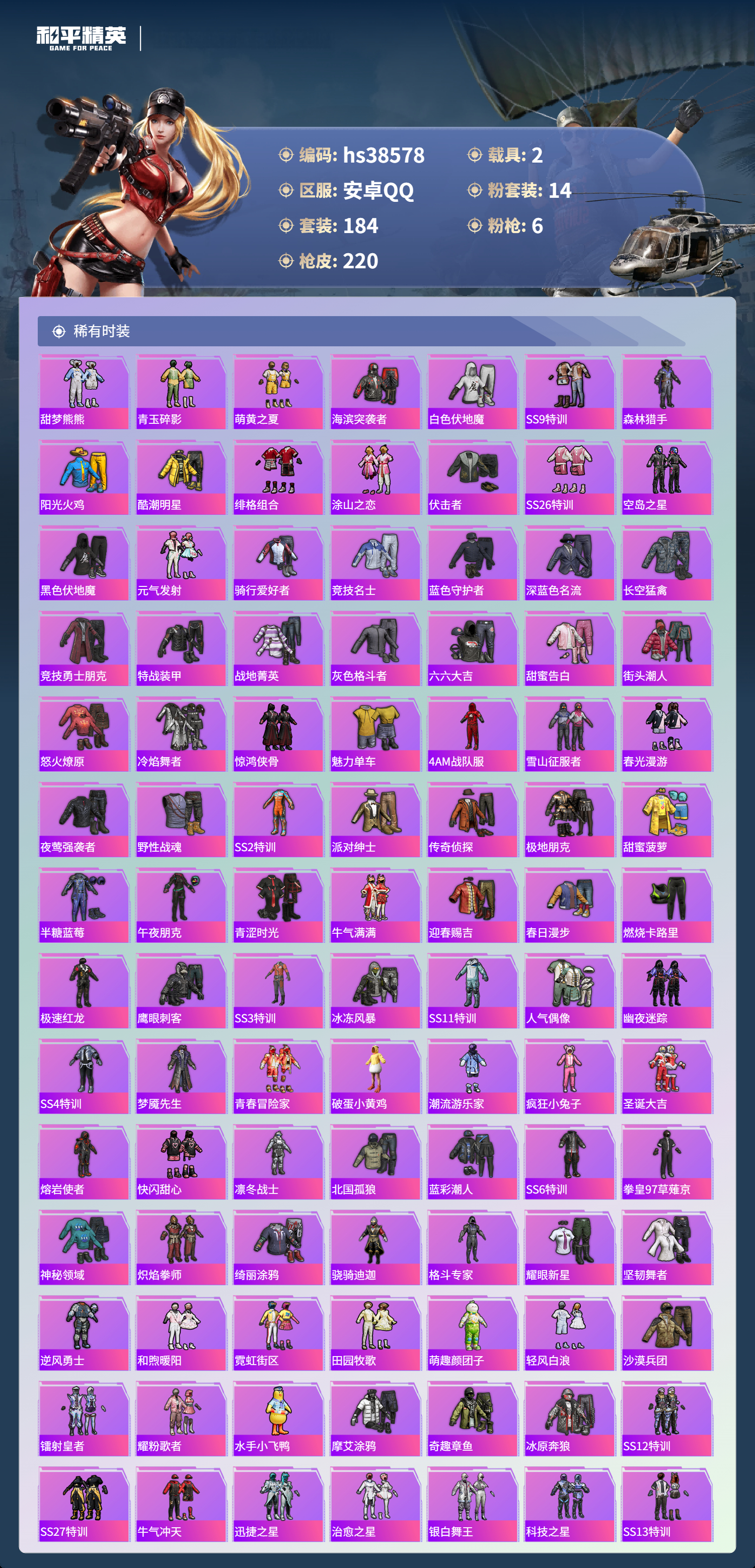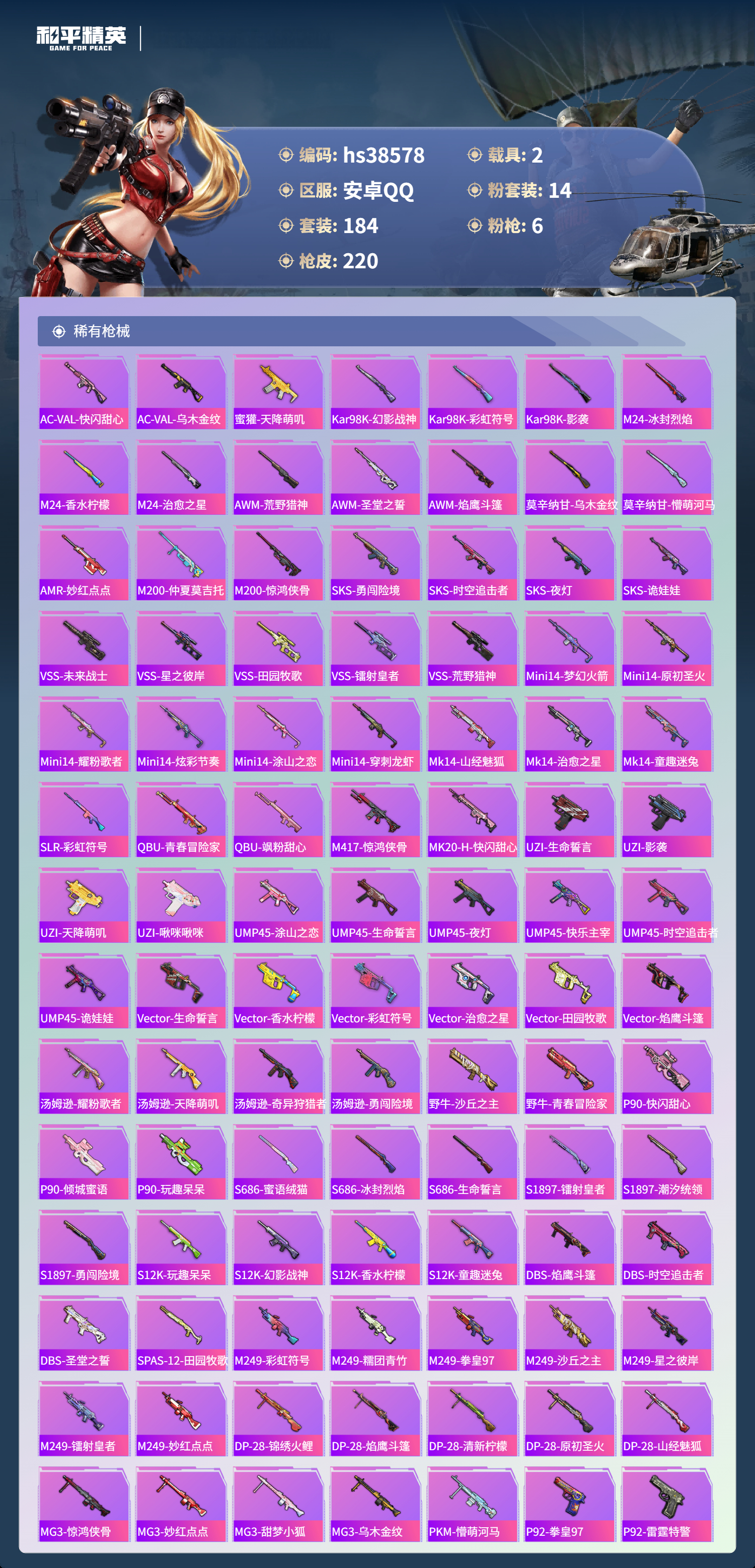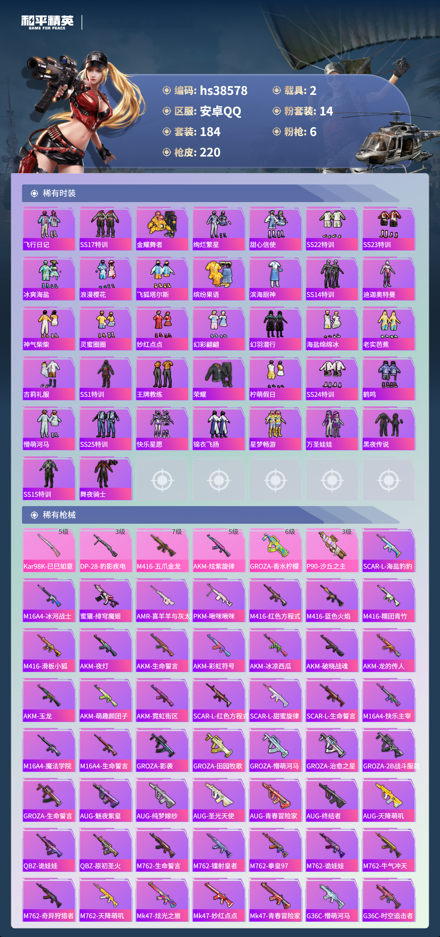 【11172763】【不可二次】【安卓QQ】龟仙人 M416-五爪金龙 P90-沙丘之主 迪迦奥特曼 炙焰红王 极速红龙 仰望U9(赤霞丹朱) M762-奇异狩猎者 沙丘之主-图卡盟 闪耀迪迦型 花傲天飞行器 M24-香水柠檬 胖达团团 胖达圆圆 SS1特训 相思残雪飞行器 奇异狩猎者 狂沙舞者 AKM-炫紫旋律 香水柠檬 梦幻火箭 GROZA-香水柠檬 阿斯顿马丁S金色 冰霜白皇 雪山精英