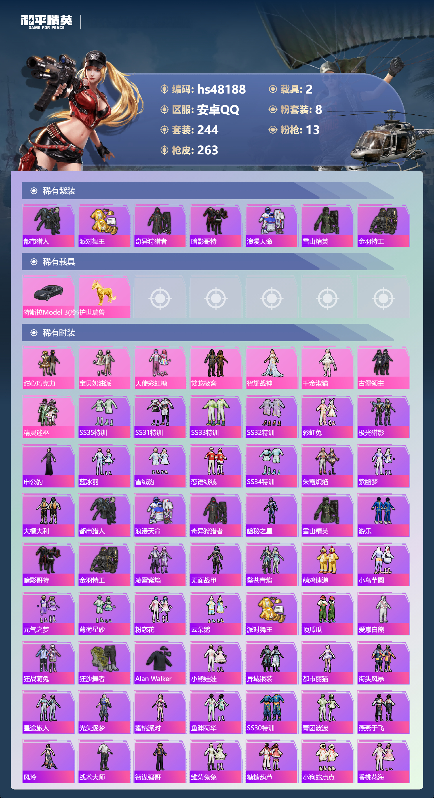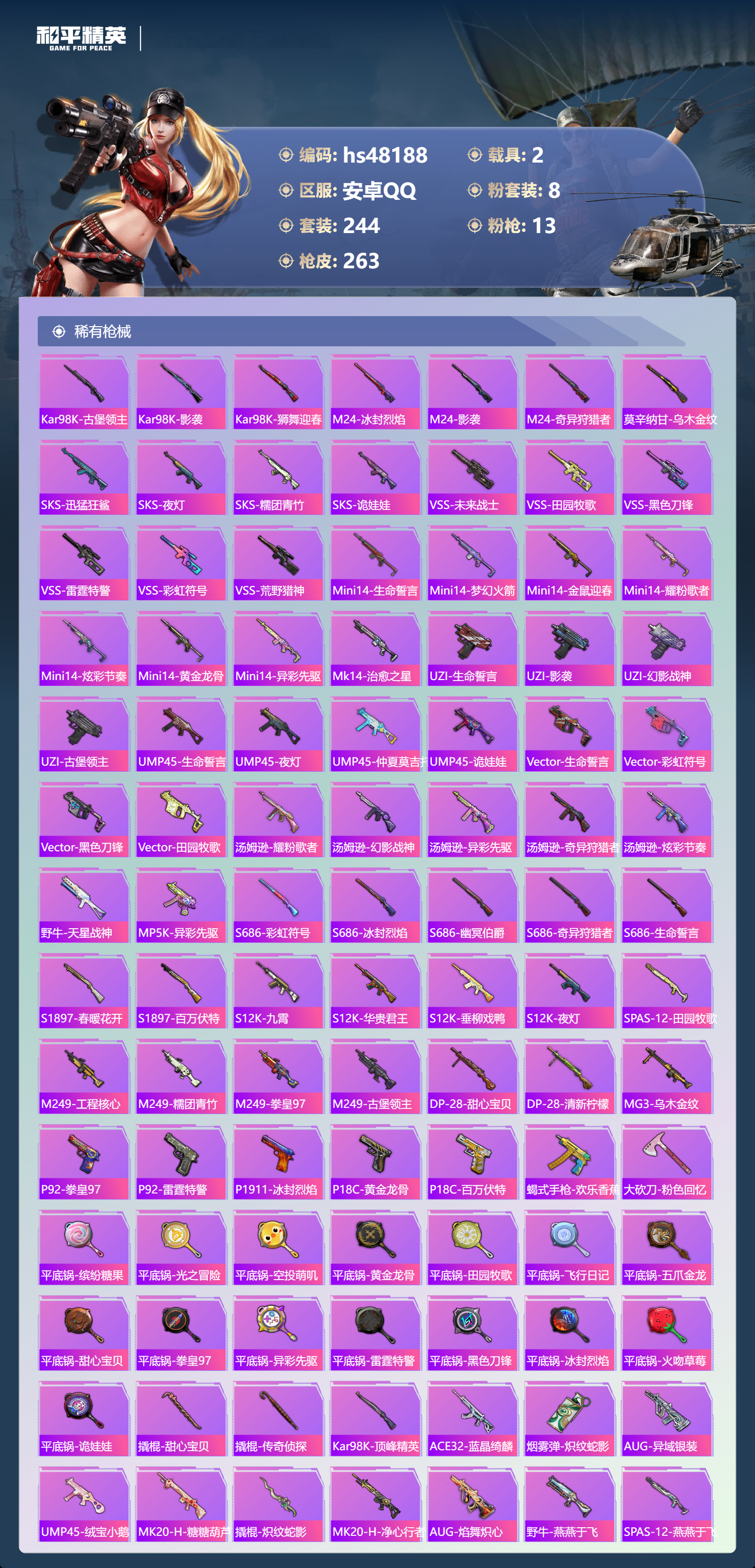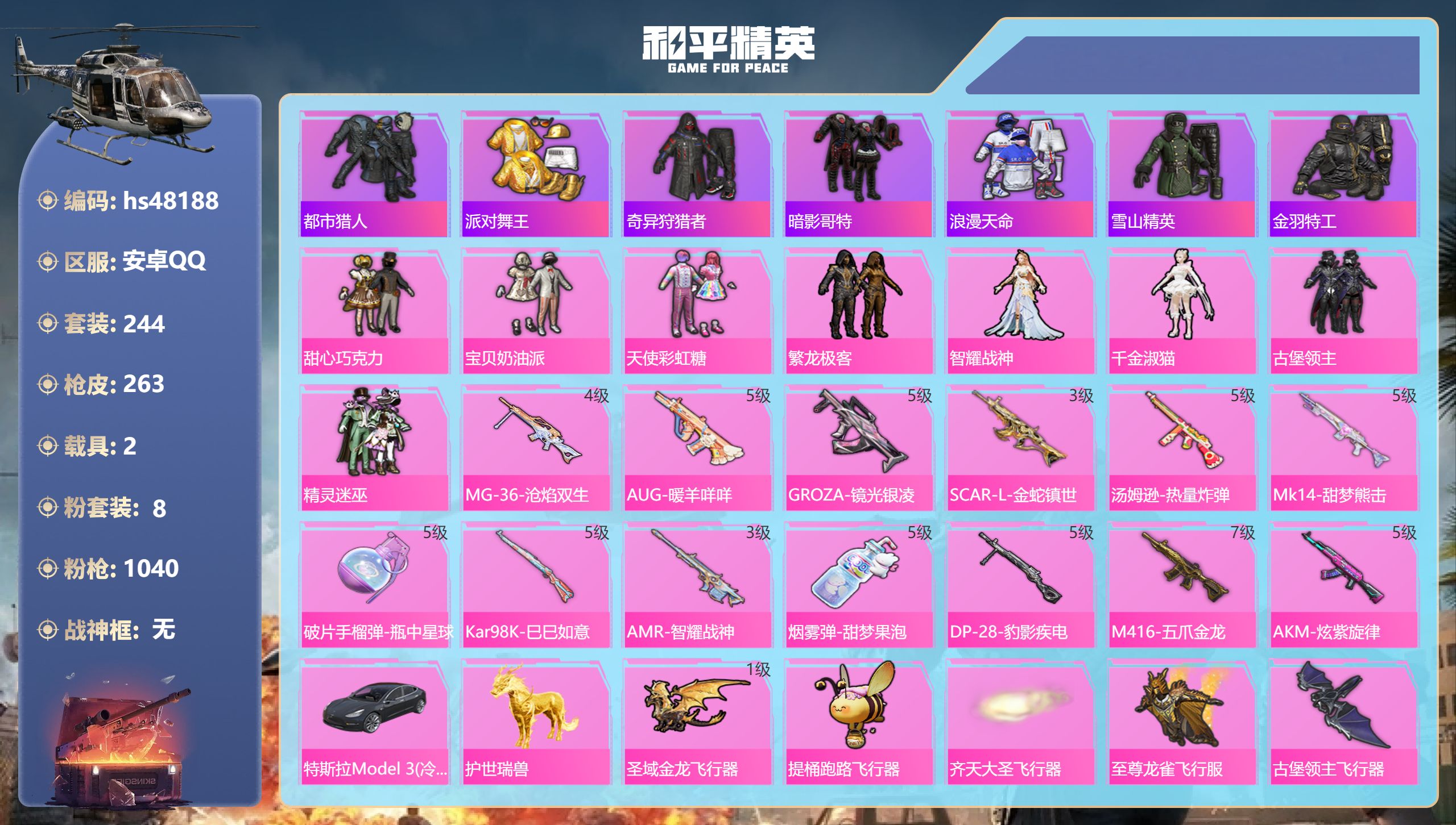 【11174871】【不可二次】【安卓QQ】S686-奇异狩猎者 M416-五爪金龙 漫步者 都市猎人 M24-奇异狩猎者 M249-古堡领主 特斯拉3银色 至尊龙雀飞行服 极速红龙 M762-奇异狩猎者 浪漫天命 AKM-奇异狩猎者 SS1特训 精灵迷巫 奇异狩猎者 齐天大圣飞行器 黑色刀锋 甜心巧克力 狂沙舞者 金羽特工 繁龙极客 AKM-炫紫旋律 古堡领主 古堡领主飞行器 天使彩虹糖 粉红
