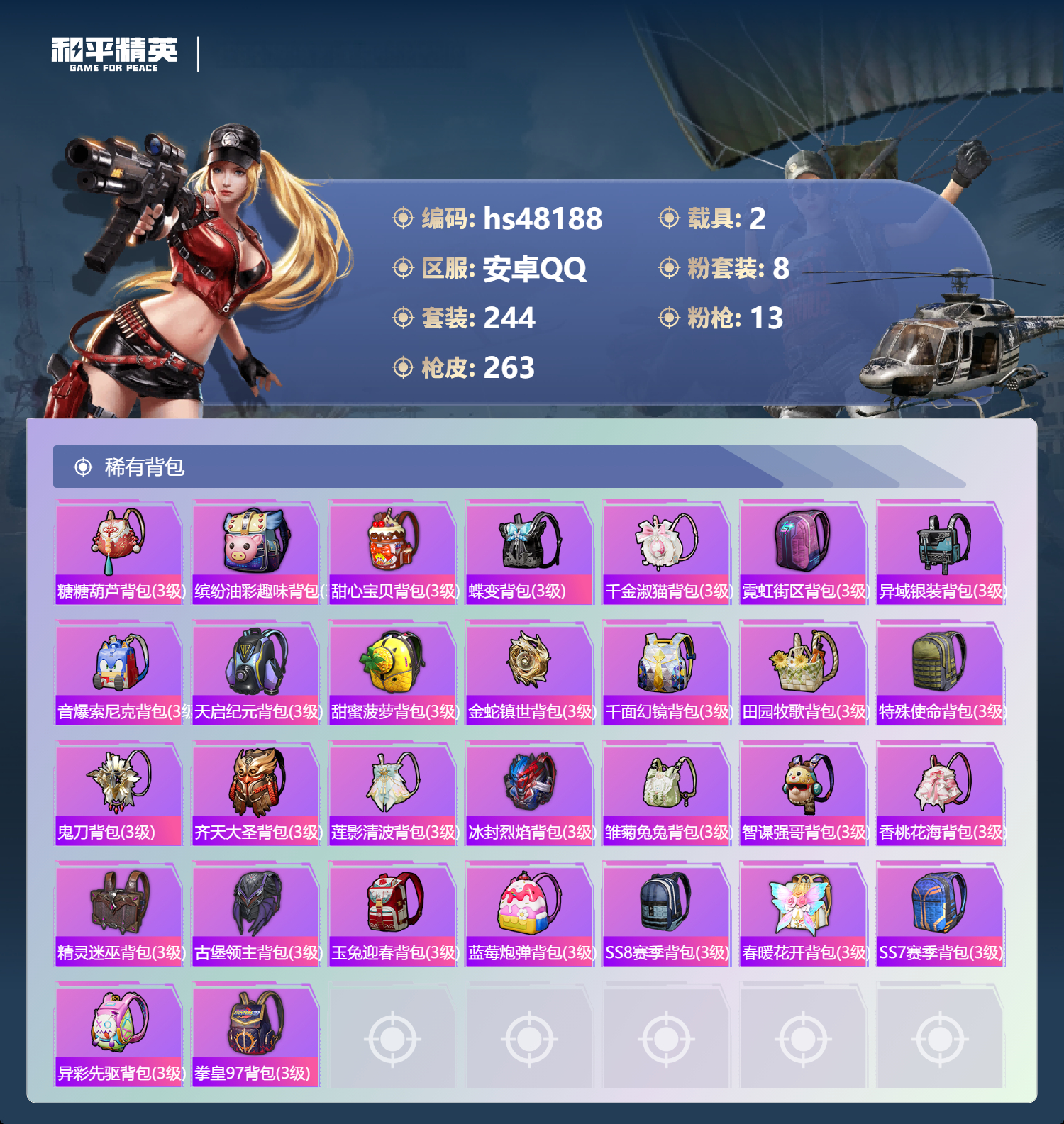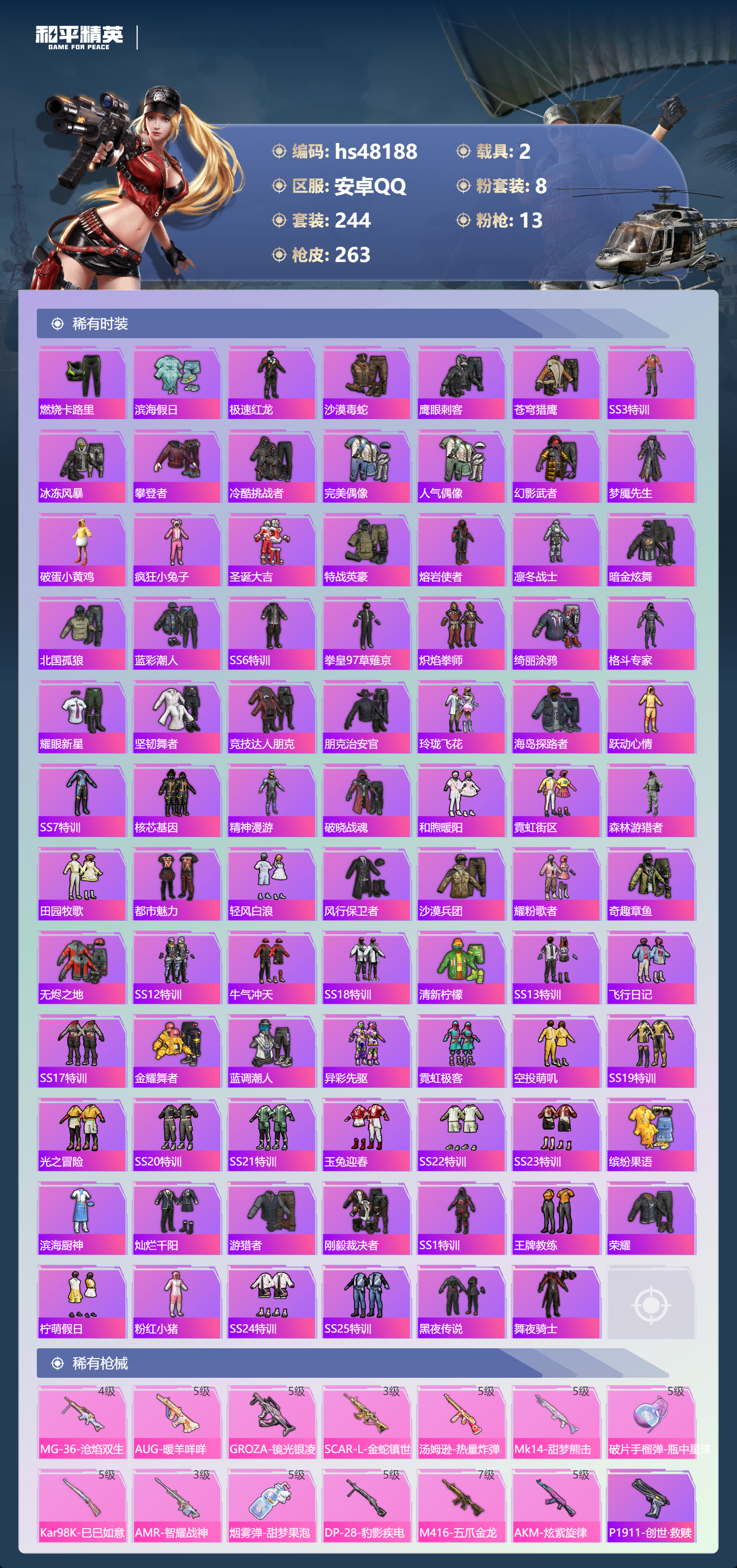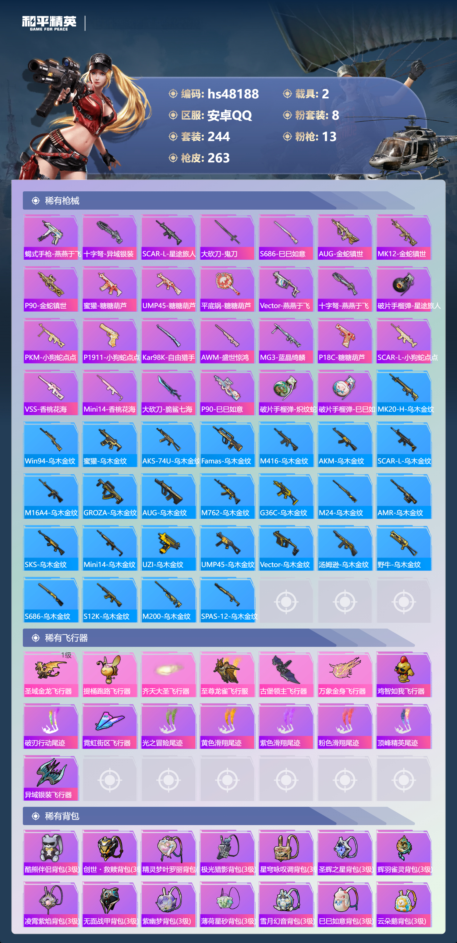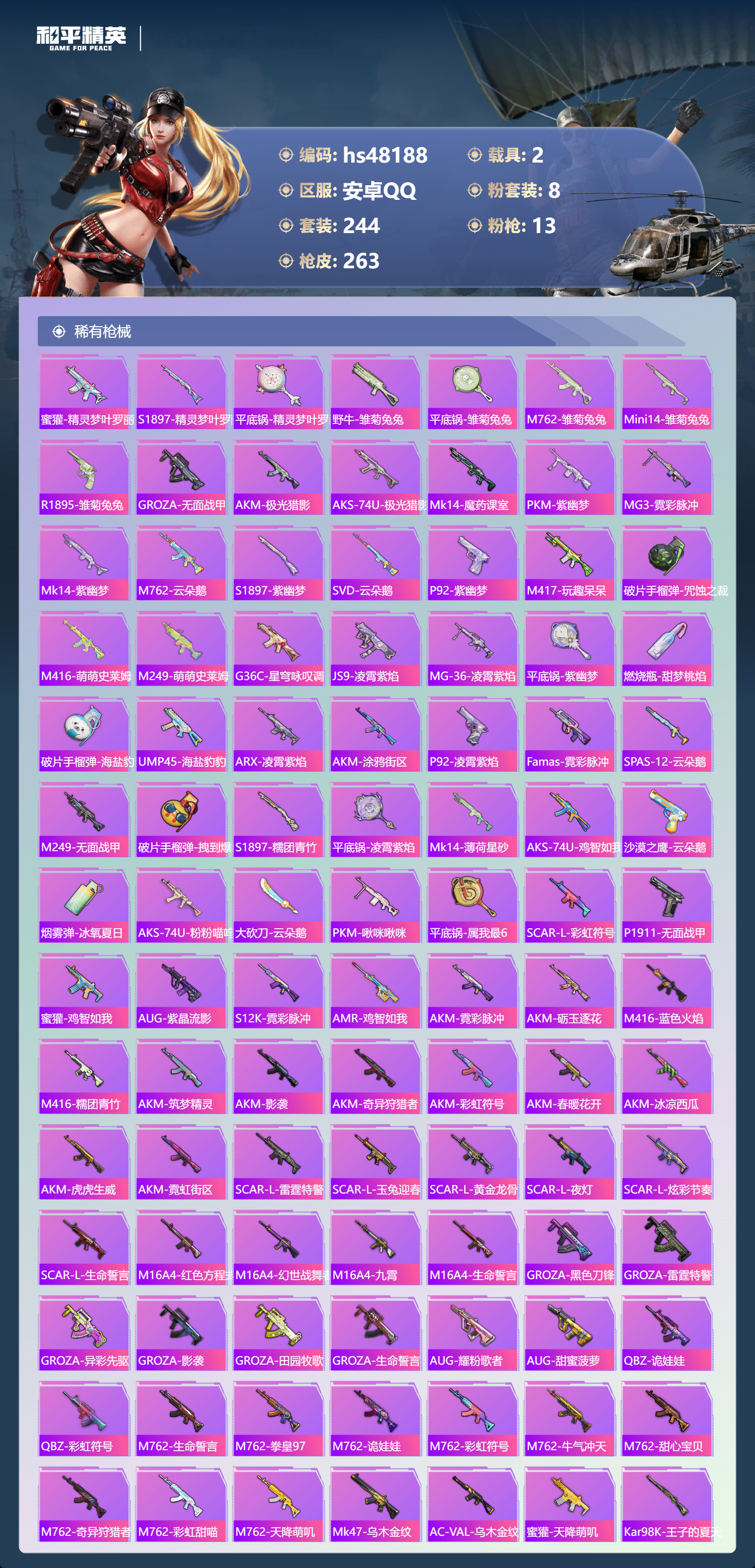 【11174871】【不可二次】【安卓QQ】S686-奇异狩猎者 M416-五爪金龙 漫步者 都市猎人 M24-奇异狩猎者 M249-古堡领主 特斯拉3银色 至尊龙雀飞行服 极速红龙 M762-奇异狩猎者 浪漫天命 AKM-奇异狩猎者 SS1特训 精灵迷巫 奇异狩猎者 齐天大圣飞行器 黑色刀锋 甜心巧克力 狂沙舞者 金羽特工 繁龙极客 AKM-炫紫旋律 古堡领主 古堡领主飞行器 天使彩虹糖 粉红