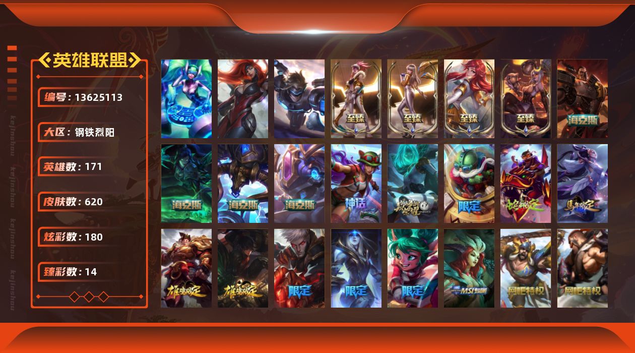 【11177365】[13625113]t30114【钢铁烈阳】原皮龙瞎 620皮肤 180炫彩 14臻彩 10神话/97限定/53传说/171英雄 账号等级:629【重要头像】爱情之歌 觅心游侠卢锡安 周年女刀图标 勇者阿狸炫金 击拳 沐浴震惊 战斗学院悠米炫彩 披萨鸡 送披萨的小姐姐希维尔 征服者韦鲁斯炫金 【重要皮肤】KDA一代卡莎至臻 KDA阿卡丽至臻 战斗学院拉