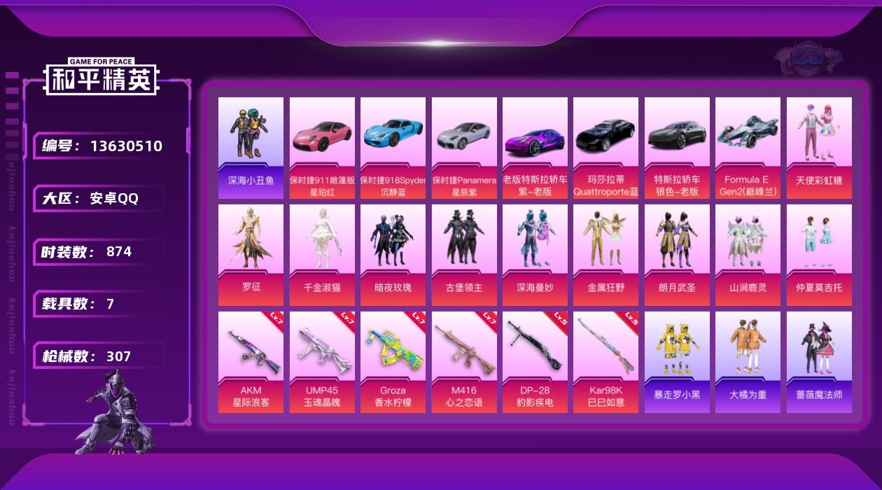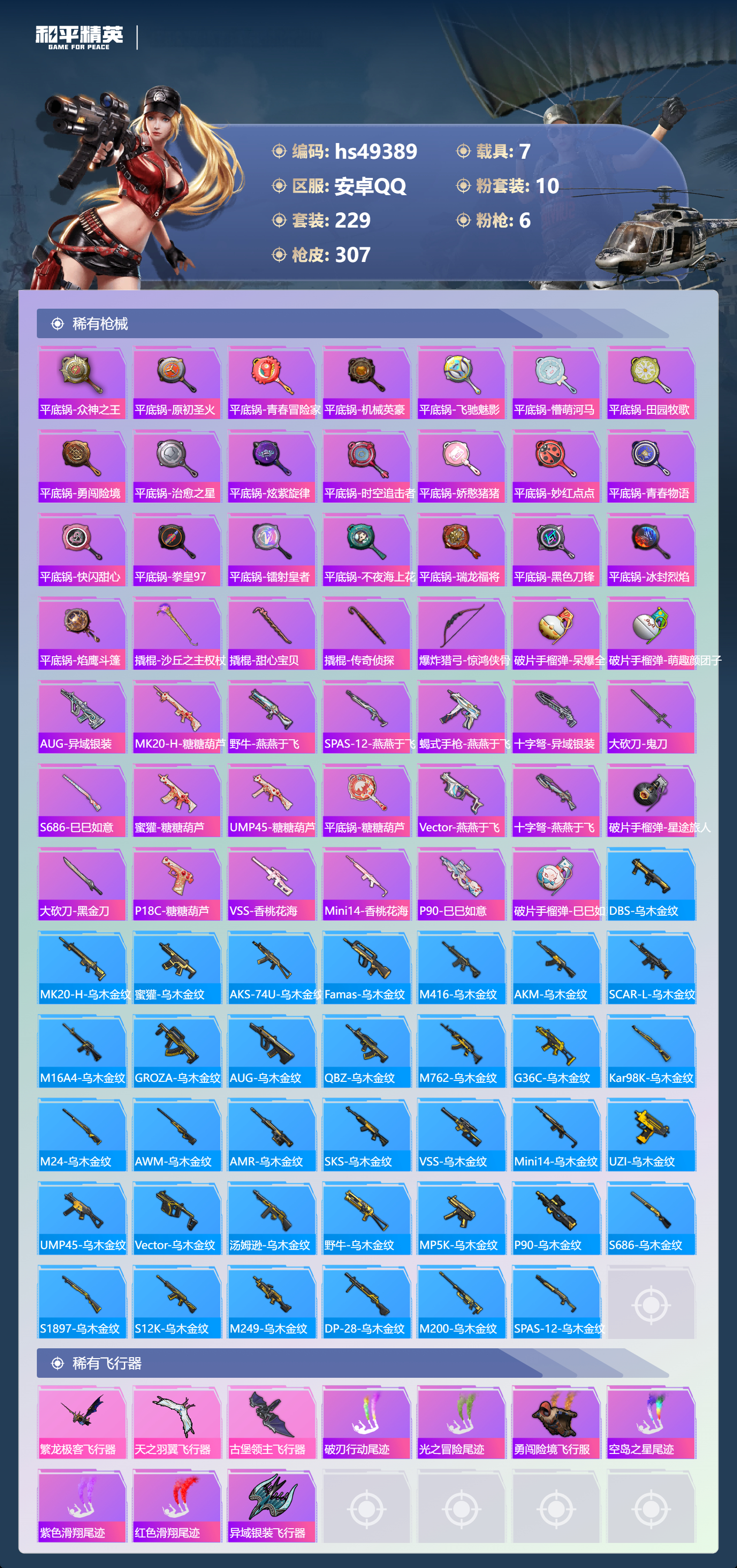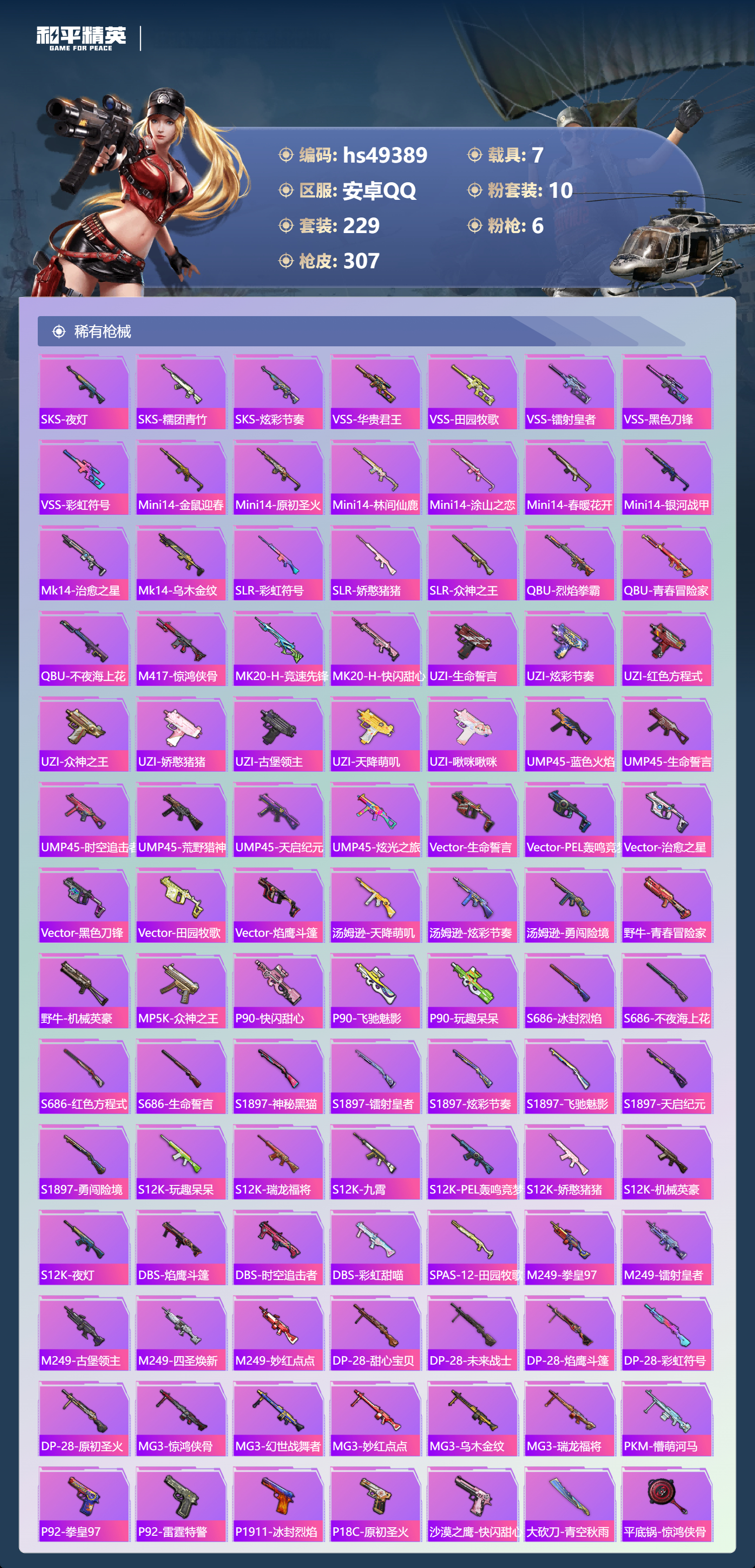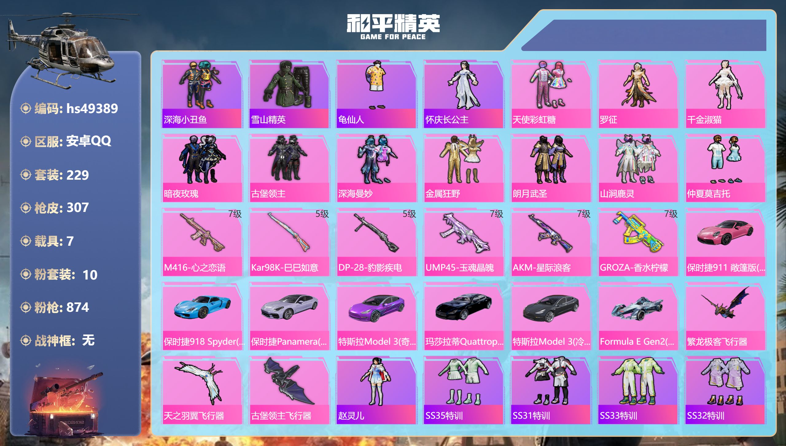 【11178413】【不可二次】【安卓QQ】龟仙人 大橘为重 AKM-星际浪客 M249-古堡领主 特斯拉3银色 机械英豪 金属狂野 极速红龙 忍者信条 Mini14-林间仙鹿 Formula E Gen2(兰) M416-心之恋语 特斯拉3紫色 深海小丑鱼 山涧鹿灵 瑞龙福将 团圆交子 AKM-奇异狩猎者 软萌银虎 深海曼妙 SS1特训 繁龙极客飞行器 UMP45-玉魂晶魄 M762-瑞龙福将