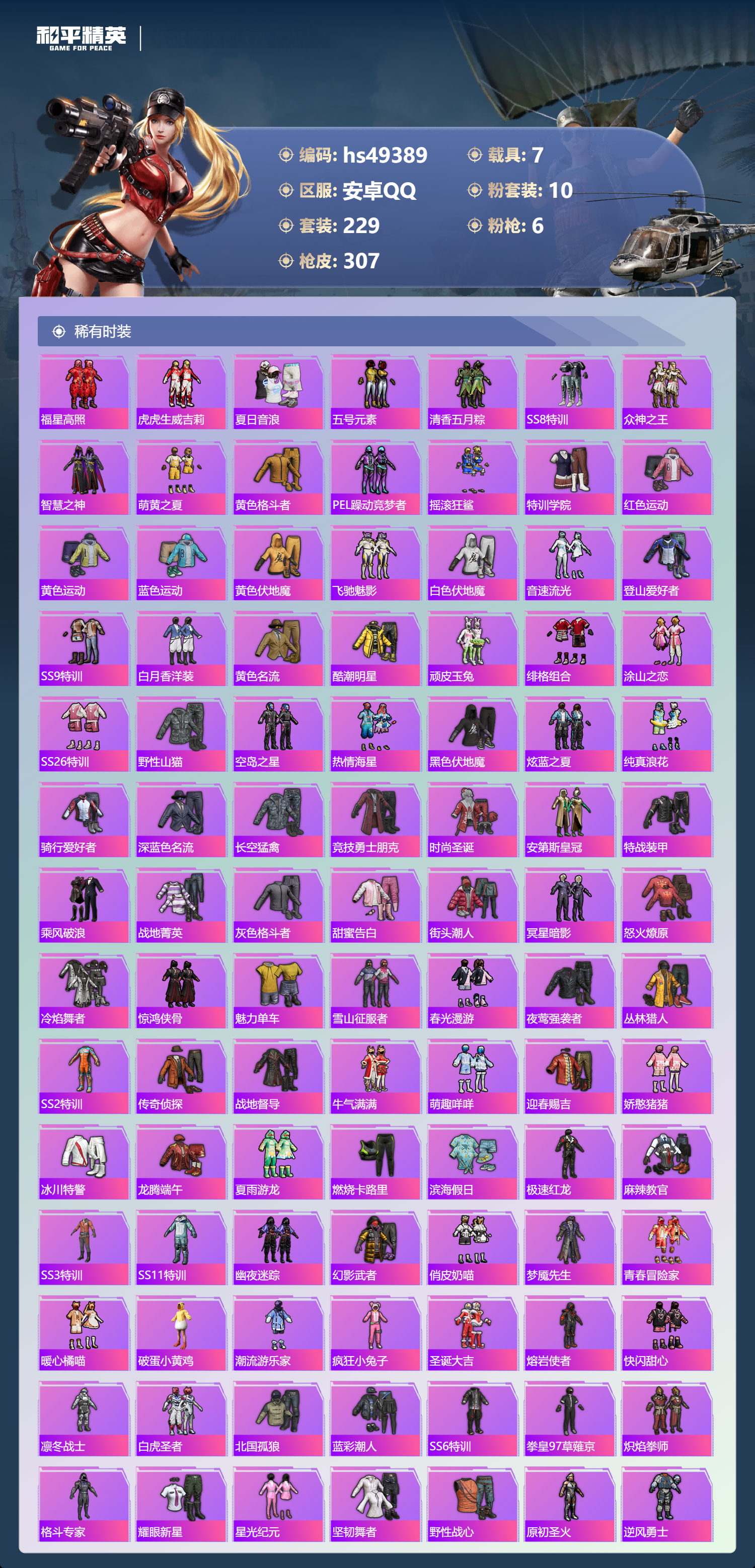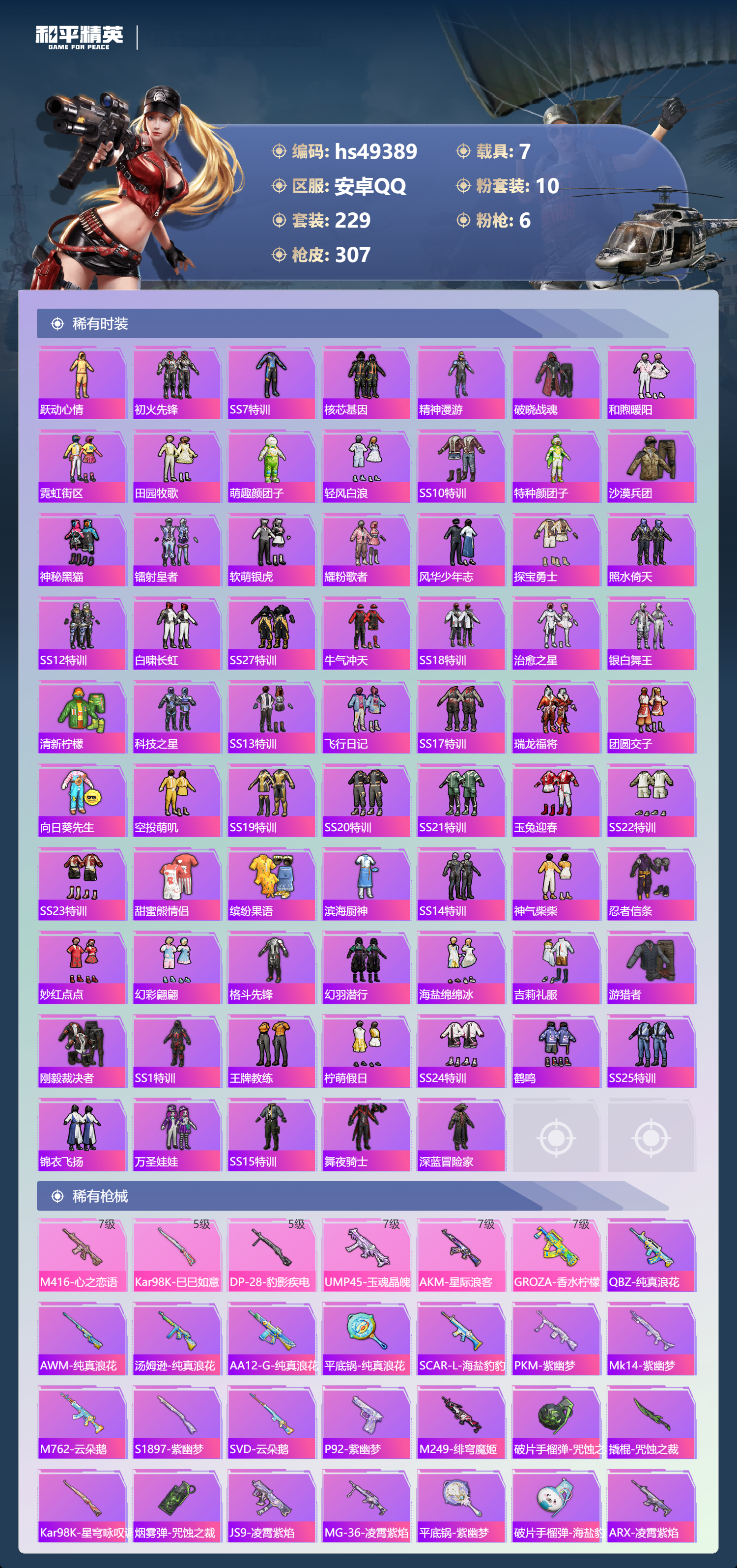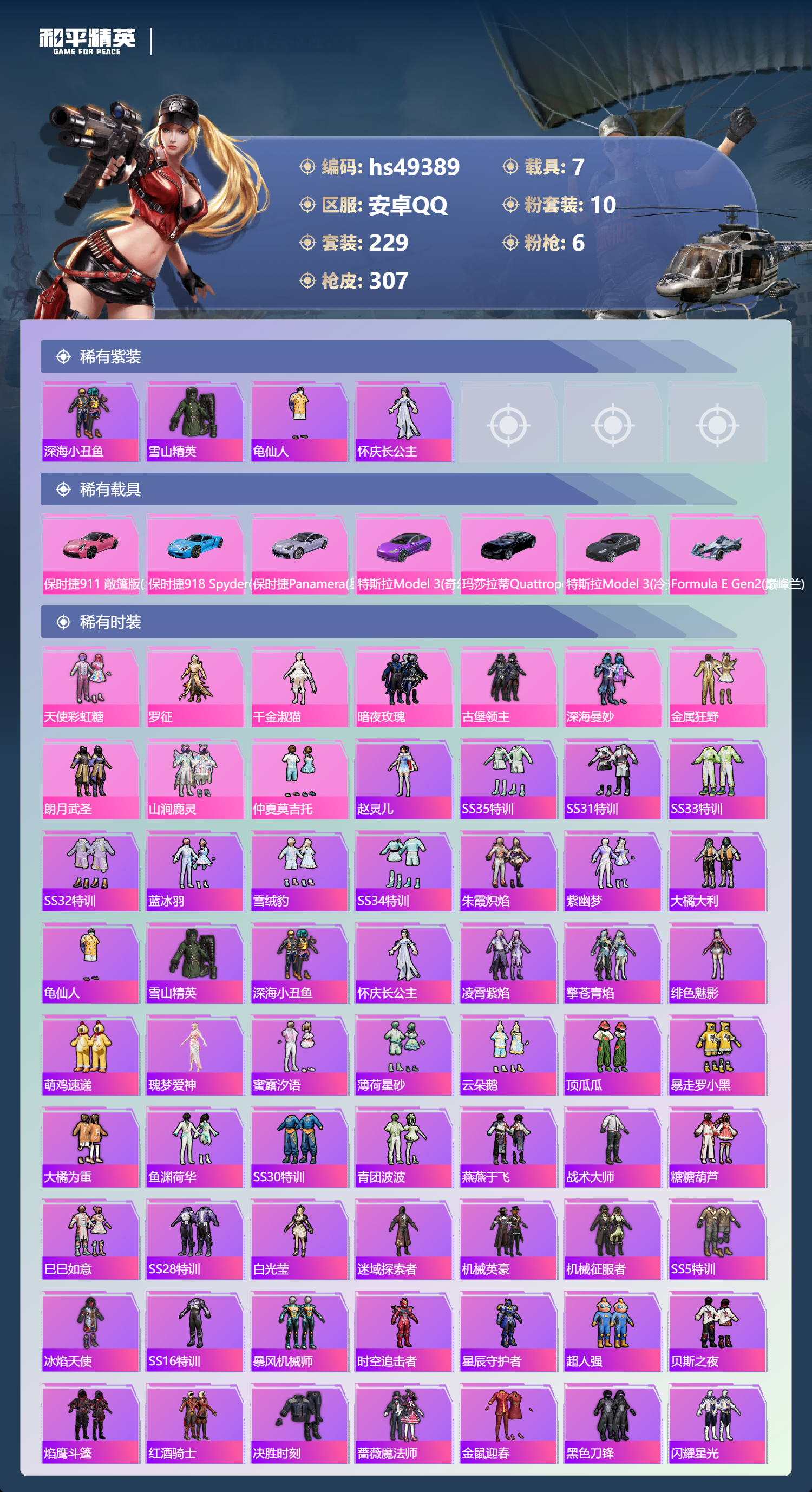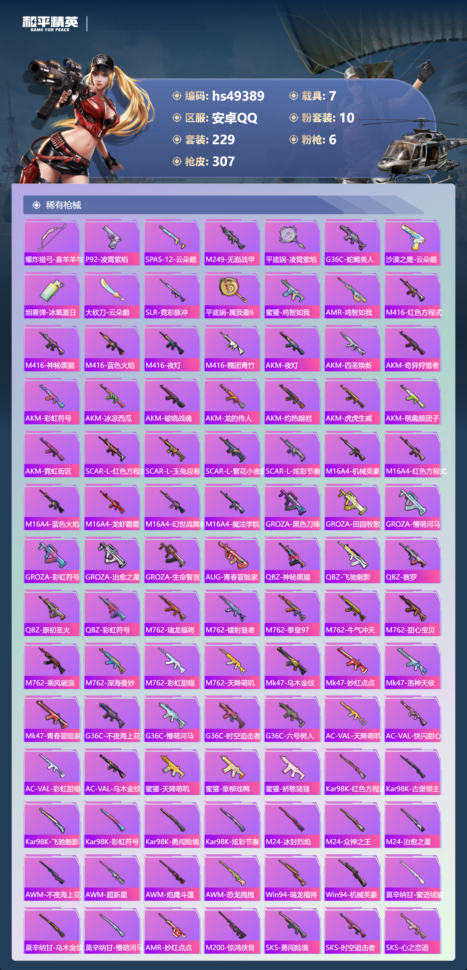 【11178413】【不可二次】【安卓QQ】龟仙人 大橘为重 AKM-星际浪客 M249-古堡领主 特斯拉3银色 机械英豪 金属狂野 极速红龙 忍者信条 Mini14-林间仙鹿 Formula E Gen2(兰) M416-心之恋语 特斯拉3紫色 深海小丑鱼 山涧鹿灵 瑞龙福将 团圆交子 AKM-奇异狩猎者 软萌银虎 深海曼妙 SS1特训 繁龙极客飞行器 UMP45-玉魂晶魄 M762-瑞龙福将