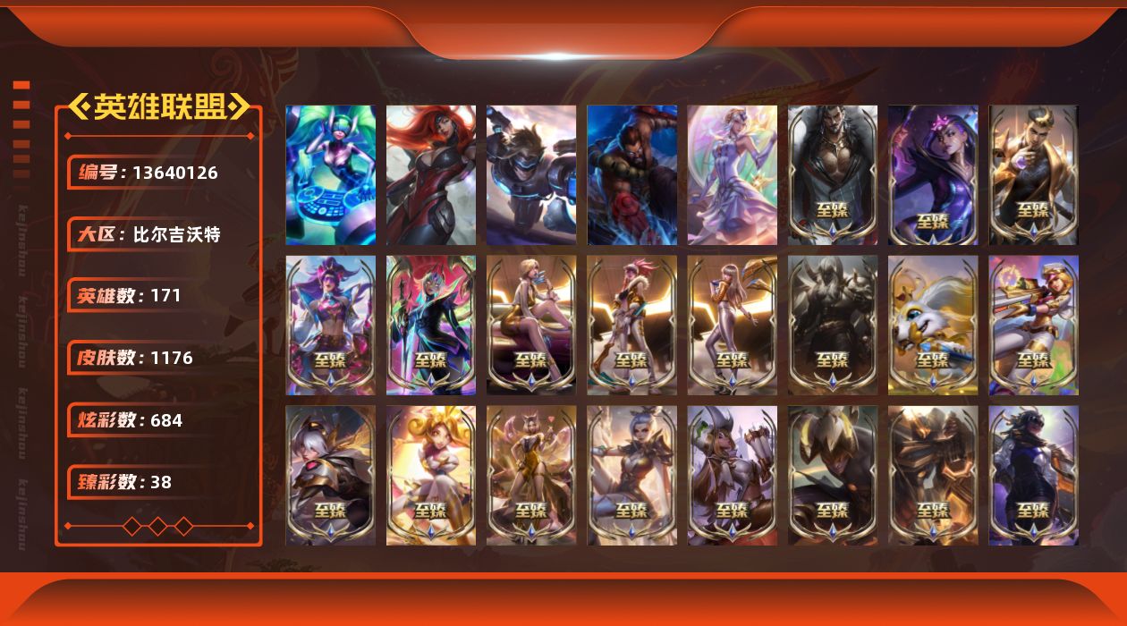 【11180832】[13640126]t30139【比尔吉沃特】1176皮肤 684炫彩 38臻彩 67神话/234限定/97传说/171英雄 账号等级:276 云顶神话:7【重要头像】星守阿狸 爱意绵绵 爱情之歌 心型钥匙 觅心游侠卢锡安 觅心之翼奎因 雪花 两仪无极 我麦是开的么 击拳 救生圈 EDG厄斐琉斯 EDG佛耶戈 EDG格雷福斯 EDG悠米 EDG佐