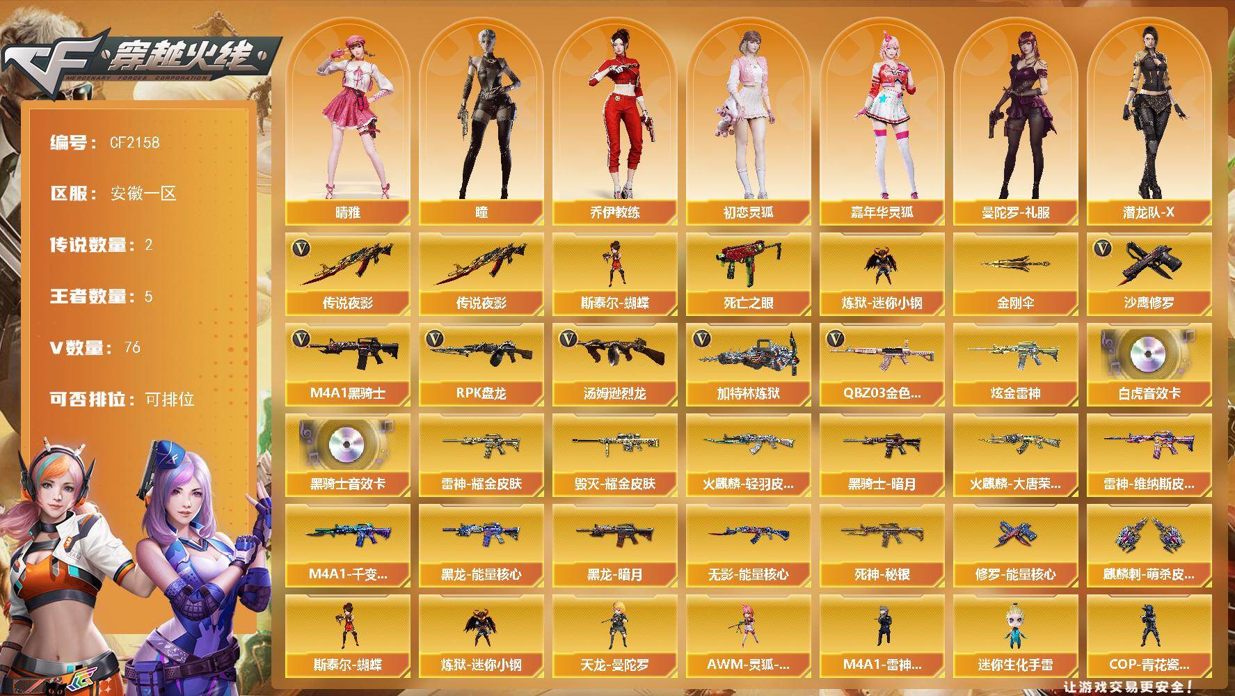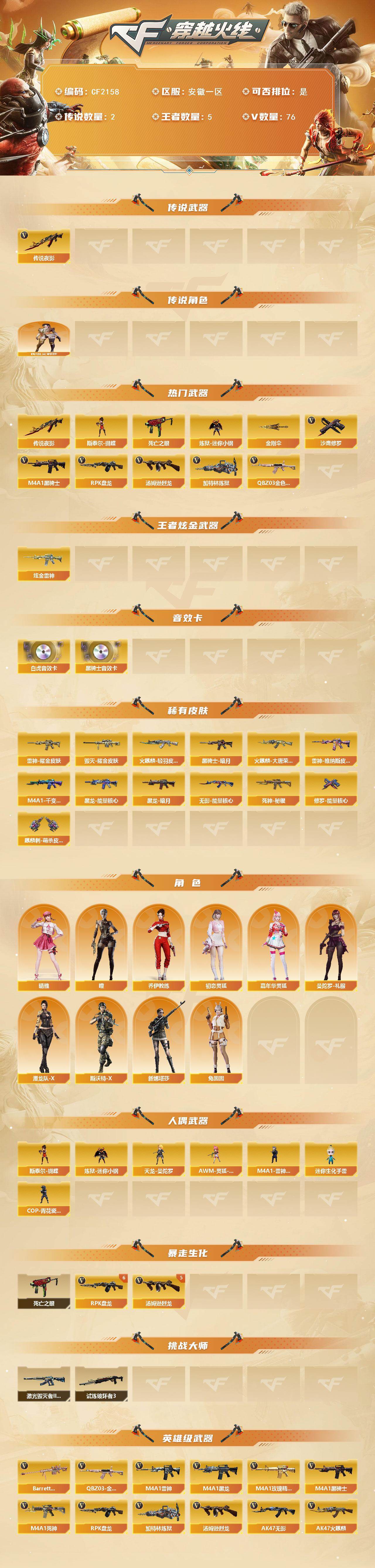 【5258】【5258】【CF2158】【双全号/传说夜影,QBZ03-金色蔷薇*2,死亡之眼,炼狱-迷你小钢,M4A1-黑骑士,汤姆逊-烈龙*5,RPK-盘
