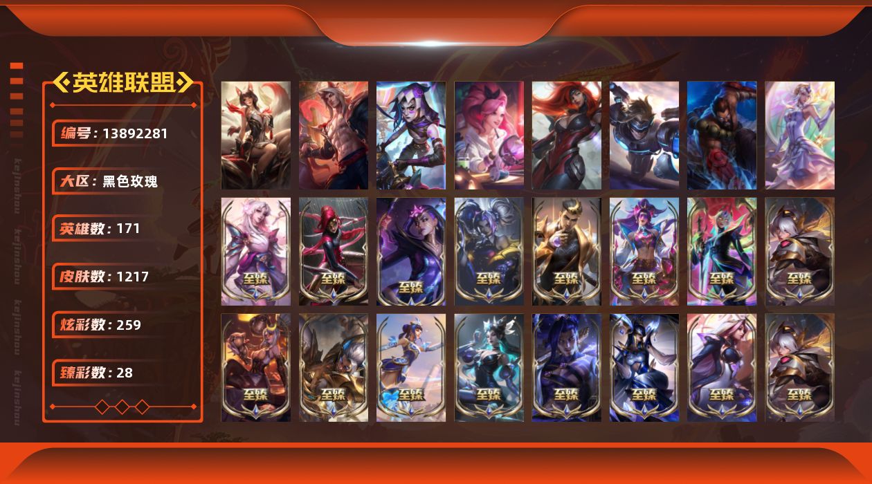 [13892281]Xr43727-服务器黑色玫瑰-无二次-白银段位-171英雄-1217皮肤-259炫彩-5终极-36神话-216限定-120传说-177史诗 【圣堂皮肤】:双城之战2破碎者金克丝,金蛇巨星瑟提,灵魂莲华莫甘娜 【珍稀头像】:至爱的鹿头像 【热门头像】:觅心之翼奎因头像,源计划刀妹头像 【卓越皮肤】:殿堂传奇阿狸 【至臻皮肤】:至臻至高...