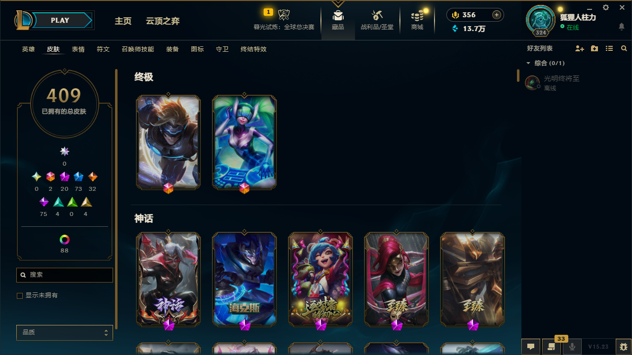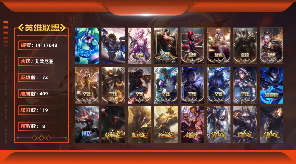 【70648】[14117648]t31148【艾欧尼亚】409皮肤 119炫彩 18臻彩 20神话/73限定/32传说/172英雄 账号等级:324【重要头像】灵魂莲华阿狸 源计划艾瑞莉娅 灵魂莲华卡西奥佩娅 真实伤害奇亚娜 【重要皮肤】机神玄武盖伦至臻 灵魂莲华拉克丝至臻 凯旋将军德莱厄斯至臻 黑色玫瑰假面舞会卡特琳娜至臻 西部魔影伊芙琳至臻 DRX亚托克斯至臻 至高天奎