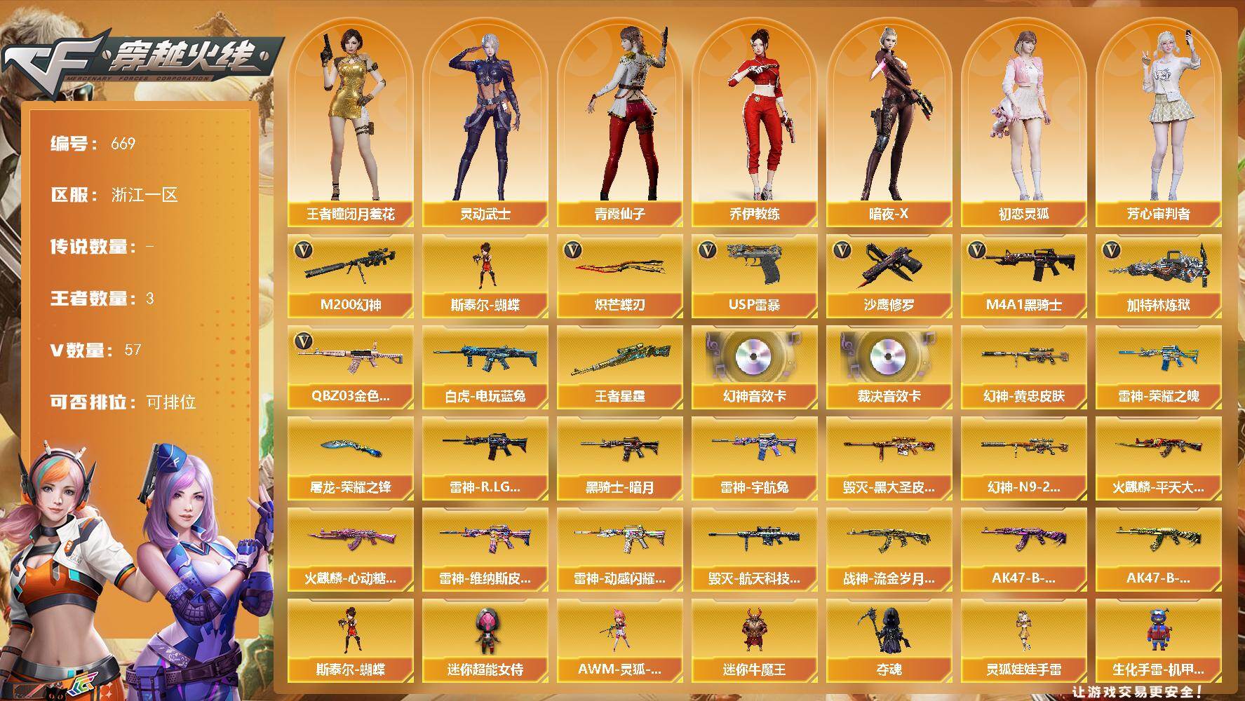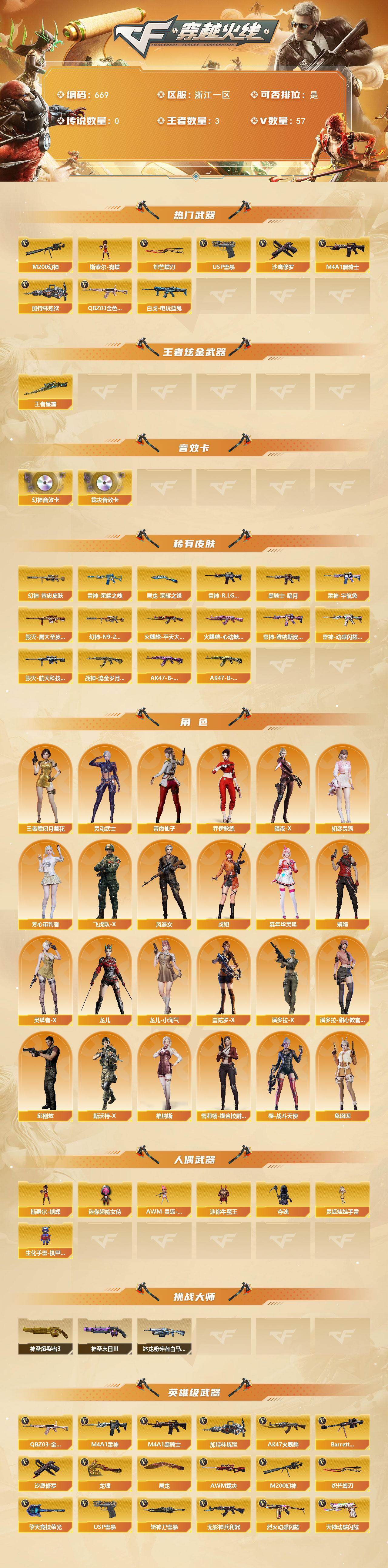 【89889】【89889】浙江一区-57V-3王者-0炫金【热门武器】:QBZ03-金色蔷薇,M200-幻神,白虎-电玩蓝兔,M4A1-黑骑士,加特林-炼狱