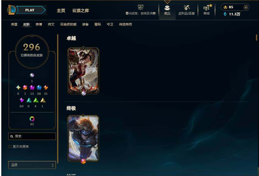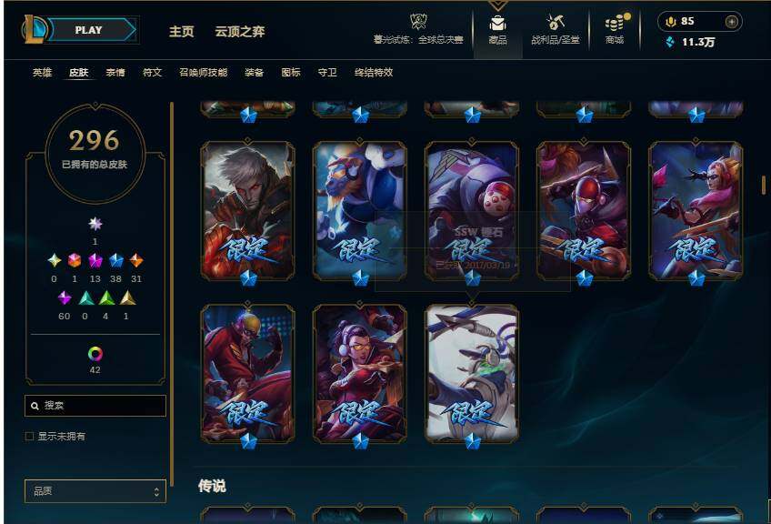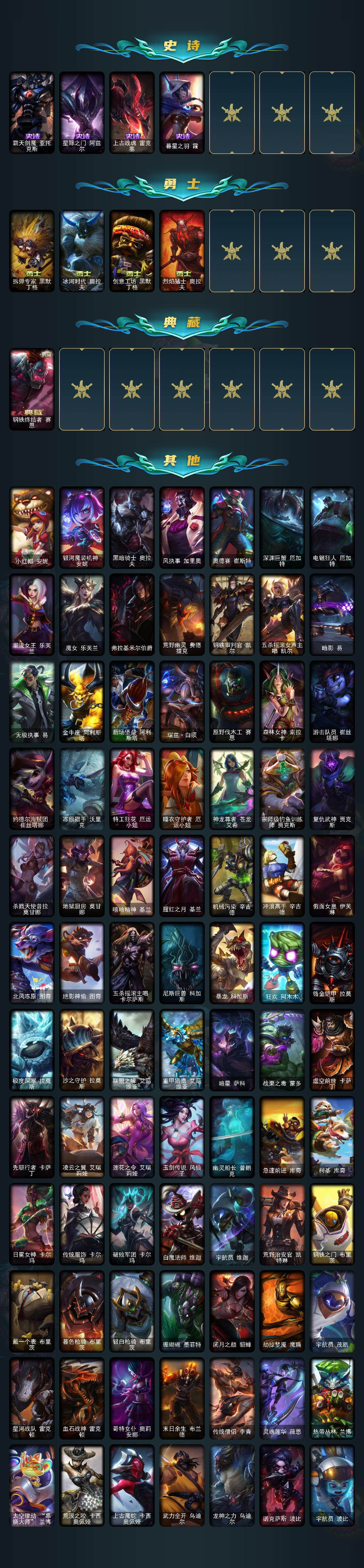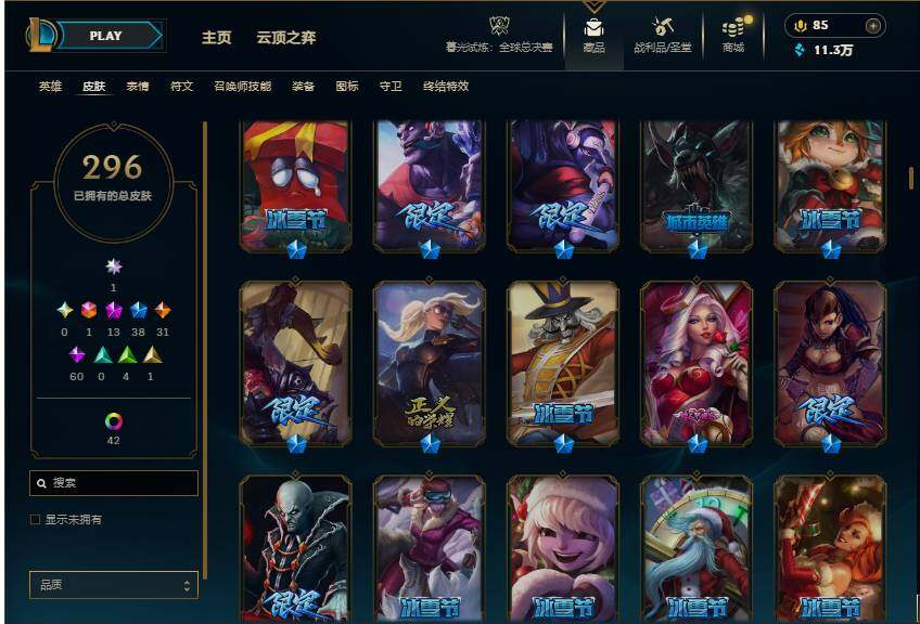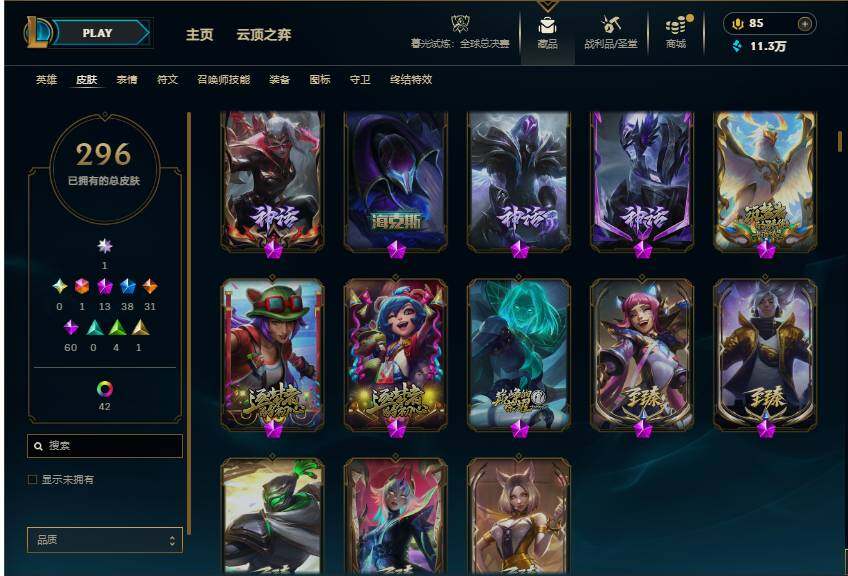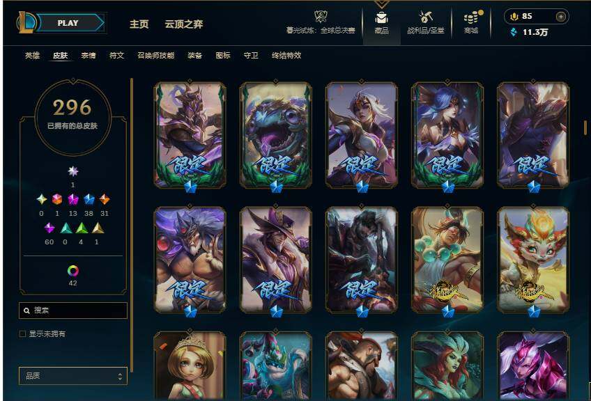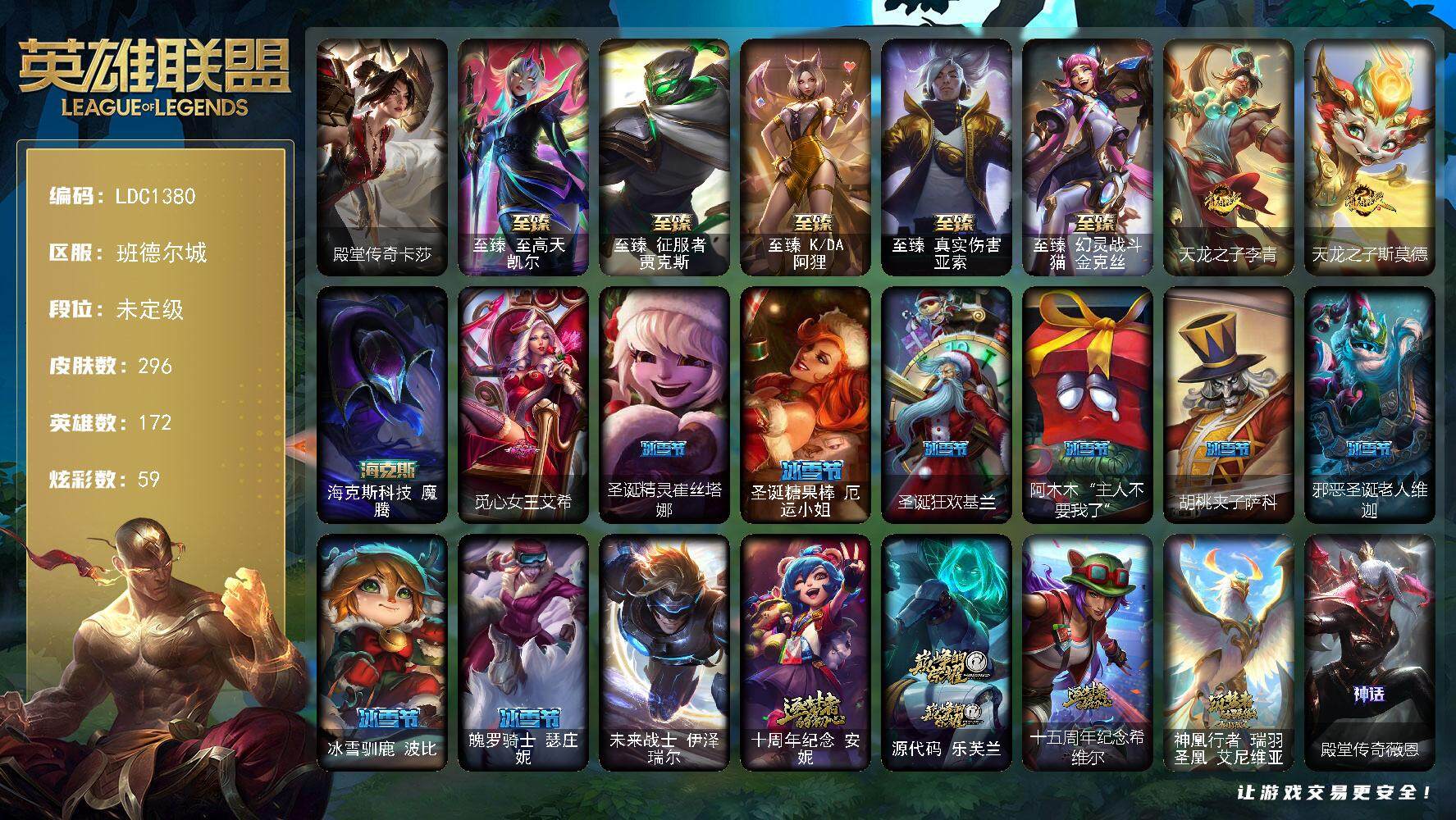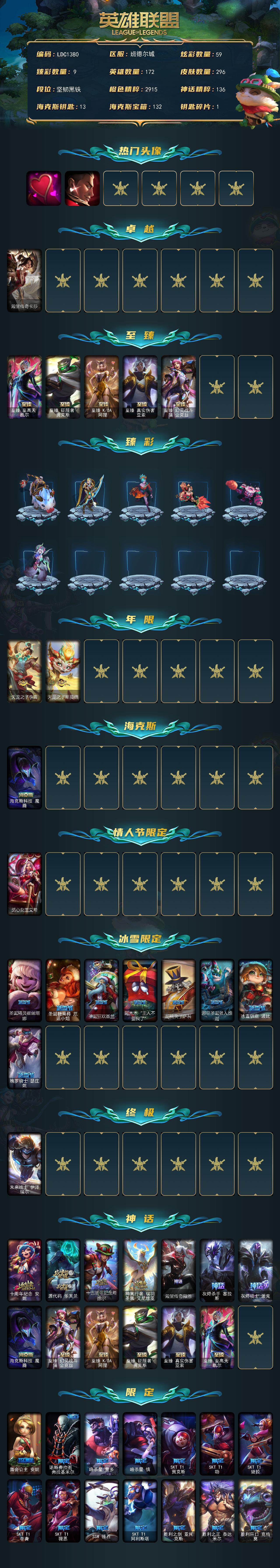 【113410】【LDC1380】172英雄/296皮肤/1终极/13神话/38限定/9臻彩/59炫彩/31传说/60史诗/未定级/爱意绵绵/觅心游侠卢锡安/殿堂传奇卡莎/至臻至高天凯尔/至臻征服者贾克斯/至臻K/DA阿狸/至臻真实伤害亚索/至臻幻灵战斗猫金克丝/无畏骑士瑟庄妮赤子初心/冠军之箭艾希凯旋圣装/斗魂觉醒拉克丝无限斗志/灵魂莲华锐雯流火/玉剑传说寒潭夭夭胭脂/可爱可爱粉红红布里茨/魔