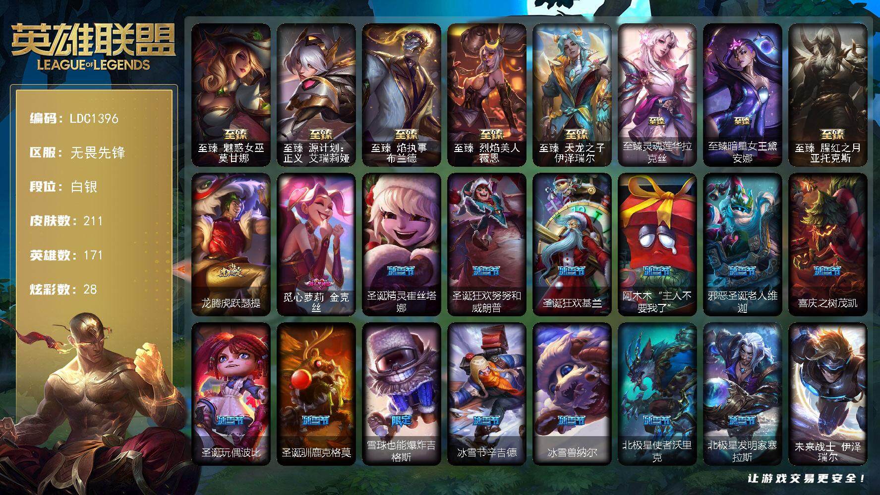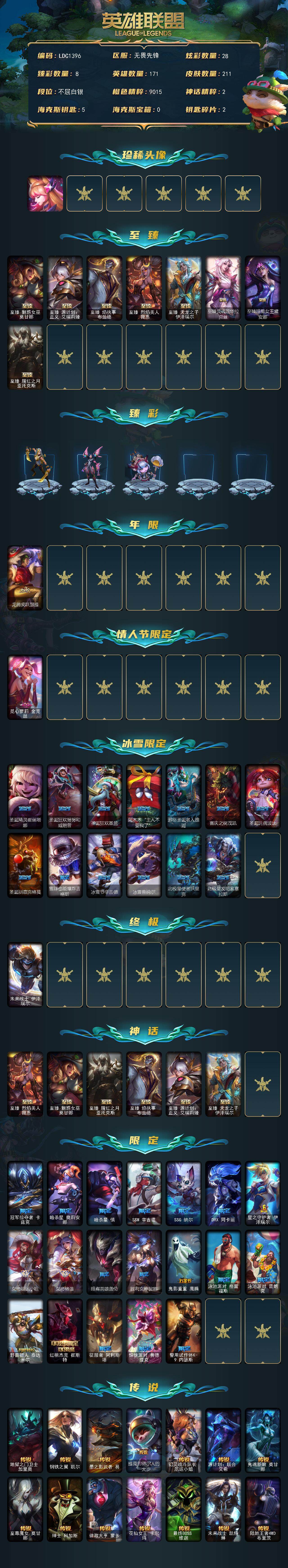 【122921】【LDC1396】171英雄/211皮肤/1终极/8神话/34限定/8臻彩/28炫彩/32传说/30史诗/白银/星守阿狸/至臻魅惑女巫莫甘娜/至臻源计划:正义艾瑞莉娅/至臻焰执事布兰德/至臻烈焰美人薇恩/至臻天龙之子伊泽瑞尔/至臻灵魂莲华拉克丝/至臻暗星女王黛安娜/至臻腥红之月亚托克斯/闭月之颜貂蝉炫金莲华/弹幕天使卡莎炽天使勇敢/战斗学院卡特琳娜盛典礼服/咖啡甜心璐璐焦糖布丁/