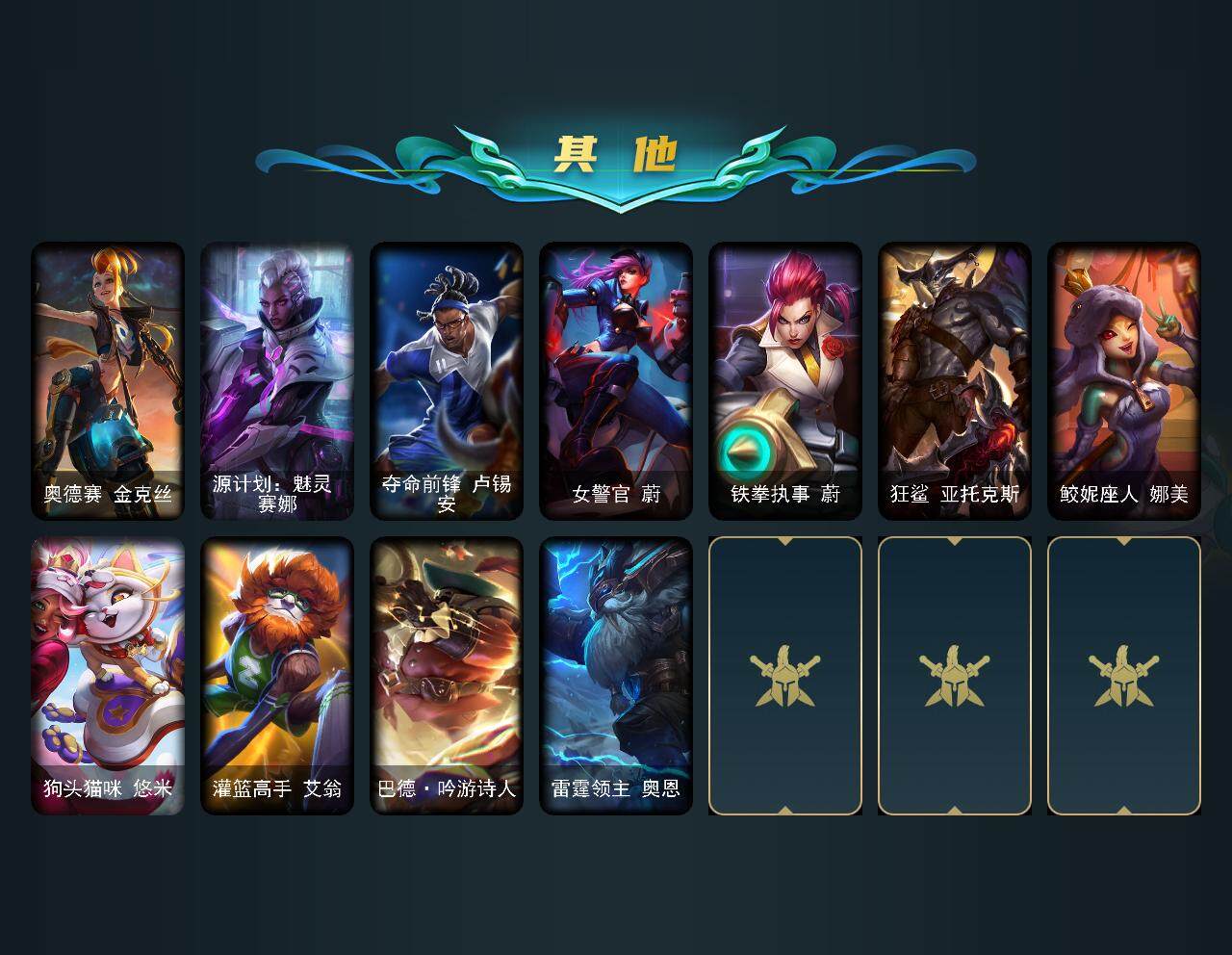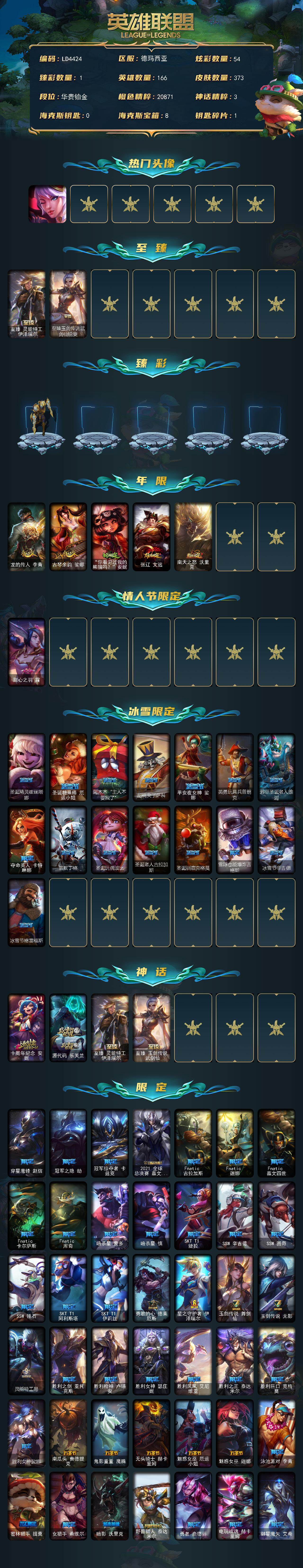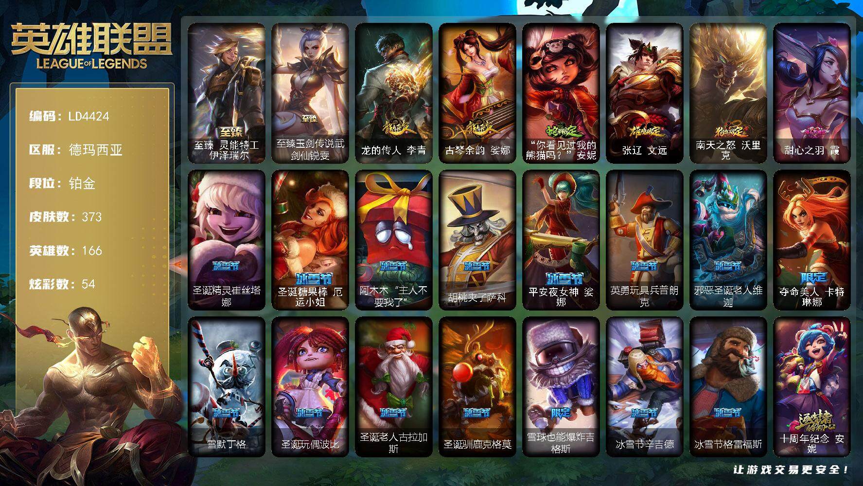 【125126】【LD4424】166英雄/373皮肤/4神话/68限定/1臻彩/54炫彩/30传说/94史诗/铂金/觅心之翼奎因/至臻灵能特工伊泽瑞尔/至臻玉剑传说武剑仙/冠军之隐劫凯旋圣装/龙的传人李青/古琴余韵娑娜/“你看见过我的熊猫吗?”安妮/张辽文远/南天之怒沃里克/甜心之羽霞/圣诞精灵崔丝塔娜/圣诞糖果棒厄运小姐/阿木木:“主人不要我了”/胡桃夹子萨科/平安夜女神娑娜/英勇玩具兵普朗
