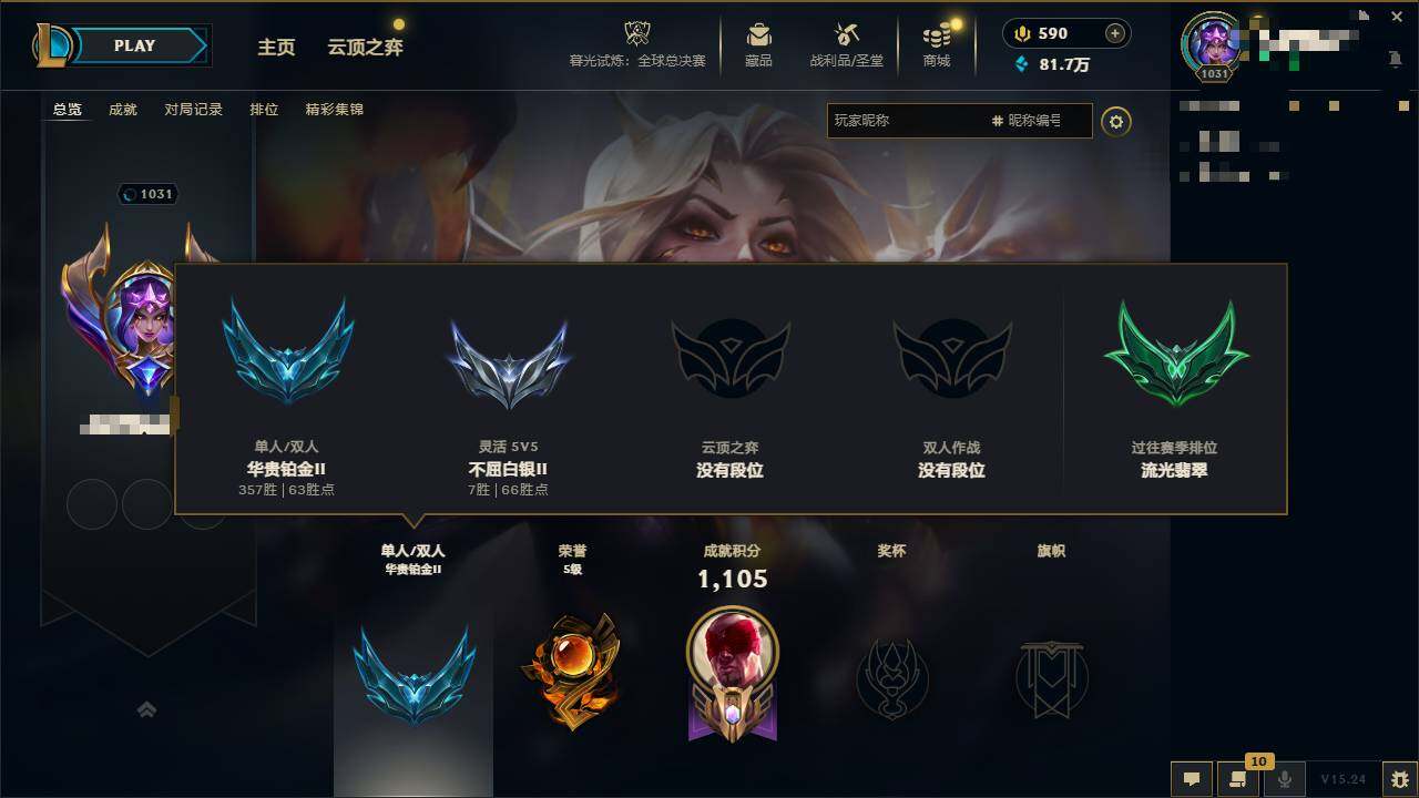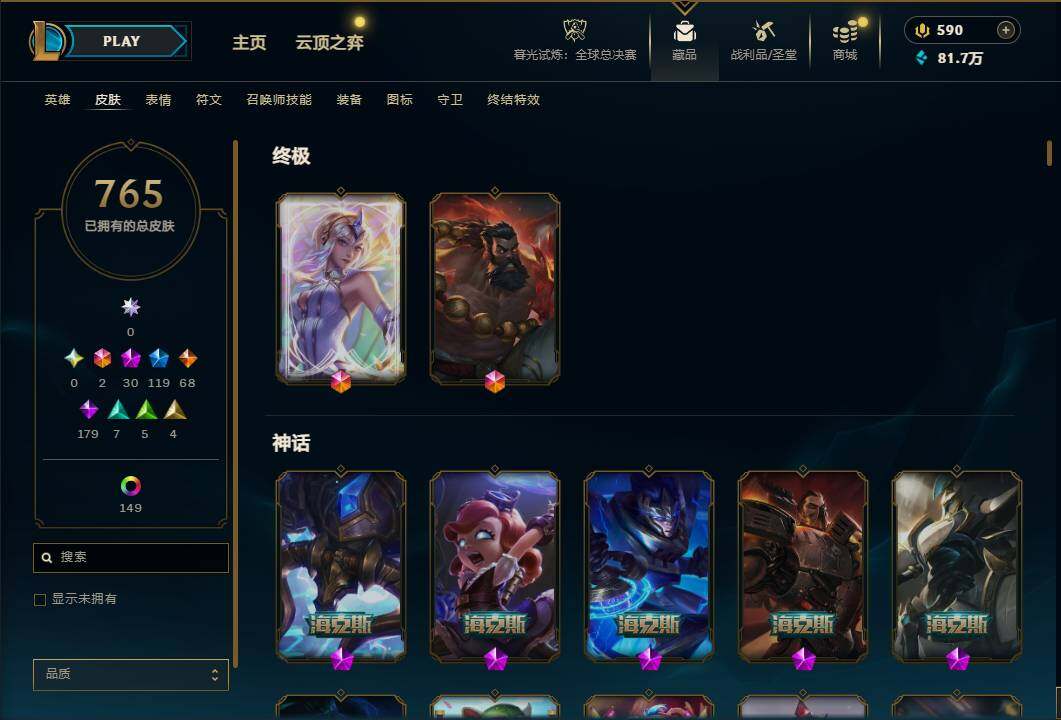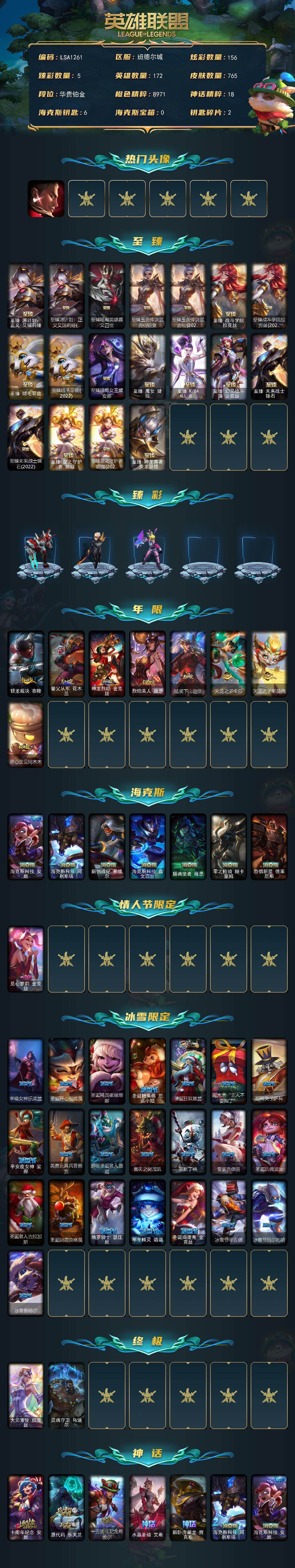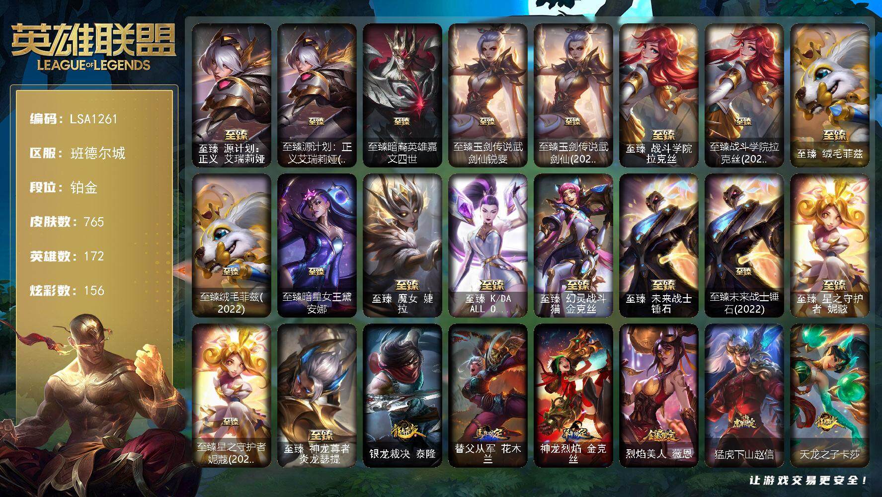 【125816】【LSA1261】172英雄/765皮肤/2终极/30神话/119限定/5臻彩/156炫彩/68传说/179史诗/铂金账号等级:1031/觅心游侠卢锡安/至臻源计划:正义艾瑞莉娅/至臻源计划:正义艾瑞莉娅(2022)/至臻暗裔英雄嘉文四世/至臻玉剑传说武剑仙/至臻玉剑传说武剑仙(2022)/至臻战斗学院拉克丝/至臻战斗学院拉克丝(2022)/至臻绒毛菲兹/至臻绒毛菲兹(2022)
