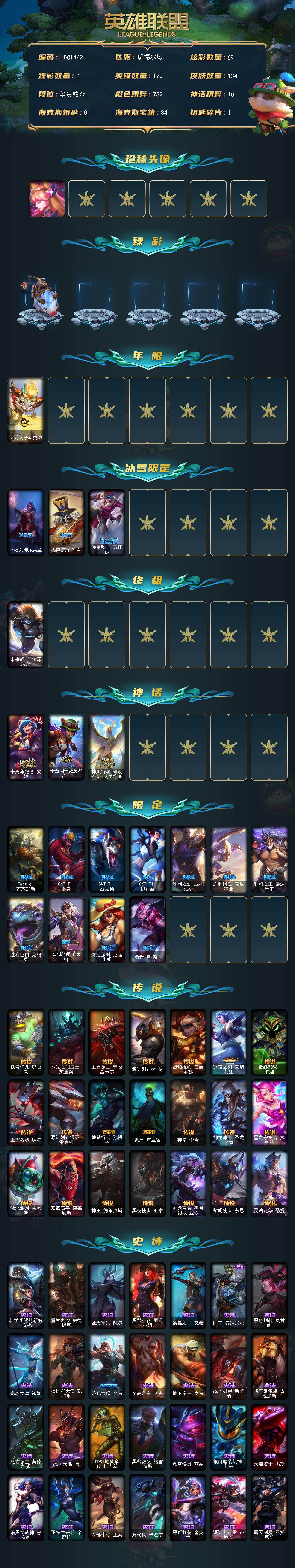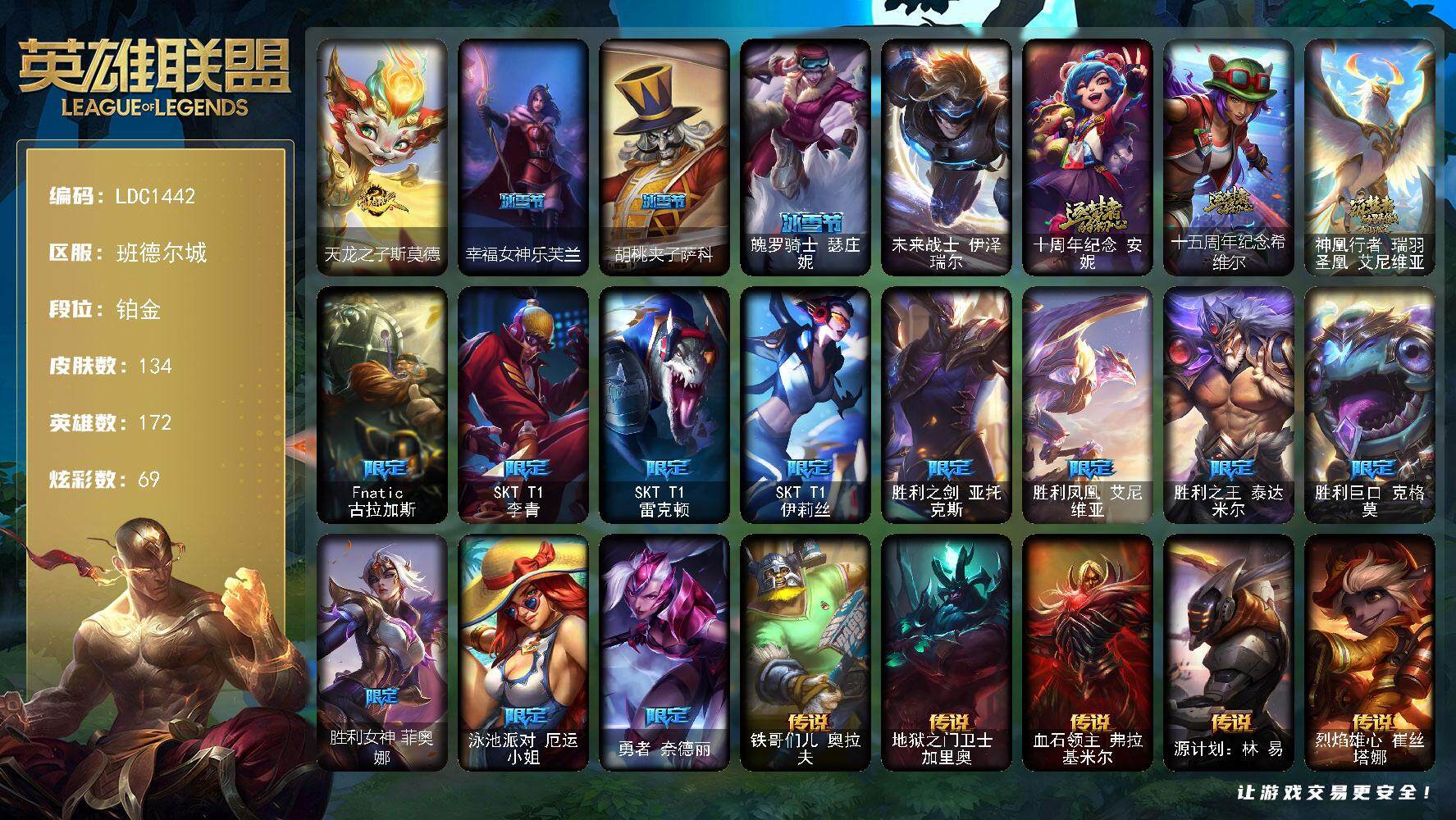 【126455】【LDC1442】172英雄/134皮肤/1终极/3神话/15限定/1臻彩/69炫彩/21传说/31史诗/铂金账号等级:618/星守阿狸/无畏骑士瑟庄妮赤子初心/天龙之子斯莫德/幸福女神乐芙兰/胡桃夹子萨科/魄罗骑士瑟庄妮/未来战士伊泽瑞尔/十周年纪念安妮/十五周年纪念希维尔/神凰行者瑞羽凤凰艾尼维亚/Fnatic古拉加斯/SKTT1李青/SKTT1雷克顿/SKTT1伊莉丝/胜利