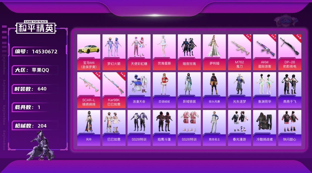 【137424】【不可二次】【苹果QQ】水银刺客 AKM-星际浪客 M762-瑞龙福将 韶华初心 黑色刀锋 极速红龙 M762-潮萌小黄鸭 SCAR-L-锦绣绵绵 梦幻火箭 暗夜玫瑰 天使彩虹糖 锦绣火鲤飞行器 神秘黑猫飞行器 瑞龙福将 浪漫天命 雪山精英 团圆交子