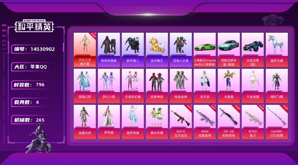 【137508】【不可二次】【苹果QQ】合金龙骨蓝色 龟仙人 S686-奇异狩猎者 雪国梦幻 M416-五爪金龙 金曜白虎 漫步者 P90-沙丘之主 都市猎人 洛天依 沙丘之主-图卡盟 放客神游 仓鼠灰灰 萌熊伴侣 深海小丑鱼 瑞龙福将 特斯拉R水滴蓝 浪漫天命 团圆交子 AKM-奇异狩猎者 兰博SVJ绿色 星梦玉骢 飓风飞鹰 绚金战神 迅捷狂鲨 奇异狩猎者 M762-瑞龙福将 AKM-炫紫旋律