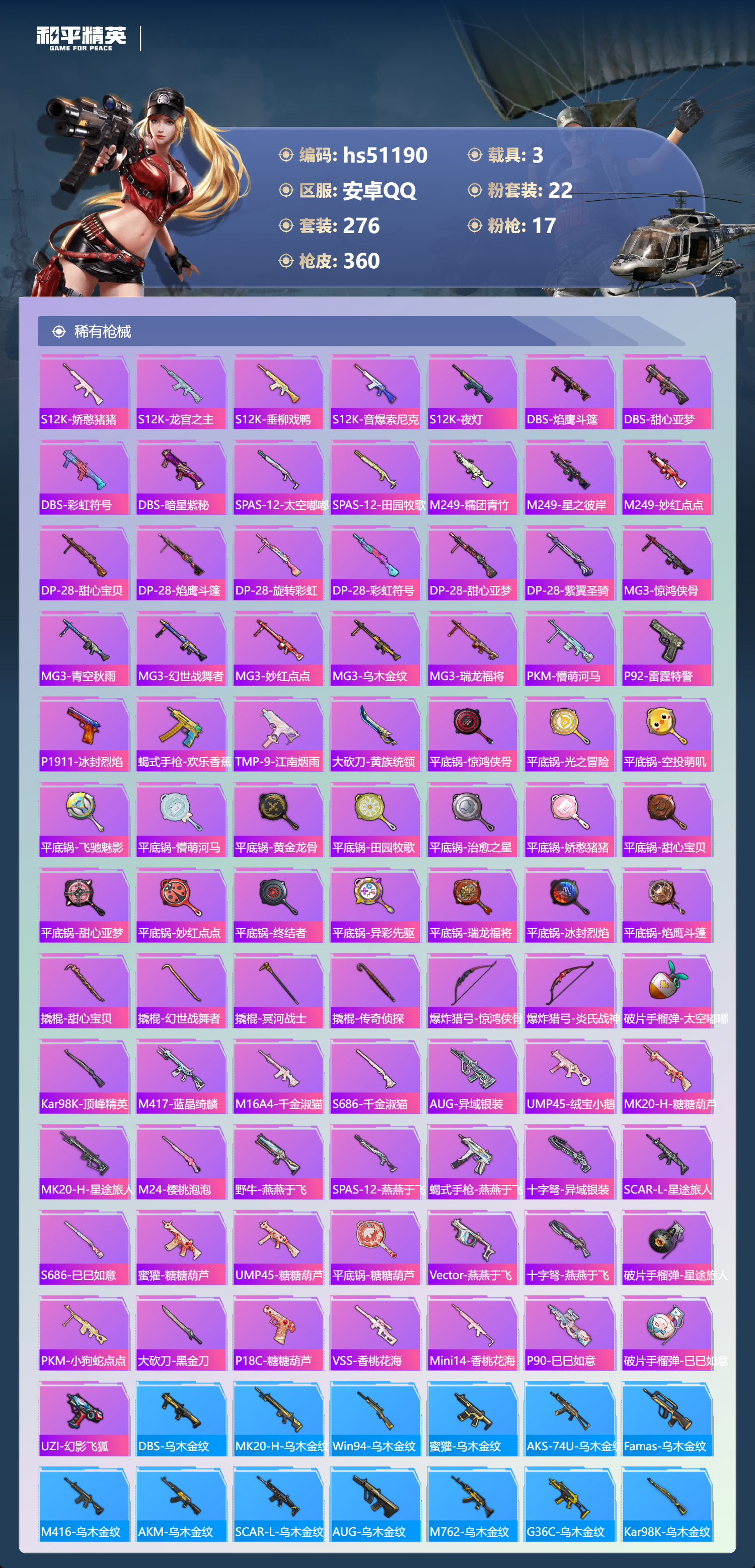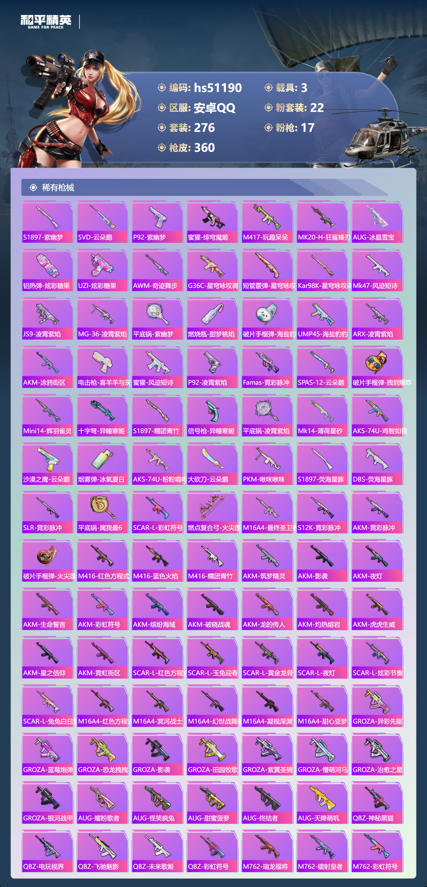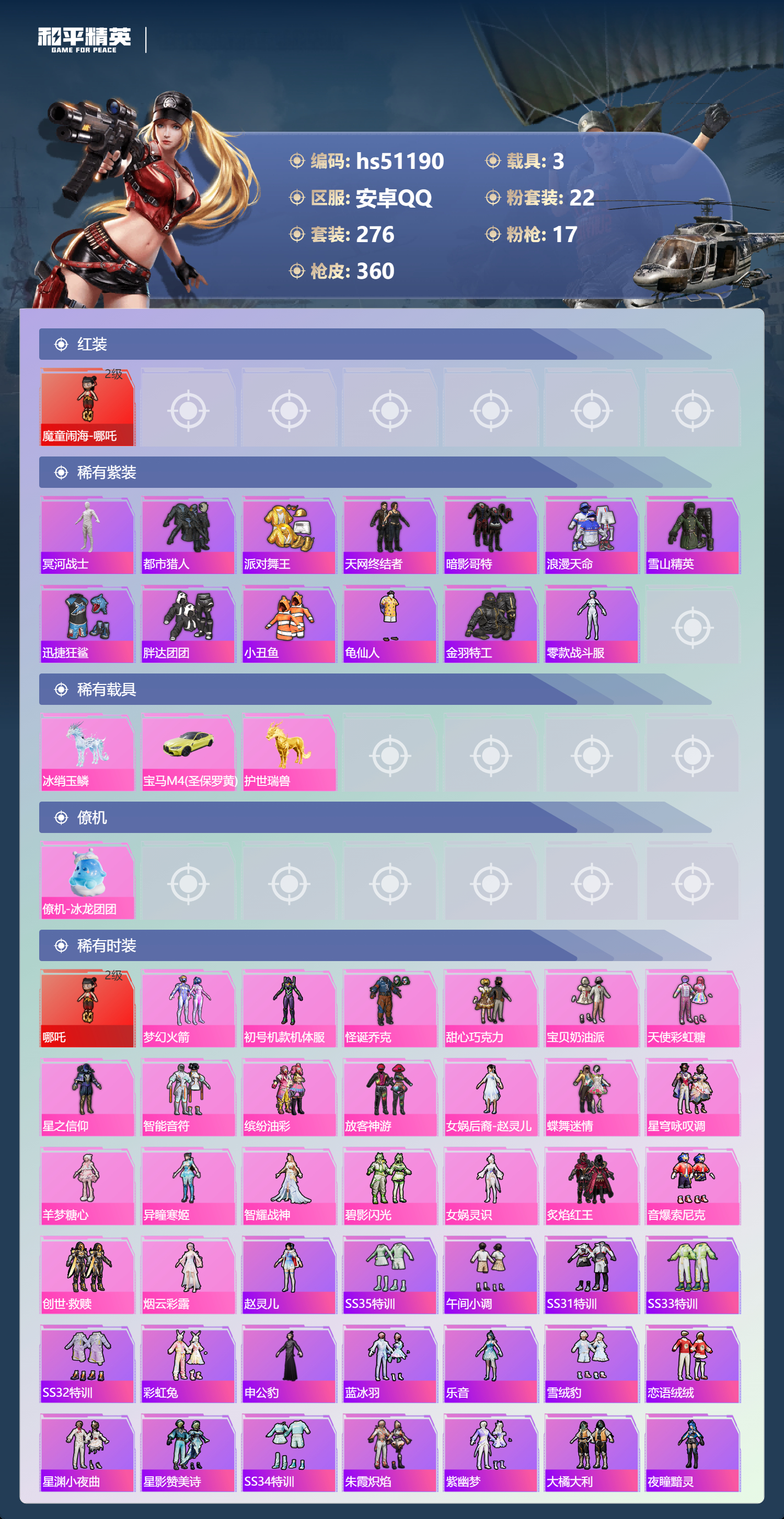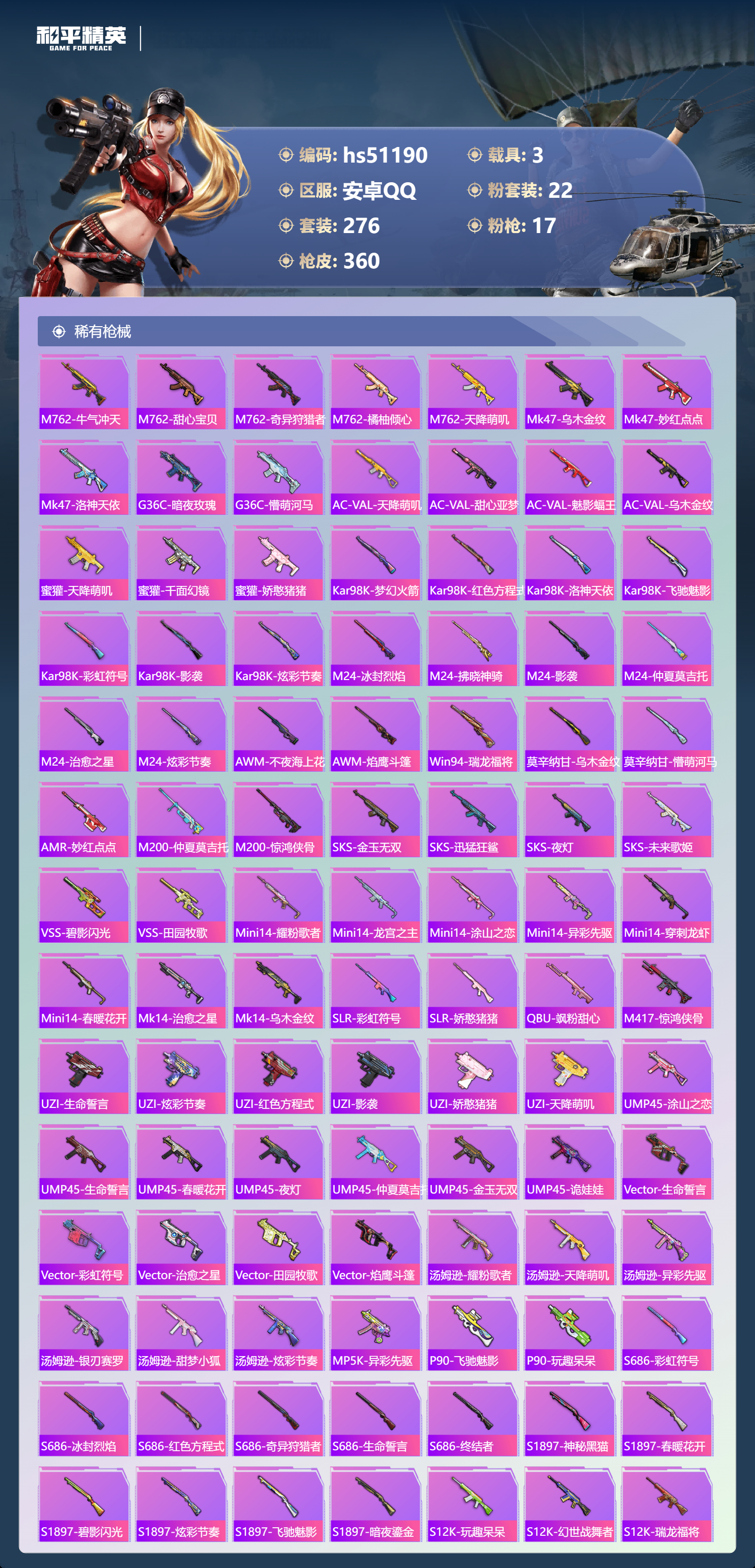 【145852】【不可二次】【安卓QQ】龟仙人 木乃伊 水银刺客 S686-奇异狩猎者 漫步者 都市猎人 炙焰红王 M762-奇异狩猎者 放客神游 UMP45-量子极限 M416-心之恋语 缤纷油彩 碧影闪光 魔童闹海-哪吒 瑞龙福将 智能音符 蝶舞迷情 浪漫天命 AKM-甜心宝贝 胖达团团 纯白誓言 团圆交子 星之信仰 伏魔团飞行器 怪诞乔克 迅捷狂鲨 M762-瑞龙福将 甜心巧克力 龙翔九天