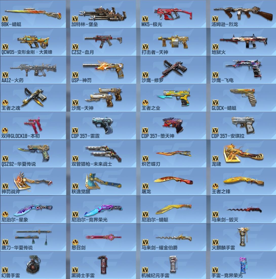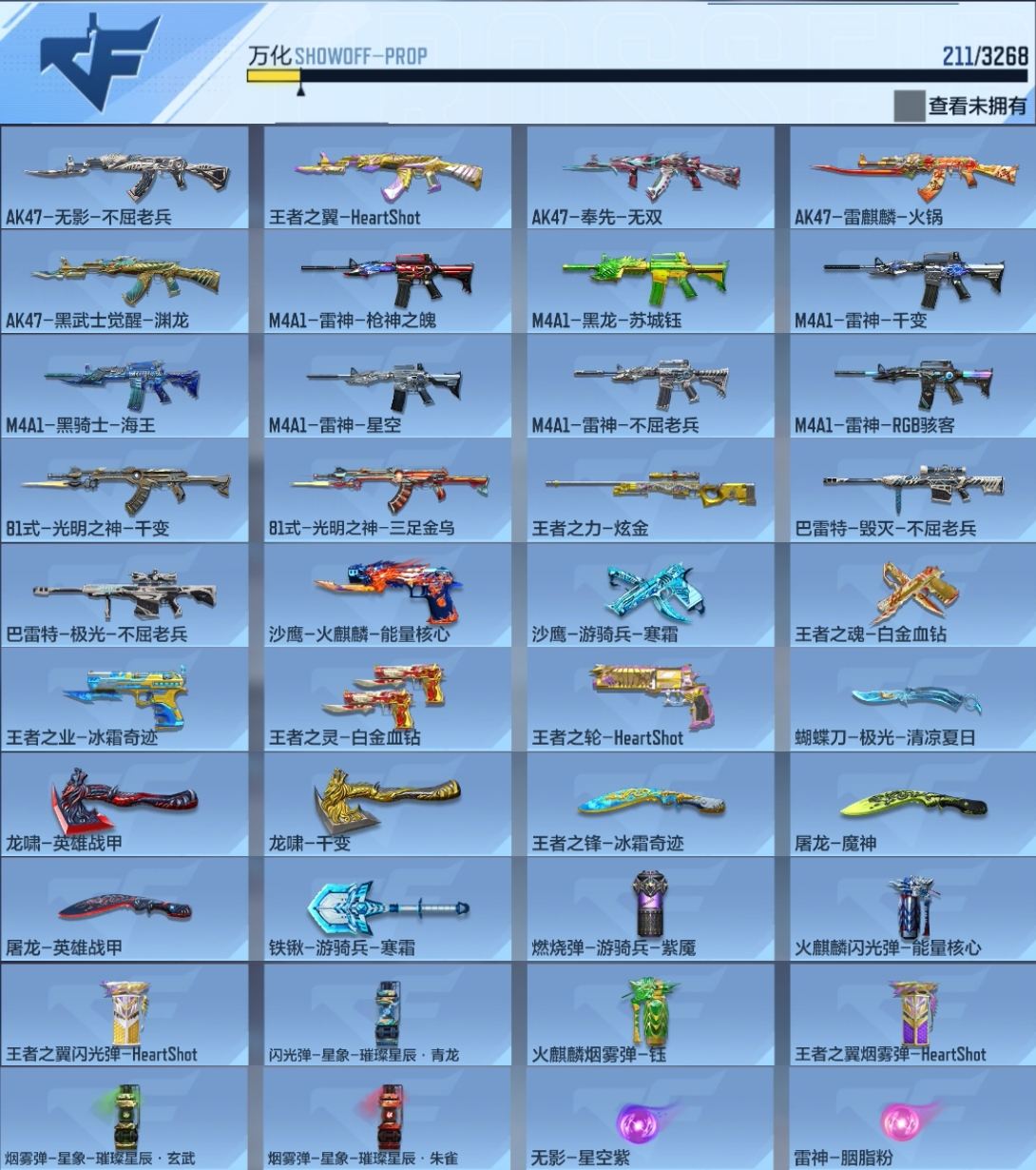 【155772】[14674963]x1095 VIP8,王者武器12,英雄级武器101,万化211,角色19 【王者武器】:闪光弹-雷霆王者/王者之竞闪光弹/王者之业/王者之魂/王者之竞手雷/王者幻神/王者之翼/王者之竞烟雾弹/王者之力/王者之锋/王者之心/M4A1-雷霆王者 ;【热门皮肤】:屠龙-英雄战甲/火麒麟闪光弹-能量核心/AK47-奉先-无双/铁锹-游骑兵-寒霜/沙鹰-火麒麟-能量核