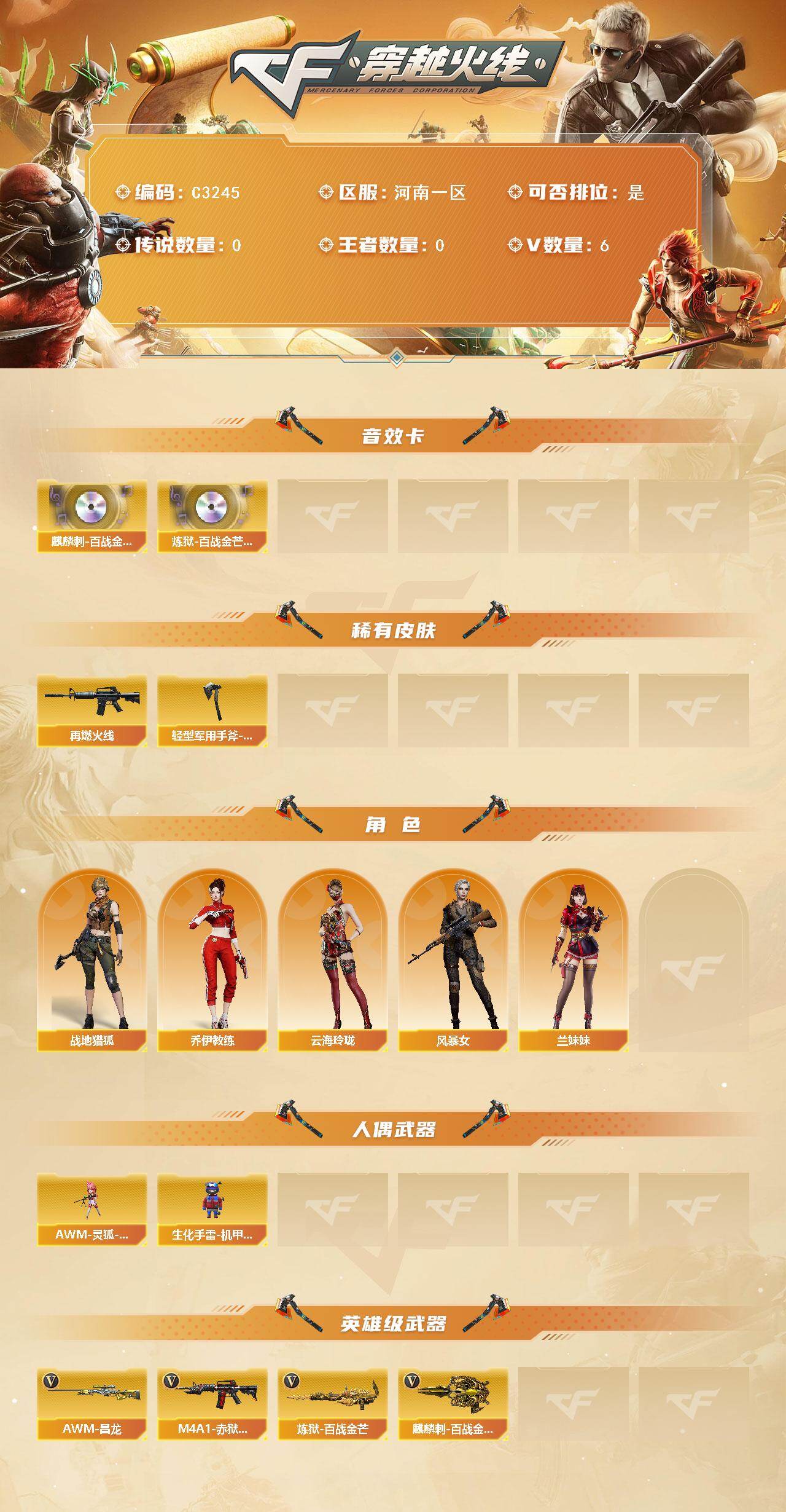 【212744】【212744】【C3245】河南一区-6V-0王者-0炫金【音效卡】:麒麟刺-百战金芒-盛典舞曲音效卡,炼狱-百战金芒-庆典舞曲音效卡【皮肤