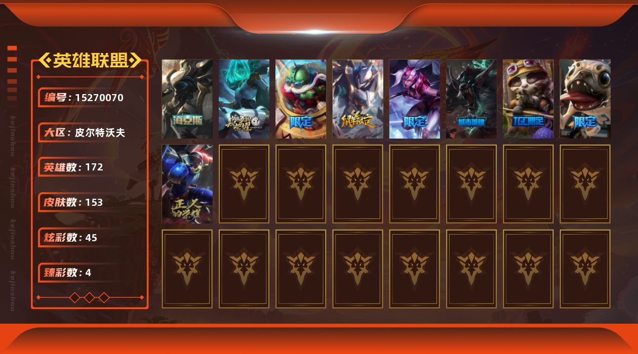 【248777】[15270070]t33602【皮尔特沃夫】 153皮肤 45炫彩 4臻彩 4神话/26限定/12传说/172英雄 账号等级:389 单双排段位:铂金【重要皮肤】零之枪骑赫卡里姆 胜利剑圣易 胜利女神娑娜 胜利女神希维尔 胜利之王泰达米尔 胜利巨口克格莫 电玩勇者锐雯 电玩女神阿狸 胜利女神瑟庄妮 胜利之树茂凯 胜利女神奥莉安娜 胜利枪神格雷福斯 胜利枪