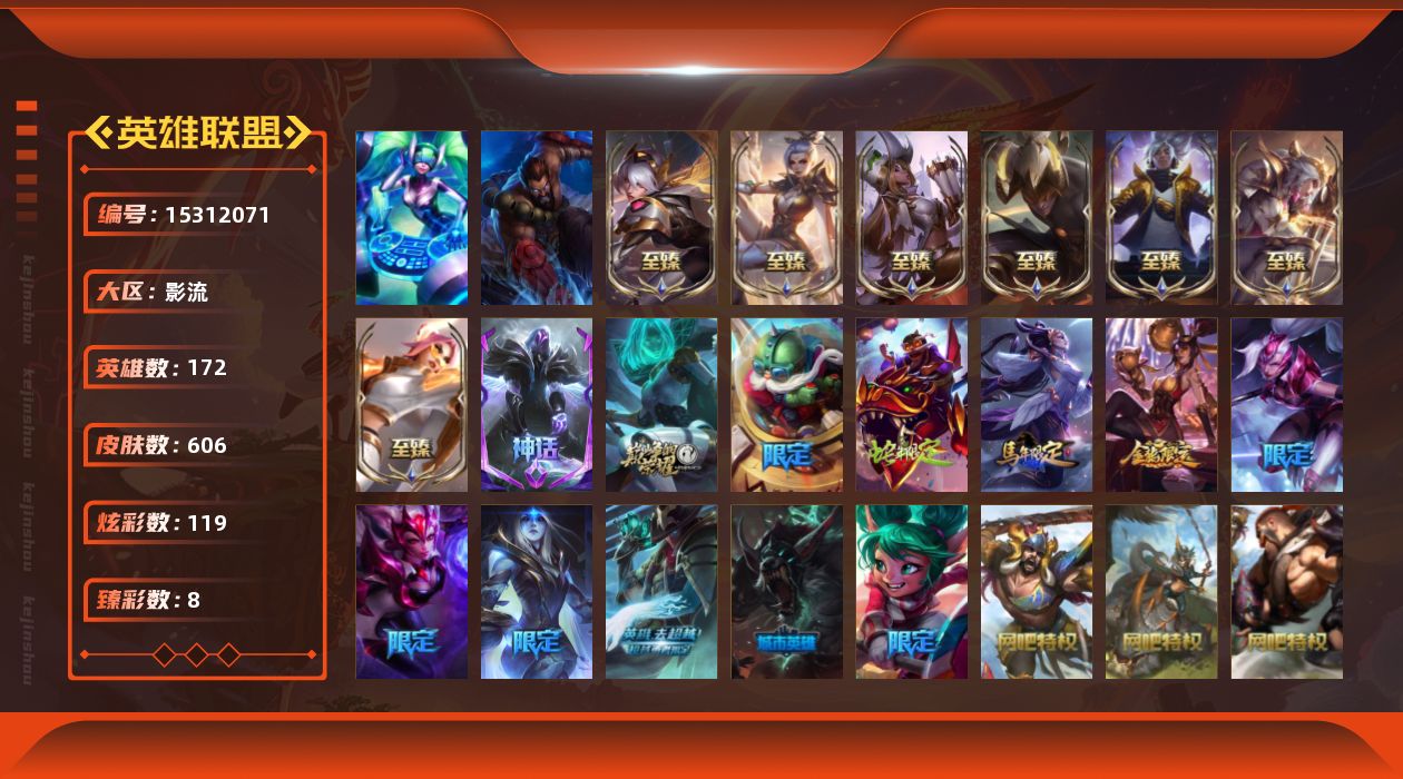 【256954】[15312071]t32366【影流】原皮龙瞎 606皮肤 119炫彩 8臻彩 14神话/86限定/58传说/172英雄 账号等级:586 单双排段位:青铜 【重要头像】KDA萨勒芬妮 伊纳 披萨鸡 送披萨的小姐姐希维尔 战斗学院伊泽瑞尔 至臻福牛守护者菲奥娜 【重要皮肤】女帝黛安娜至臻 真实伤害亚索至臻 福牛守护者菲奥娜至臻 魅惑女巫厄运小姐至臻 魅惑女巫厄运小姐2022至臻