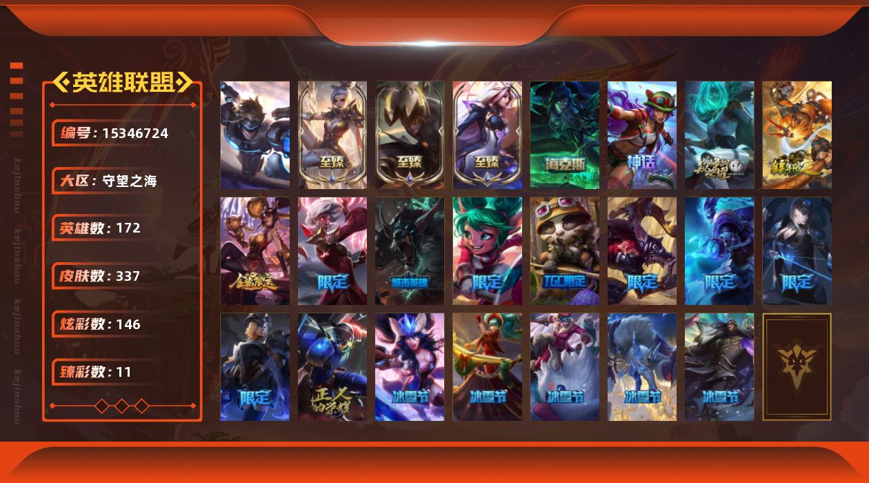 【263356】[15346724]t32698【守望之海】337皮肤 146炫彩 11臻彩 7神话/40限定/31传说/172英雄 账号等级:552段位钻石 【重要头像】爱意绵绵 两仪无极 万圣节卡特琳娜 KDA萨勒芬妮 星守金克丝炫彩 灵魂莲华崔丝塔娜炫彩 幼犬内瑟斯 烈焰美人薇恩 【重要皮肤】绝息圣堂厄运小姐至臻 玉剑传说武剑仙至臻 黑夜使者李青至臻 摄魂使者薇恩 胜利剑圣易 胜利女神娑娜