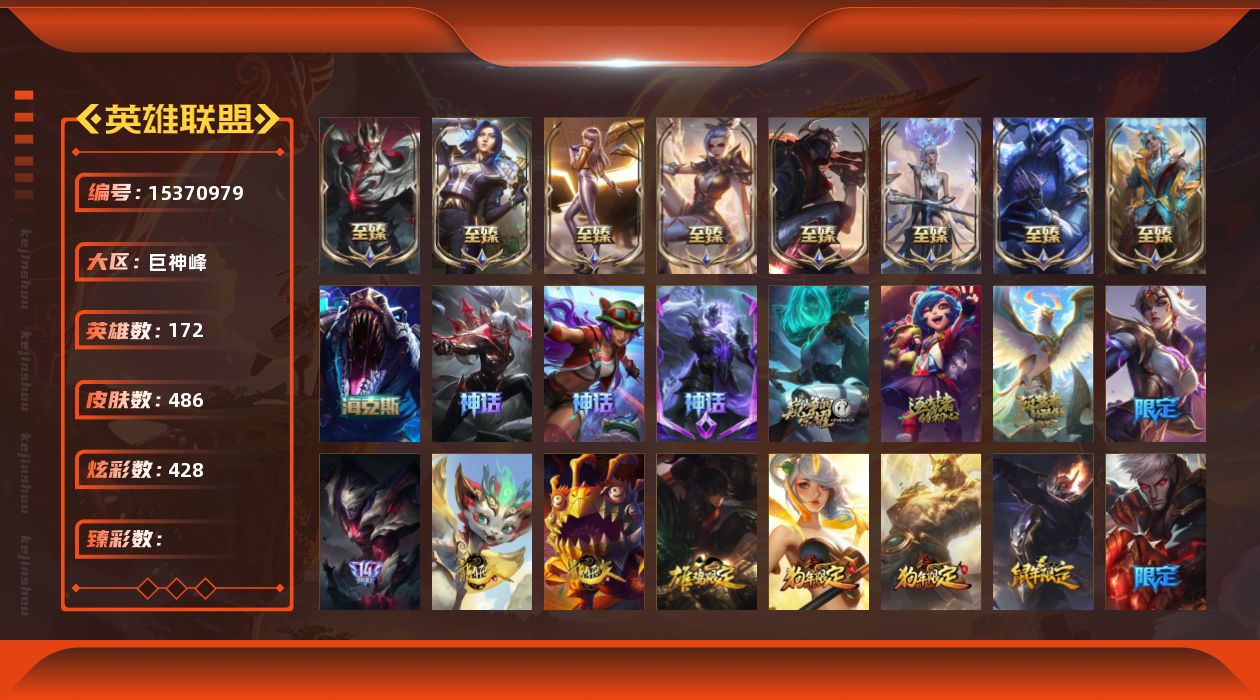 【267402】[15370979]16神话 88限定 39传说 90史诗 486皮肤 428炫彩 172英雄 可二次 可修改实名 【至臻】:至臻 天龙之子 伊泽瑞尔,至臻 DRX 亚托克斯,至臻 双城之战2 指挥官 凯特琳,至臻 K/DA 卡莎,至臻 玉剑传说 武剑仙,至臻 西部魔影 泰隆,至臻 海珀利安小队 迦娜【海克斯】:海克斯 雷克顿【限定】:玉剑传说 星仙子,双城之战2 幸存者 杰斯,