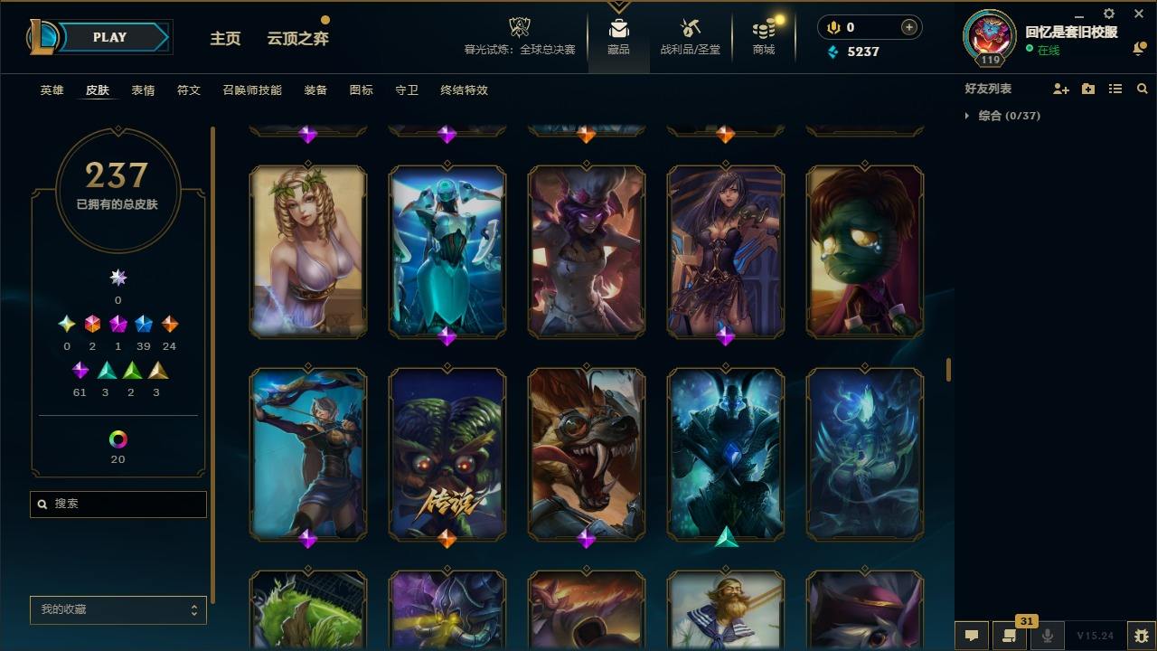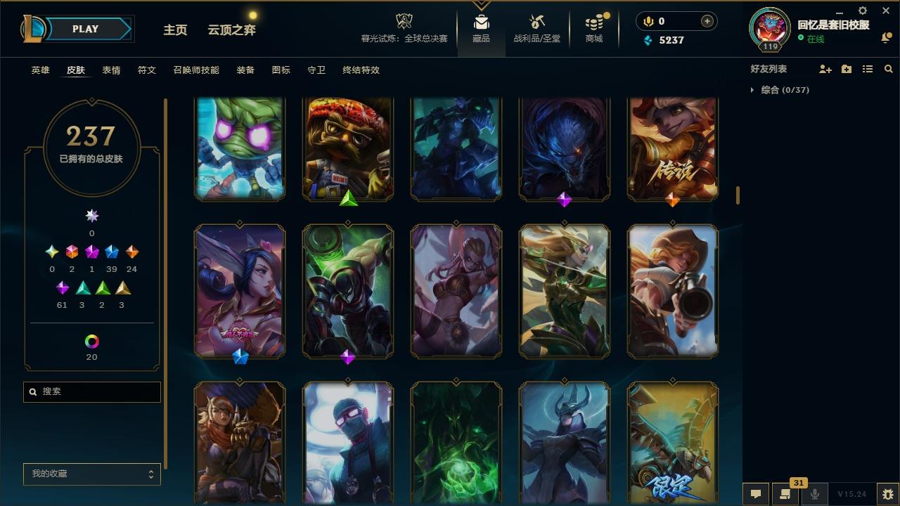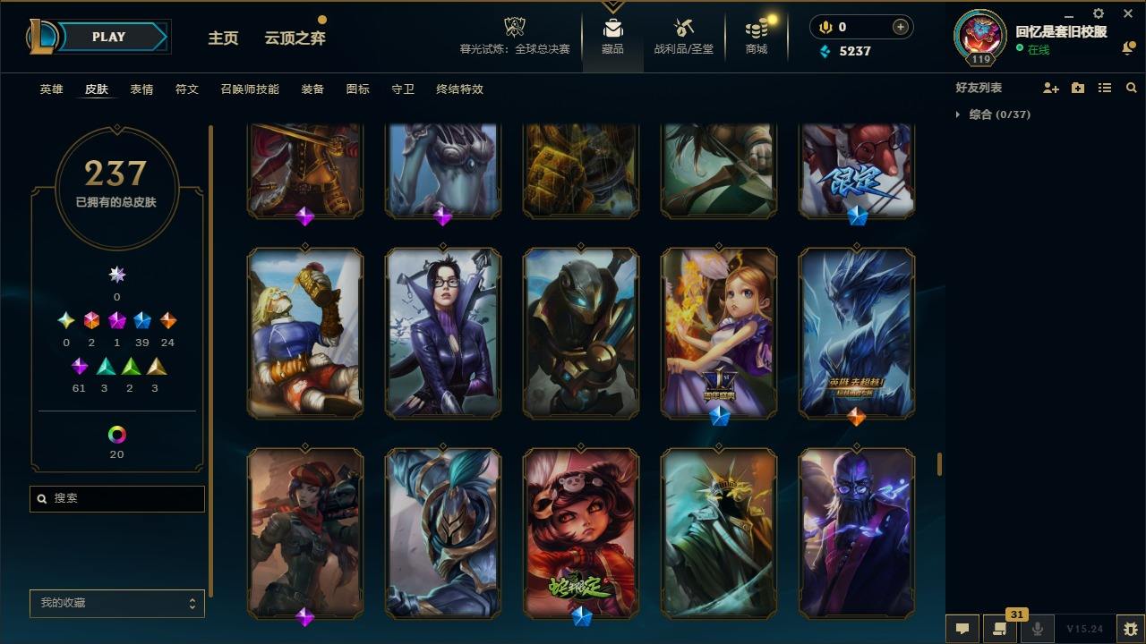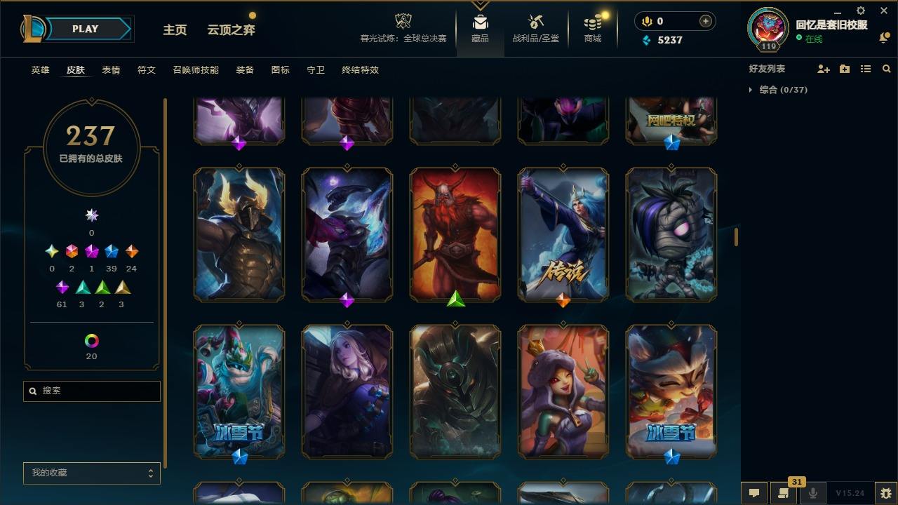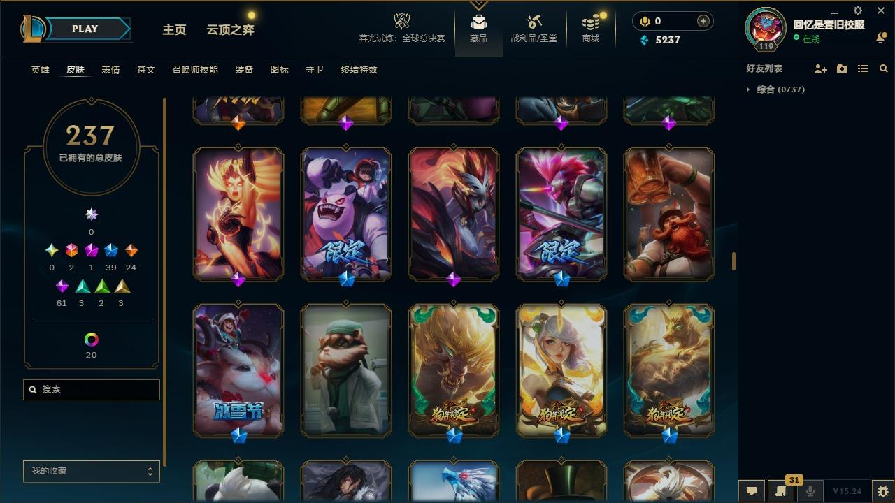 【267437】[15371101]2终极 1神话 39限定 24传说 61史诗 237皮肤 20炫彩 92英雄 可二次 可修改实名 【限定】舞会公主 安妮【情人节限定】甜心之羽 霞【赛季限定皮】胜利之树 茂凯,胜利枪神 格雷福斯【冠军限定系列】S1FNC 迦娜,S2 暗杀星 蒙多,S2 暗杀星 努努,S3 SKT T1 劫,S4 SSW 图奇,S5 SKT T1 阿兹尔【冰雪节限定】冬季仙境