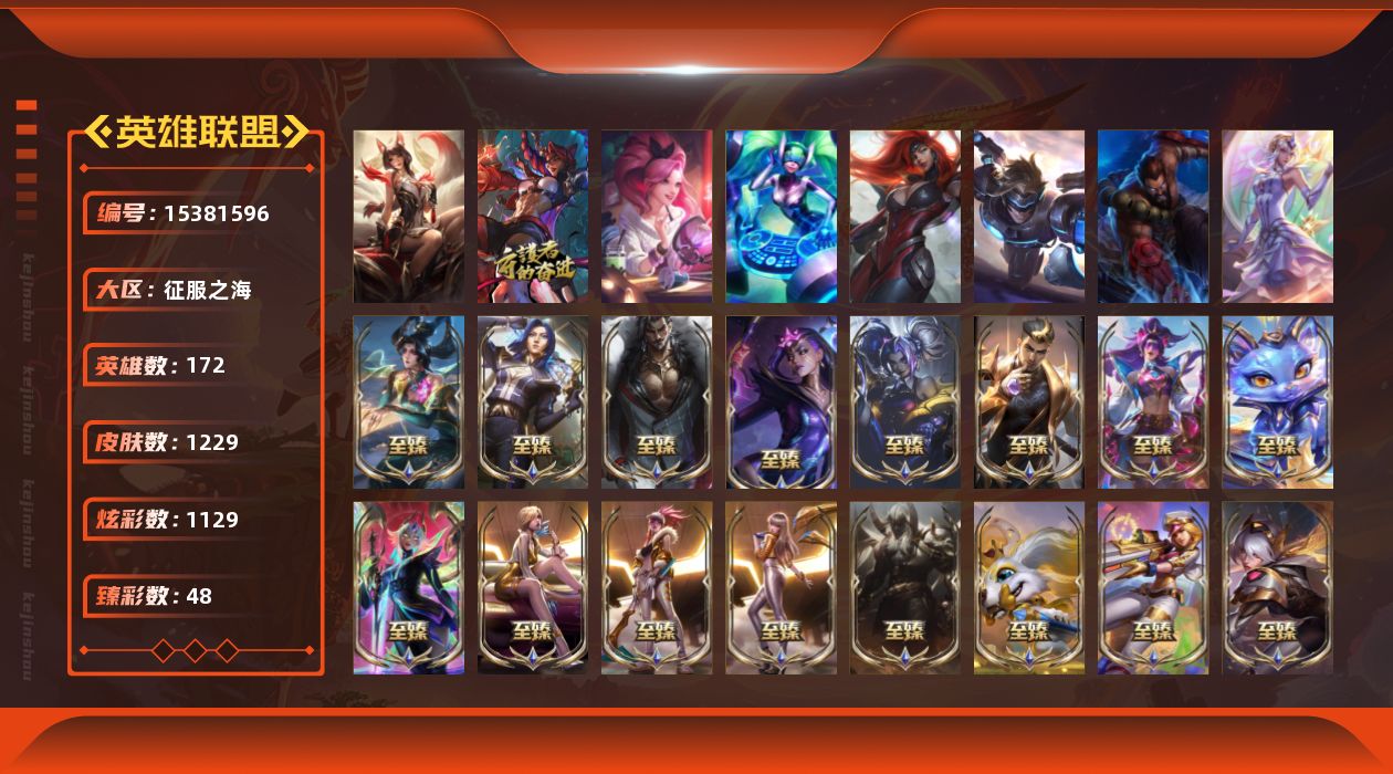 【269380】[15381596]t33793【征服之海】殿堂传奇阿狸 1229皮肤 1129炫彩 48臻彩 128神话/222限定/117传说/172英雄 账号等级:1786 云顶神话:4【重要头像】云顶战斗学院伊泽瑞尔 云顶古琴娑娜 云顶星守阿卡丽 爱意绵绵 爱情鸽 爱情之歌 觅心之翼奎因 萨勒芬妮超级巨星 萨勒芬妮独立音乐人 卡特琳娜的匕首 春晖神女拉克丝 玉剑传说