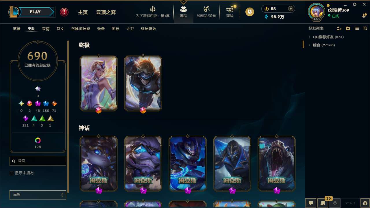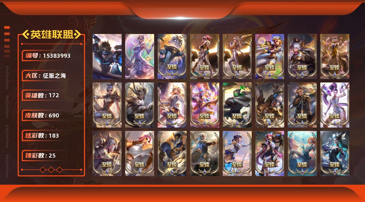 【270016】[15383993]t33825【征服之海】 690皮肤 183炫彩 25臻彩 43神话/159限定/71传说/172英雄 账号等级:463 云顶神话:1【重要头像】拓蛙 雪花 春晖神女拉克丝 青花瓷拉克丝 阿兰 星守卡莎 EDG厄斐琉斯 EDG佛耶戈 EDG格雷福斯 EDG悠米 EDG佐伊 星守金克丝炫彩 青花瓷伊泽瑞尔 北极星神黛安娜 北极星神黛安