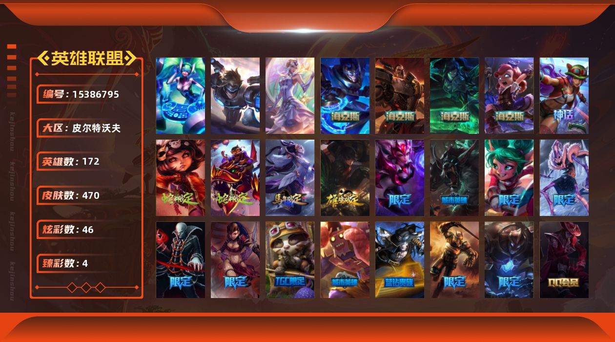 【270551】[15386795]t33780 皇冠账号【皮尔特沃夫】原皮龙瞎 470皮肤 46炫彩 4臻彩 6神话/93限定/45传说/172英雄 账号等级:890【重要头像】勇者阿狸炫金 星守金克丝炫彩 真实伤害阿卡丽炫彩 真实伤害赛娜炫彩 【重要皮肤】海克斯科技安妮 海克斯科技嘉文四世 恐惧新星德莱厄斯 摄魂使者薇恩 胜利女神娑娜 胜利之王泰达米尔 胜利巨口克格莫