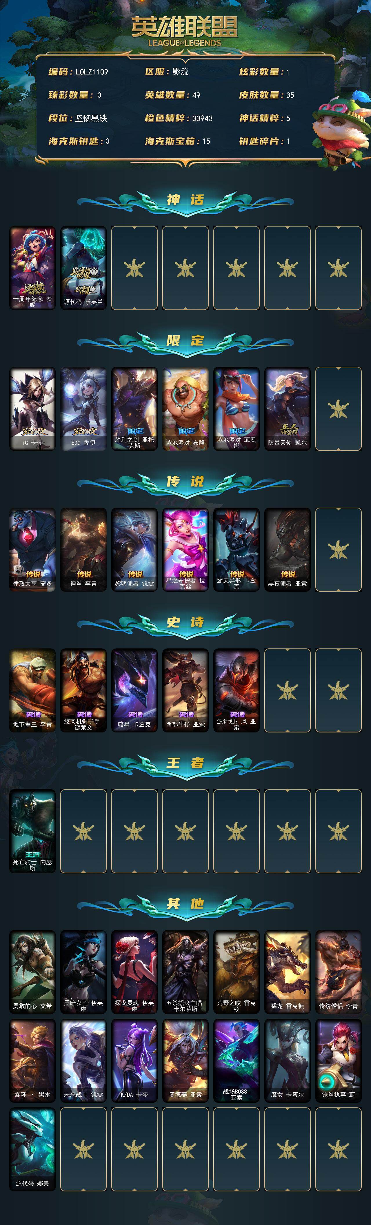 【270707】【LOLZ1109】49英雄/35皮肤/2神话/6限定/1炫彩/6传说/5史诗/未定级账号等级:110/十周年纪念安妮/源代码乐芙兰/IG卡莎/EDG佐伊/胜利之剑亚托克斯/泳池派对布隆/泳池派对菲奥娜/防暴天使凯尔/律政大亨蒙多/神拳李青/黎明使者锐雯/星之守护者拉克丝/霸天异形卡兹克/黑夜使者亚索/地下拳王李青/绞肉机侩子手德莱文/暗星卡兹克/西部牛仔亚索/源代码:风亚索/死