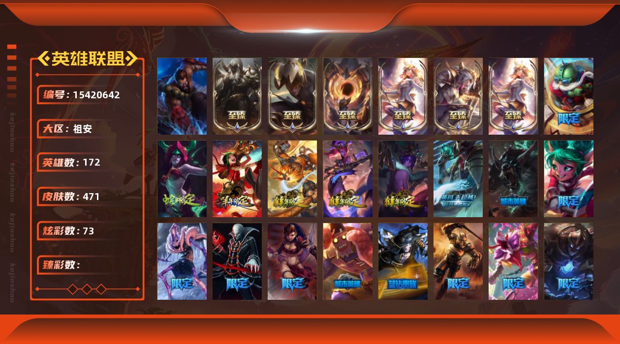 【277227】[15420642]t33925【祖安】 471皮肤 73炫彩 6神话/89限定/41传说/172英雄 账号等级:147 单双排段位:铂金【重要头像】女巫头 卡特琳娜的匕首 魅惑女巫厄运小姐 糖果大战伊芙琳炫彩 至臻女帝黛安娜 至臻星之守护者索拉卡 【重要皮肤】女帝黛安娜至臻 星之守护者索拉卡至臻 暗星墨菲特至臻 腥红之月亚托克斯至臻 黑夜使者李青至臻 胜利