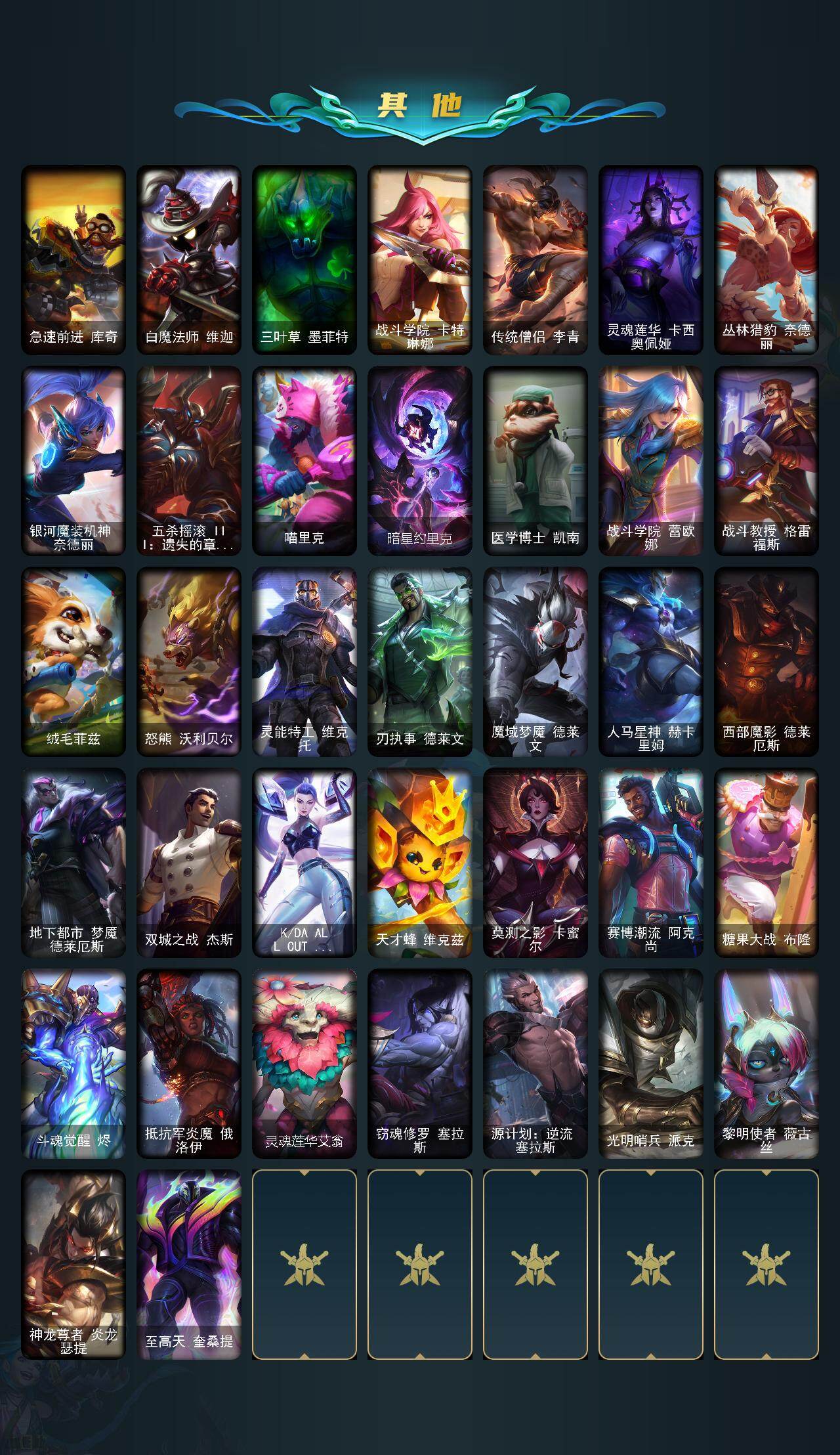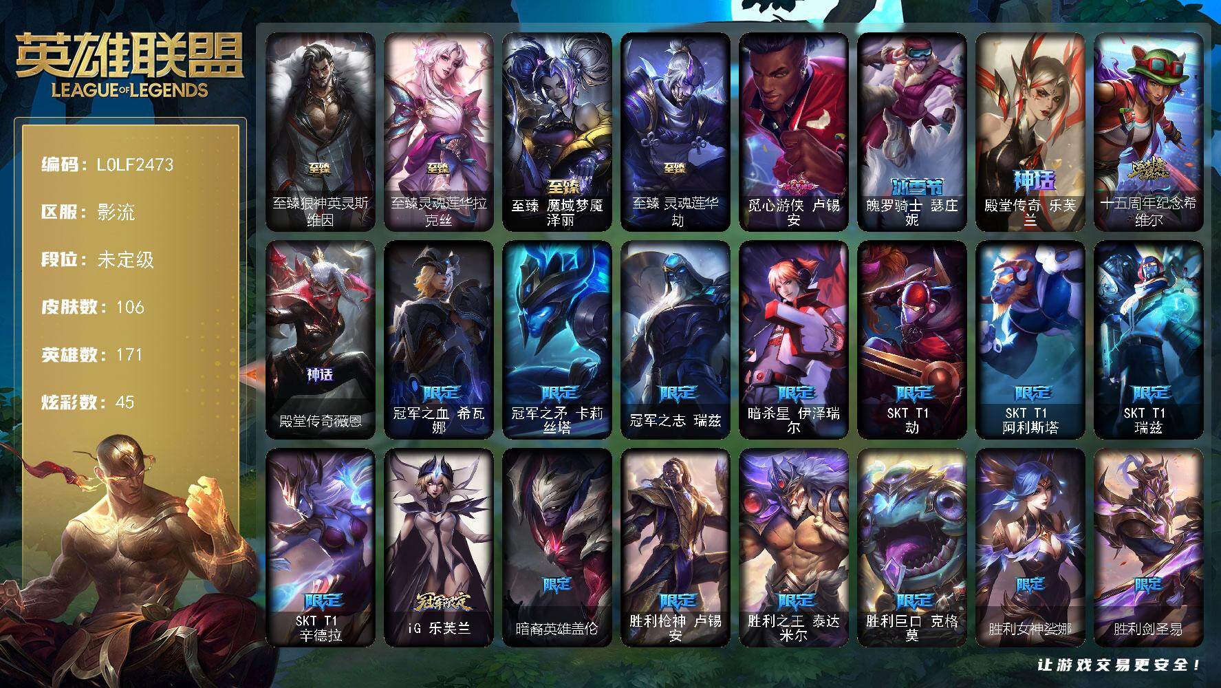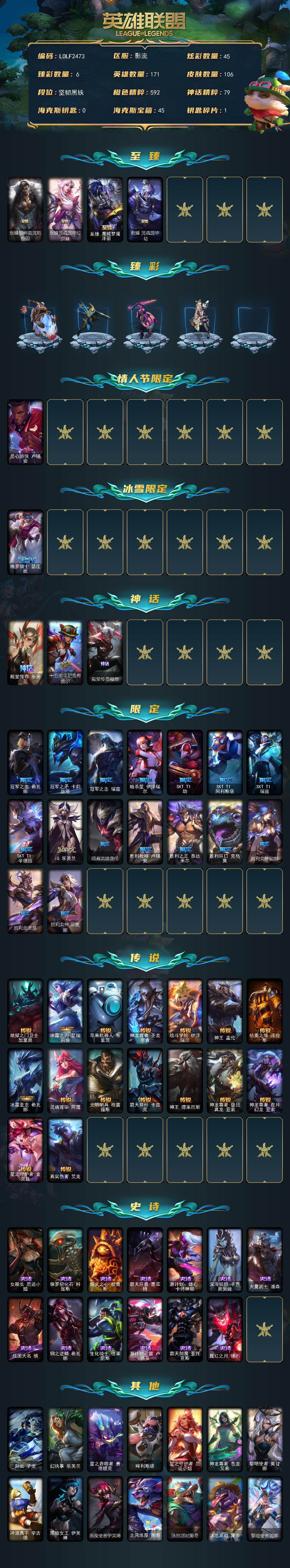 【280420】【LOLF2473】171英雄/106皮肤/7神话/19限定/6臻彩/45炫彩/16传说/13史诗/未定级/至臻狼神英灵斯维因/至臻灵魂莲华拉克丝/至臻魔域梦魇泽丽/至臻灵魂莲华劫/无畏骑士瑟庄妮赤子初心/冠军之矛卡莉丝塔凯旋圣装/源计划毁灭派克幻灭/咖啡甜心金克丝核桃巴菲/殿堂传奇乐芙兰登神/觅心游侠卢锡安/魄罗骑士瑟庄妮/殿堂传奇乐芙兰/十五周年纪念希维尔/殿堂传奇薇恩/冠军