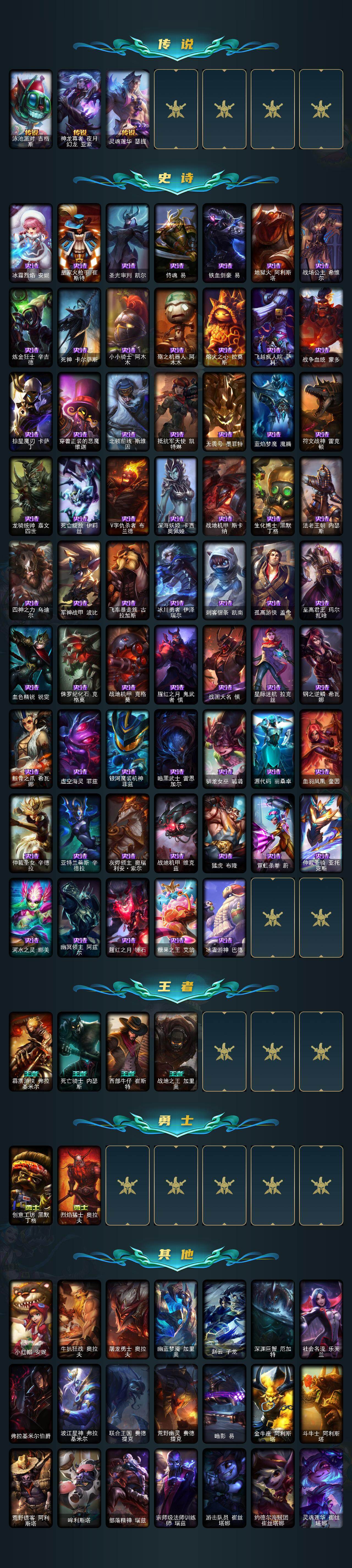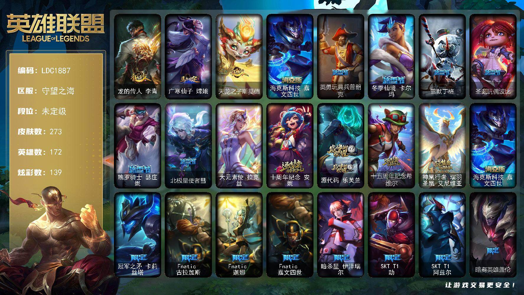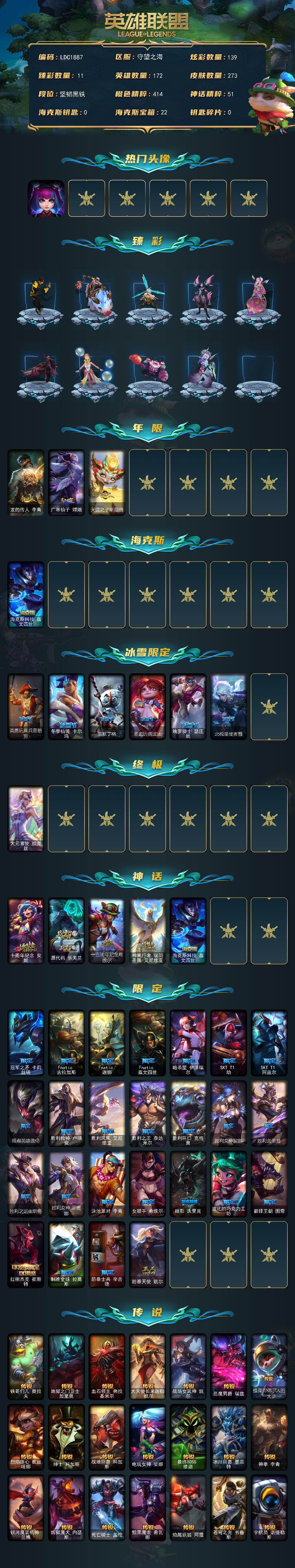 【280718】【LDC1887】172英雄/273皮肤/1终极/5神话/34限定/11臻彩/139炫彩/24传说/61史诗/未定级/银河魔装机神安妮/龙的传人李青飞龙在天/无畏骑士瑟庄妮赤子初心/冰霜之刃艾瑞莉娅炫金/弹幕天使卡莎炽天使勇敢/星之守护者奥莉安娜未来之光/星之守护者萨勒芬妮未来之光/西部天使赛娜贝利尔之怠/泳池派对辛德拉荔枝枝连击/可爱可爱粉红红布里茨/魔女阿卡丽虚荣/净雪之月莫