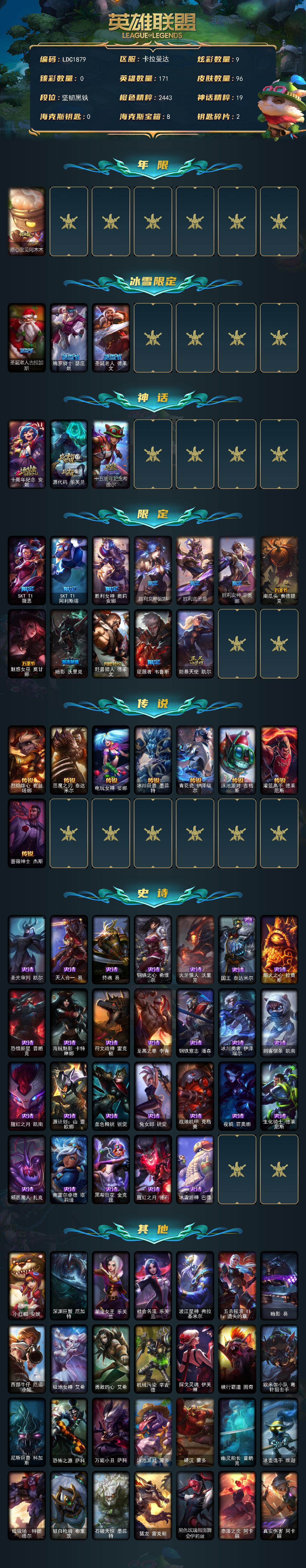 【280721】【LDC1879】171英雄/96皮肤/3神话/16限定/9炫彩/8传说/26史诗/未定级/点心宝贝阿木木/圣诞老人古拉加斯/魄罗骑士瑟庄妮/圣诞老人德莱文/十周年纪念安妮/源代码乐芙兰/十五周年纪念希维尔/SKTT1薇恩/SKTT1阿利斯塔/胜利女神奥莉安娜/胜利女神娑娜/胜利剑圣易/胜利女神菲奥娜/南瓜头费德提克/魅惑女巫莫甘娜/暗影妖狐阿狸/野兽猎人德莱文/征服者韦鲁斯/防
